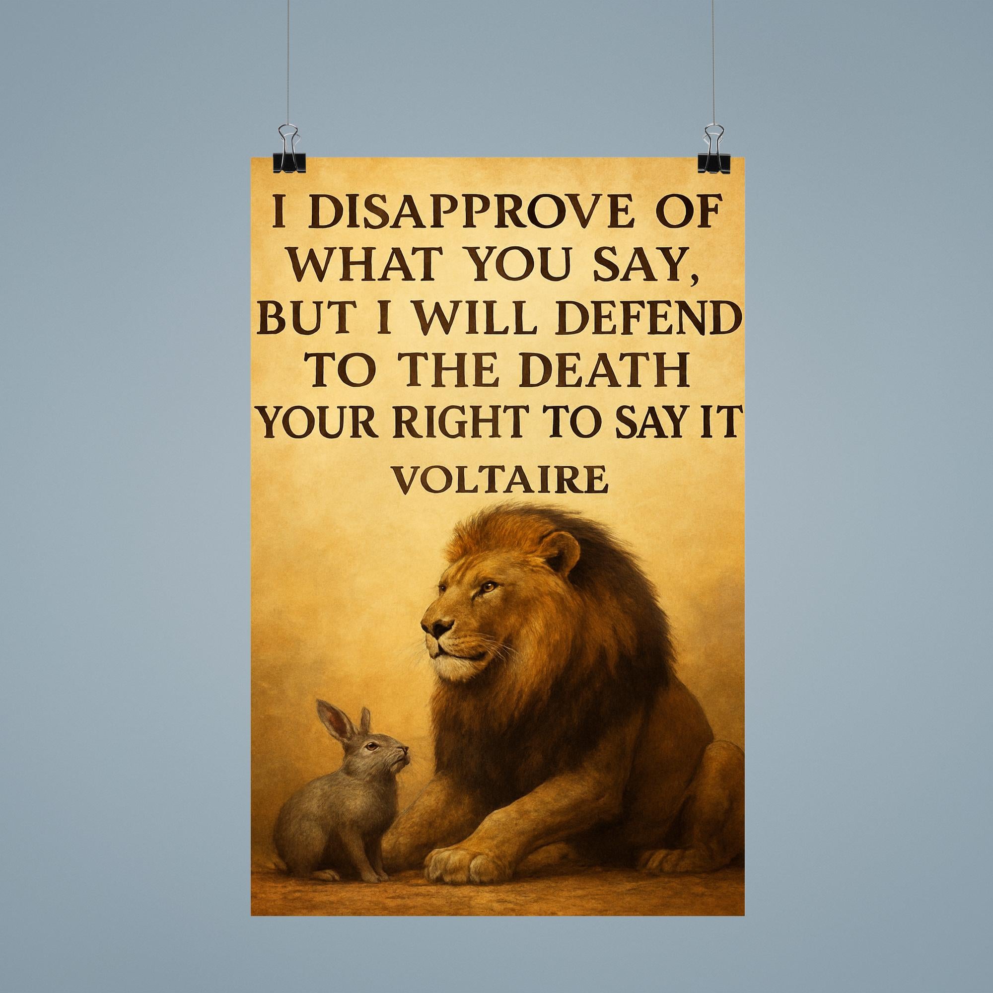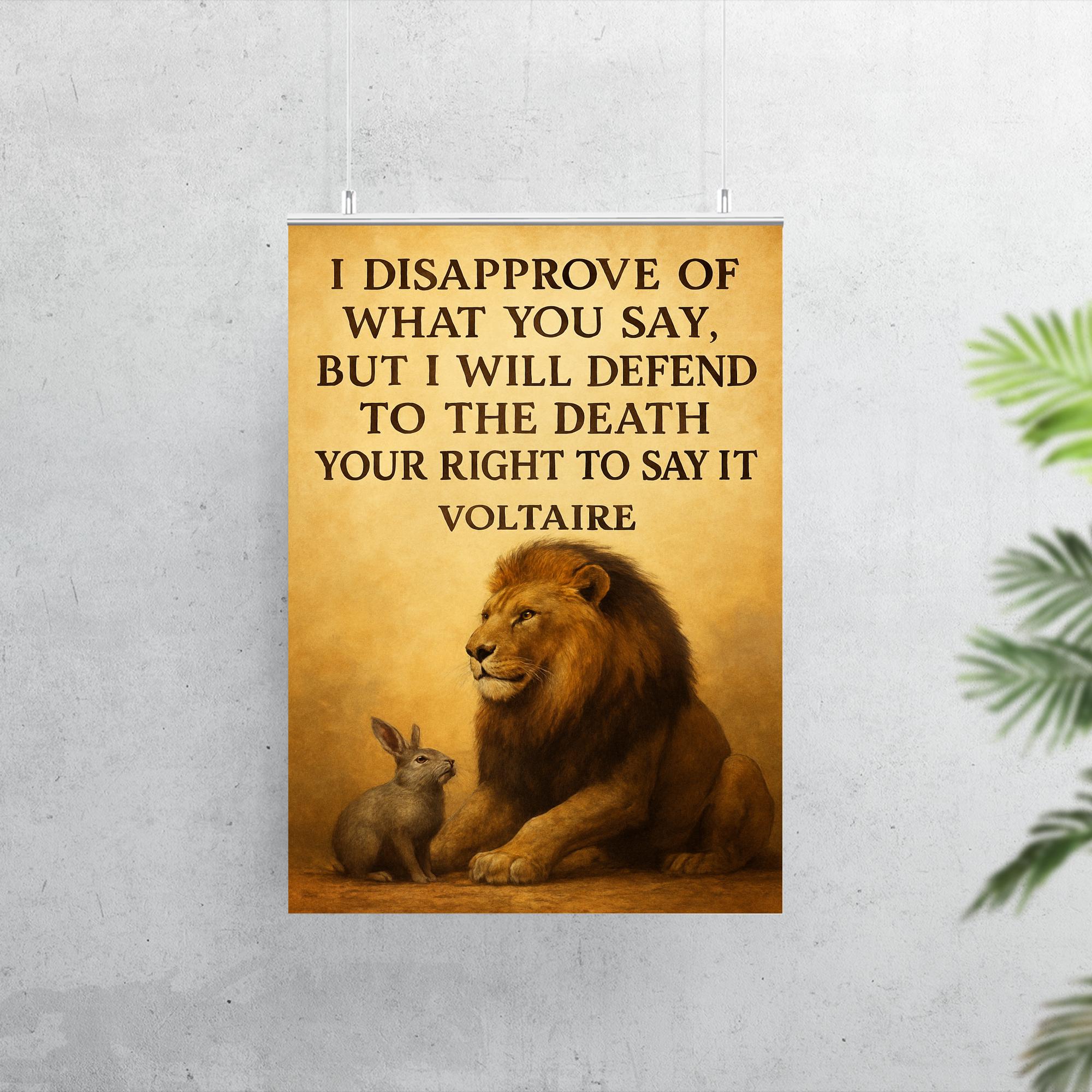 Make a bold statement with this powerful poster featuring the iconic quote, “Defend the right to speak.” A lion stands as a timeless symbol of courage and protection, inspiring you to champion the voices that need to be heard. Perfect for any space where passion for justice and fearless expression come alive.