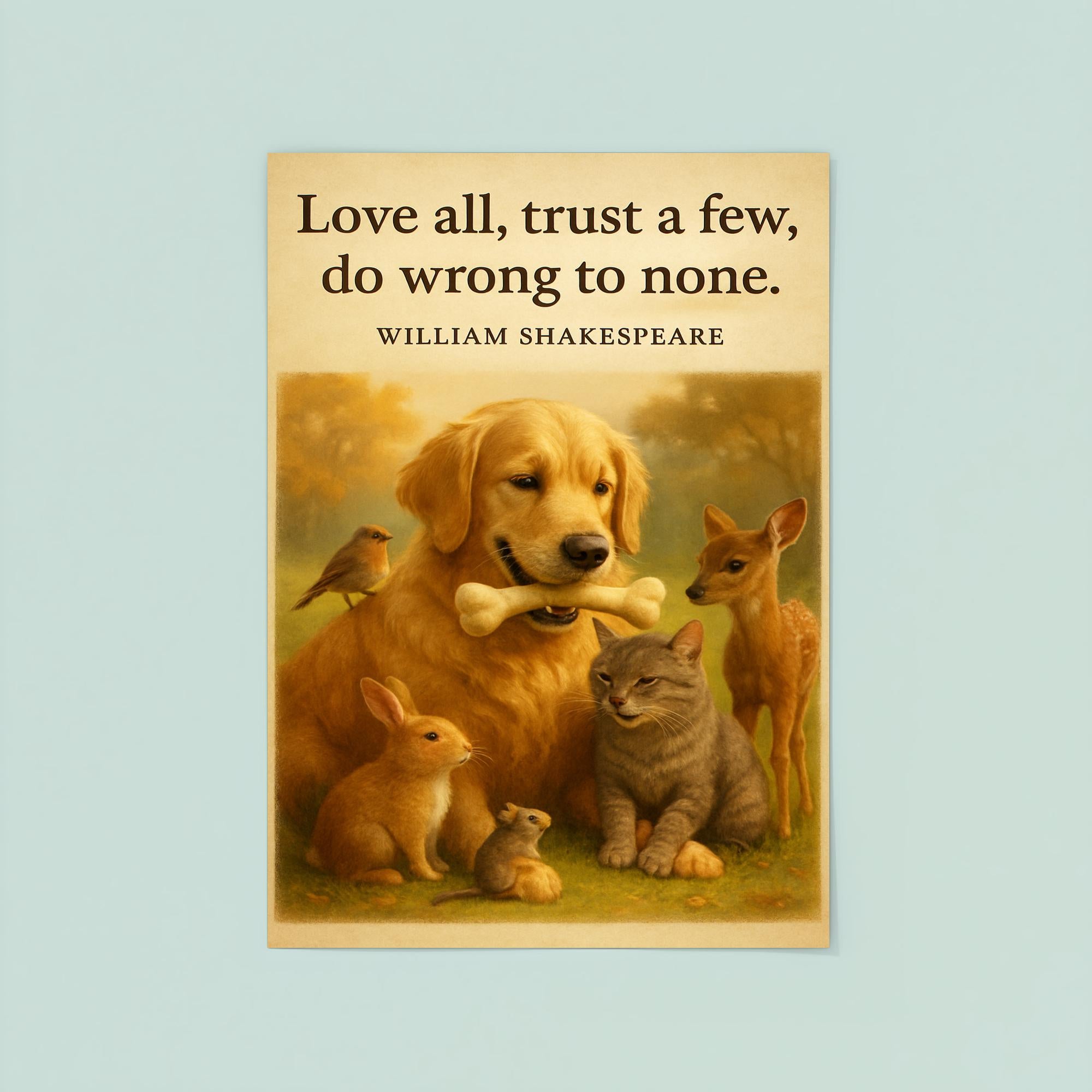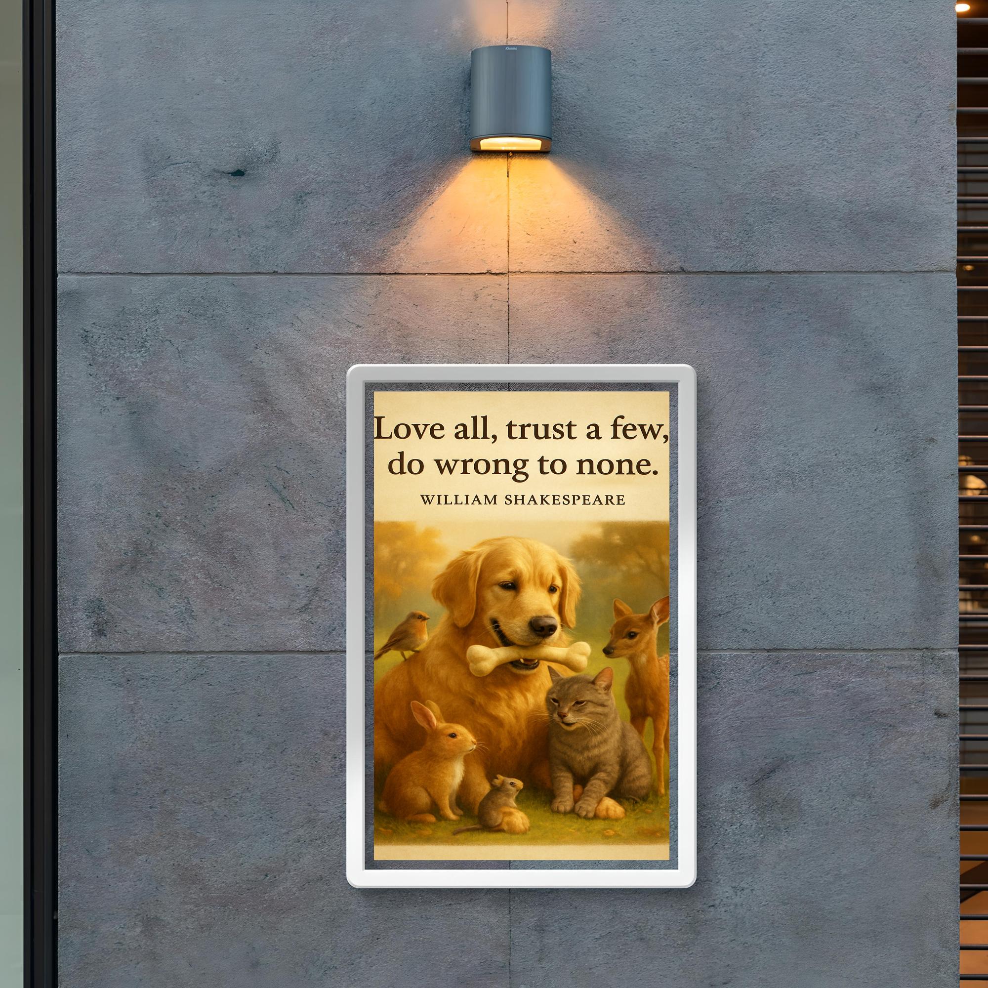 Celebrate the timeless wisdom of Shakespeare with this heartfelt poster featuring the inspiring quote: "Love all, trust a few, do wrong to none." Perfect for animal lovers and dog enthusiasts alike, it beautifully captures the spirit of kindness and integrity alongside the gentle charm of a golden retriever. A warm and thoughtful addition to any space, this poster reminds us to embrace love and trust while living with compassion.