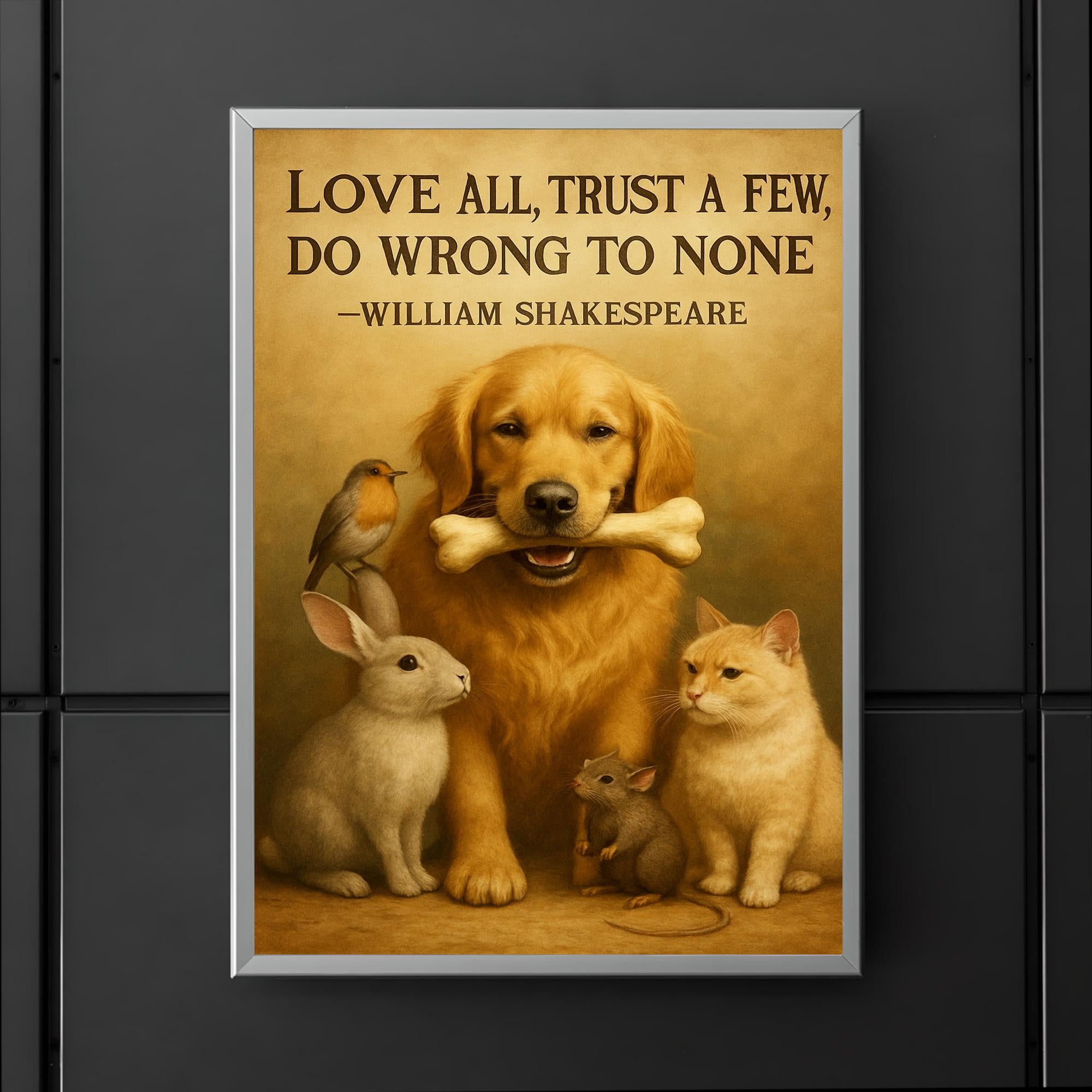 Celebrate timeless friendship and kindness with this charming poster featuring a golden retriever sharing a bone, paired with Shakespeare’s wise words: "Love all, trust a few, do wrong to none." Perfect for adding warmth and inspiration to any space, it’s a heartfelt reminder of loyalty and goodwill.