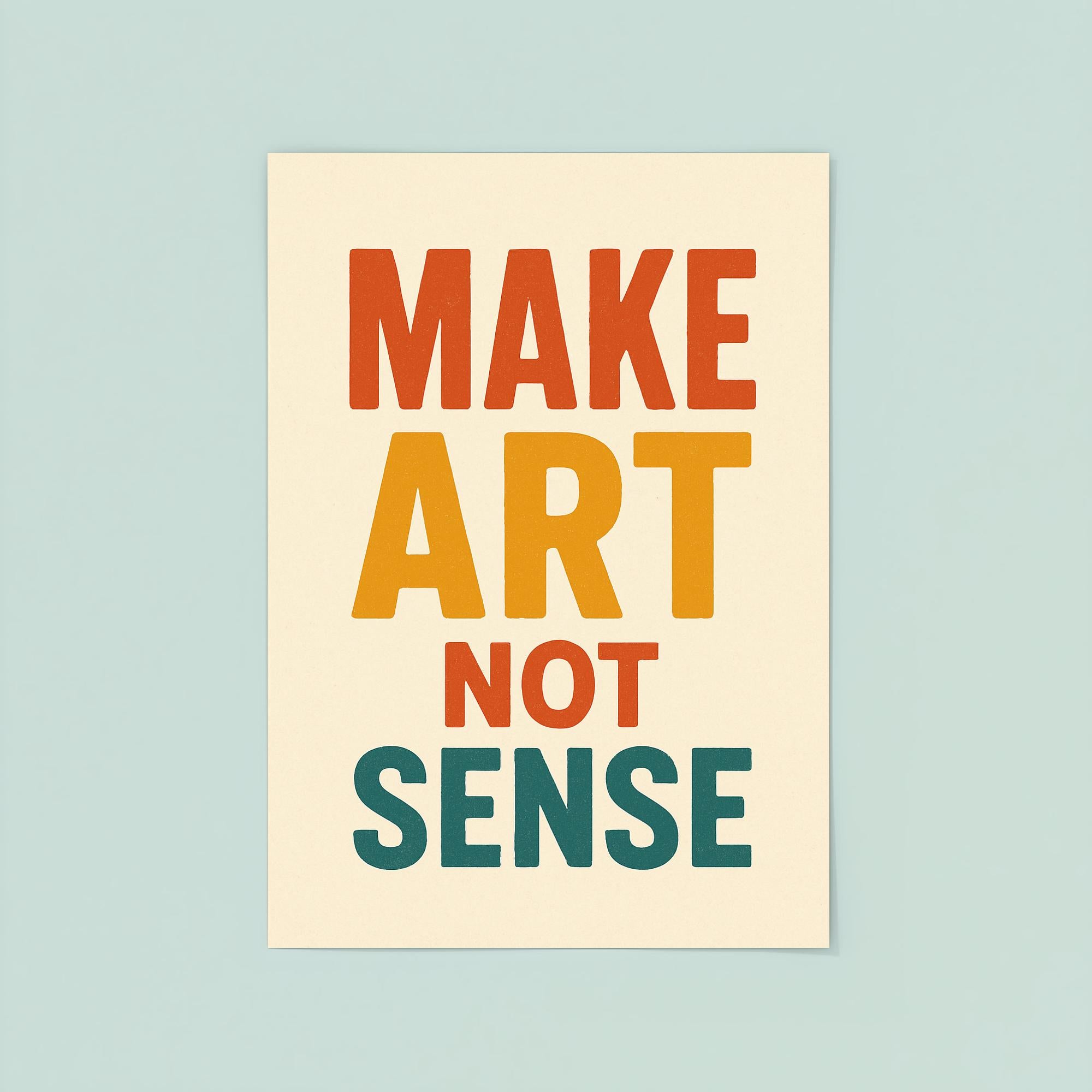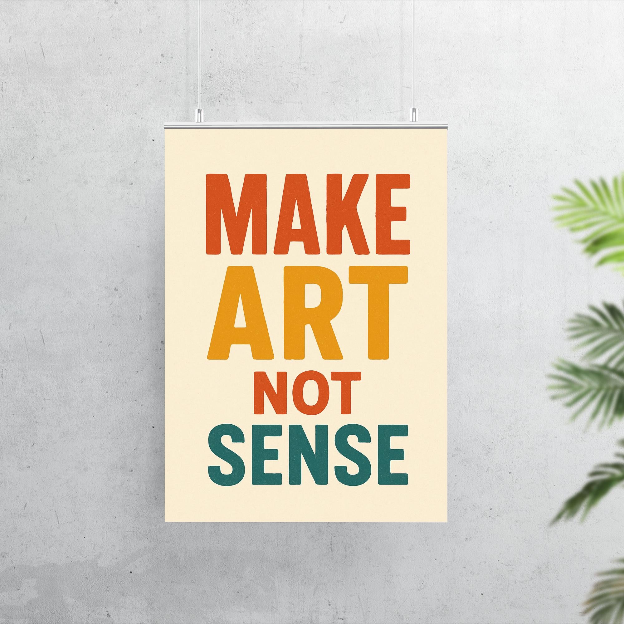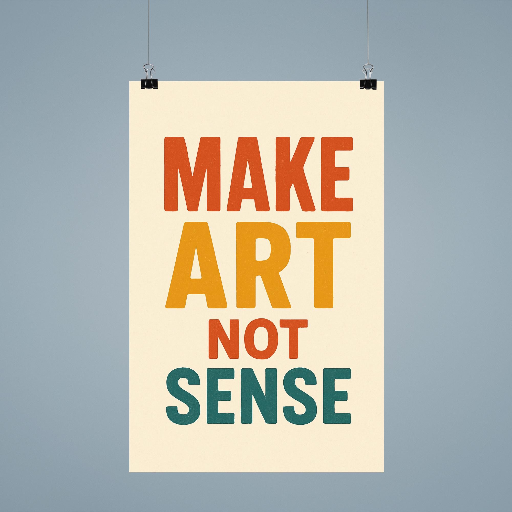 Challenge conventions and spark imagination with a "Make art not sense" poster. This bold statement serves as a daily reminder to embrace creativity, break free from the ordinary, and let inspiration lead the way. Perfect for anyone who believes in the power of ideas over logic, it makes a thought-provoking addition to any space.