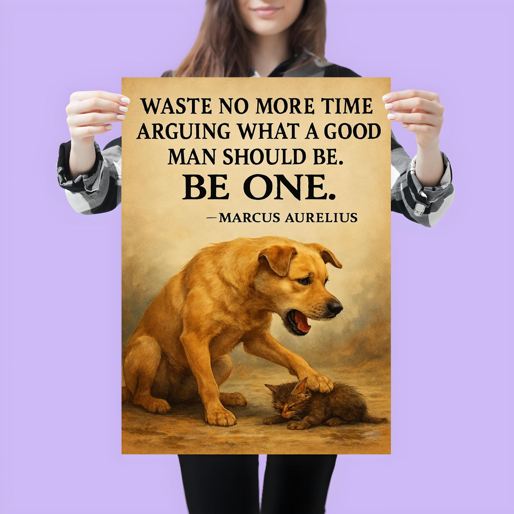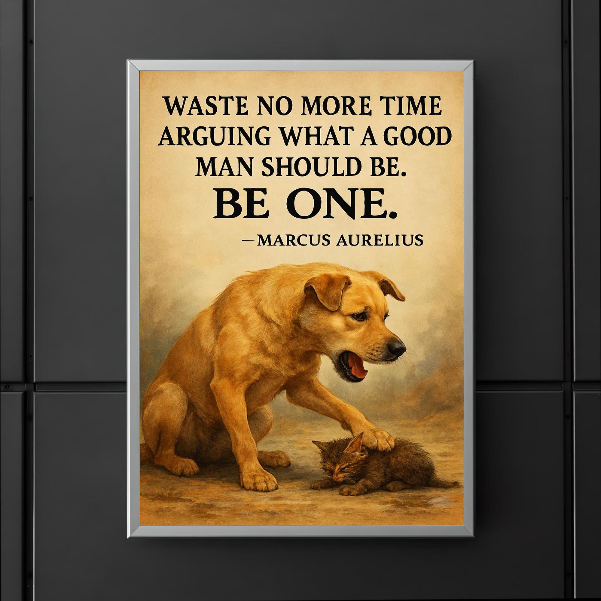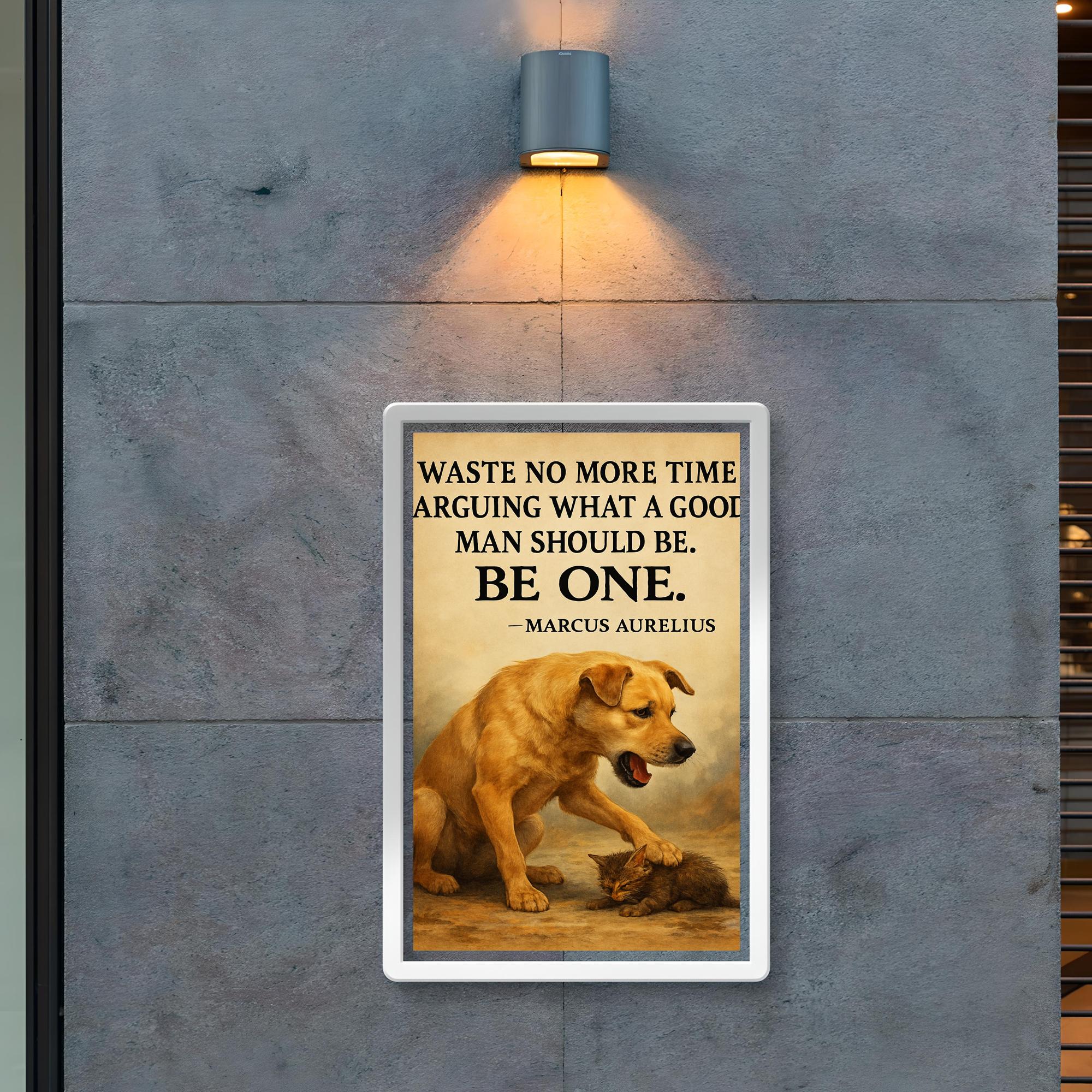 Embrace timeless wisdom with this inspiring Marcus Aurelius poster featuring the powerful reminder: "Waste no more time arguing what a good man should be. Be one." Perfect for any space where motivation and reflection are needed, this piece encourages action over words and thoughtful living every day. Let it inspire you to focus on what truly matters and lead with integrity.