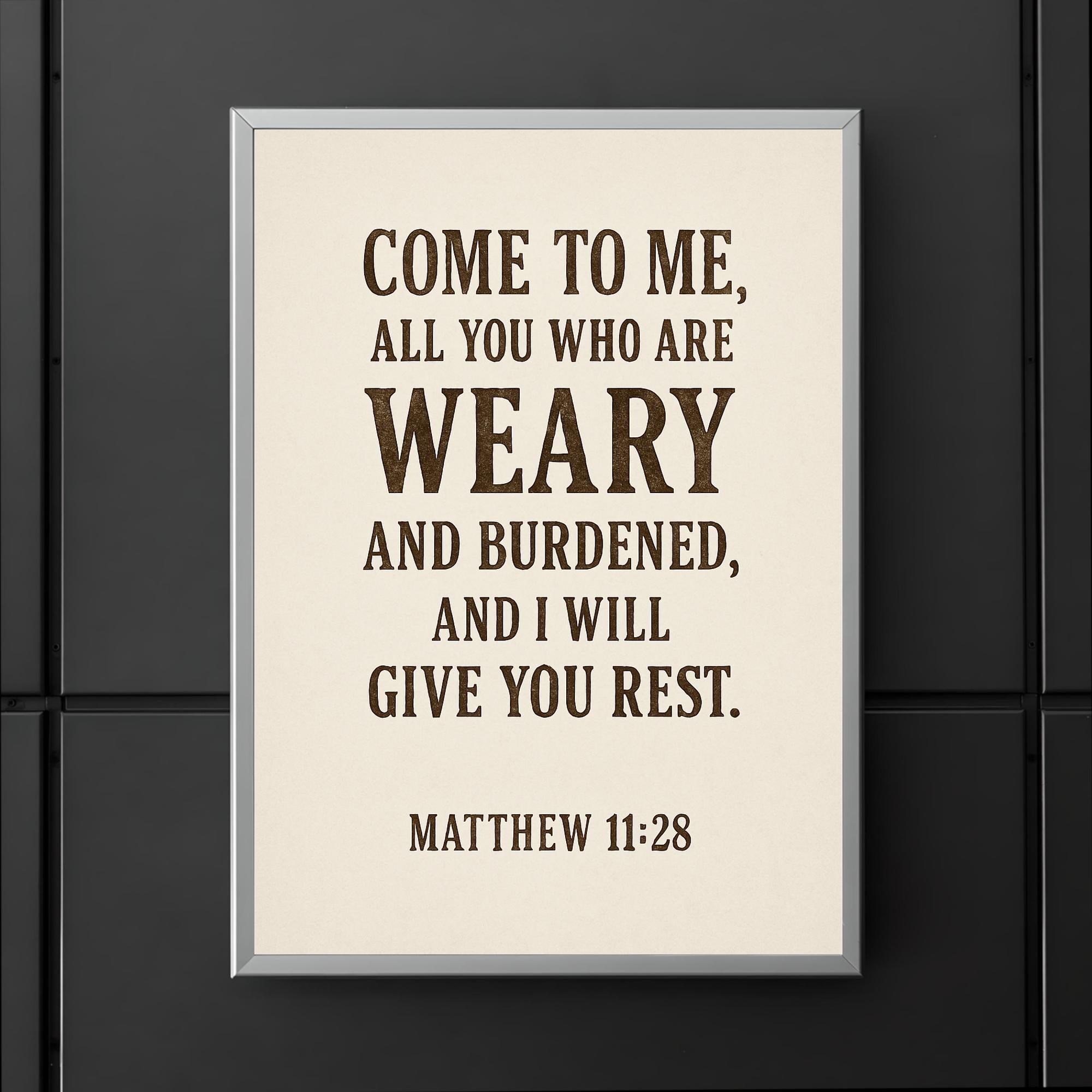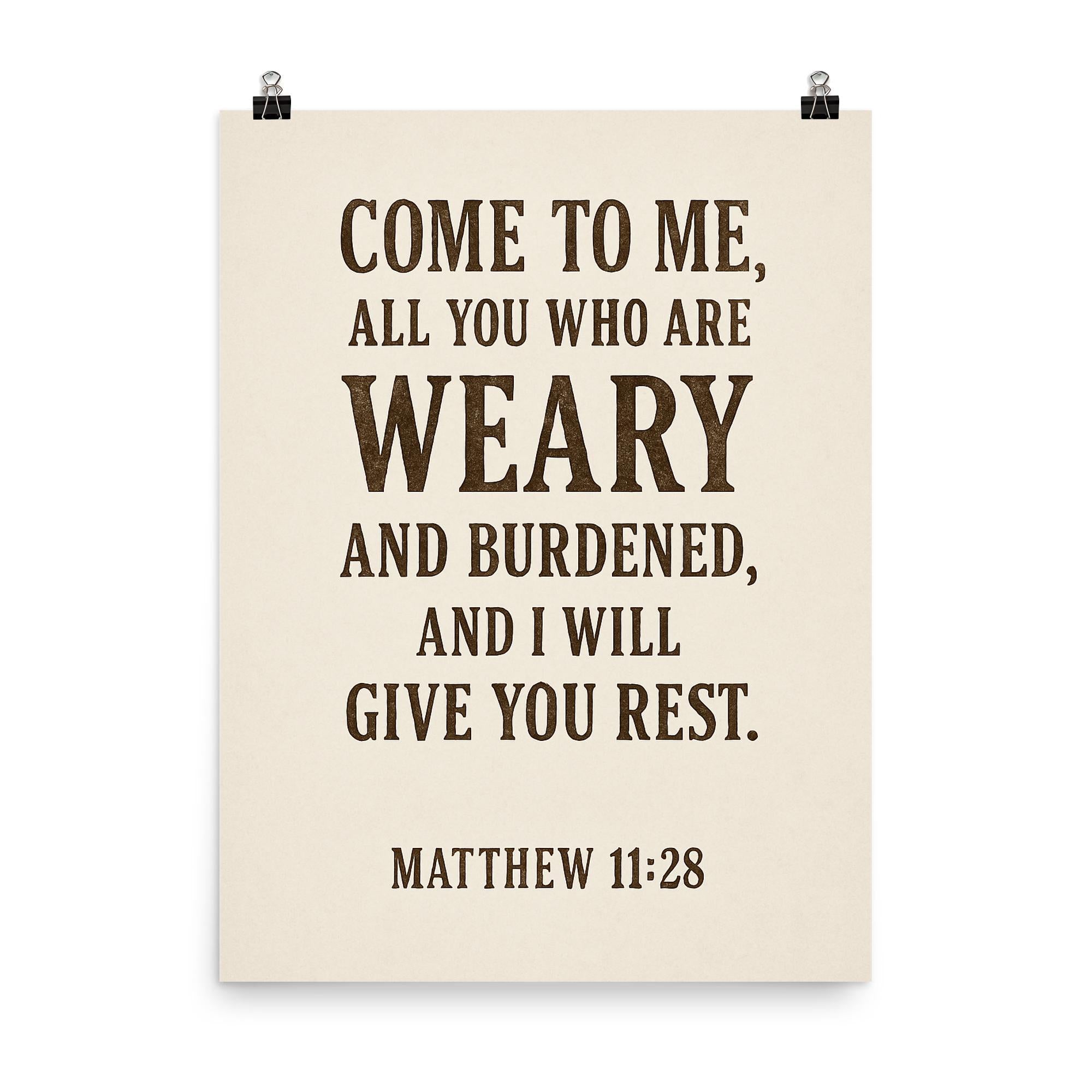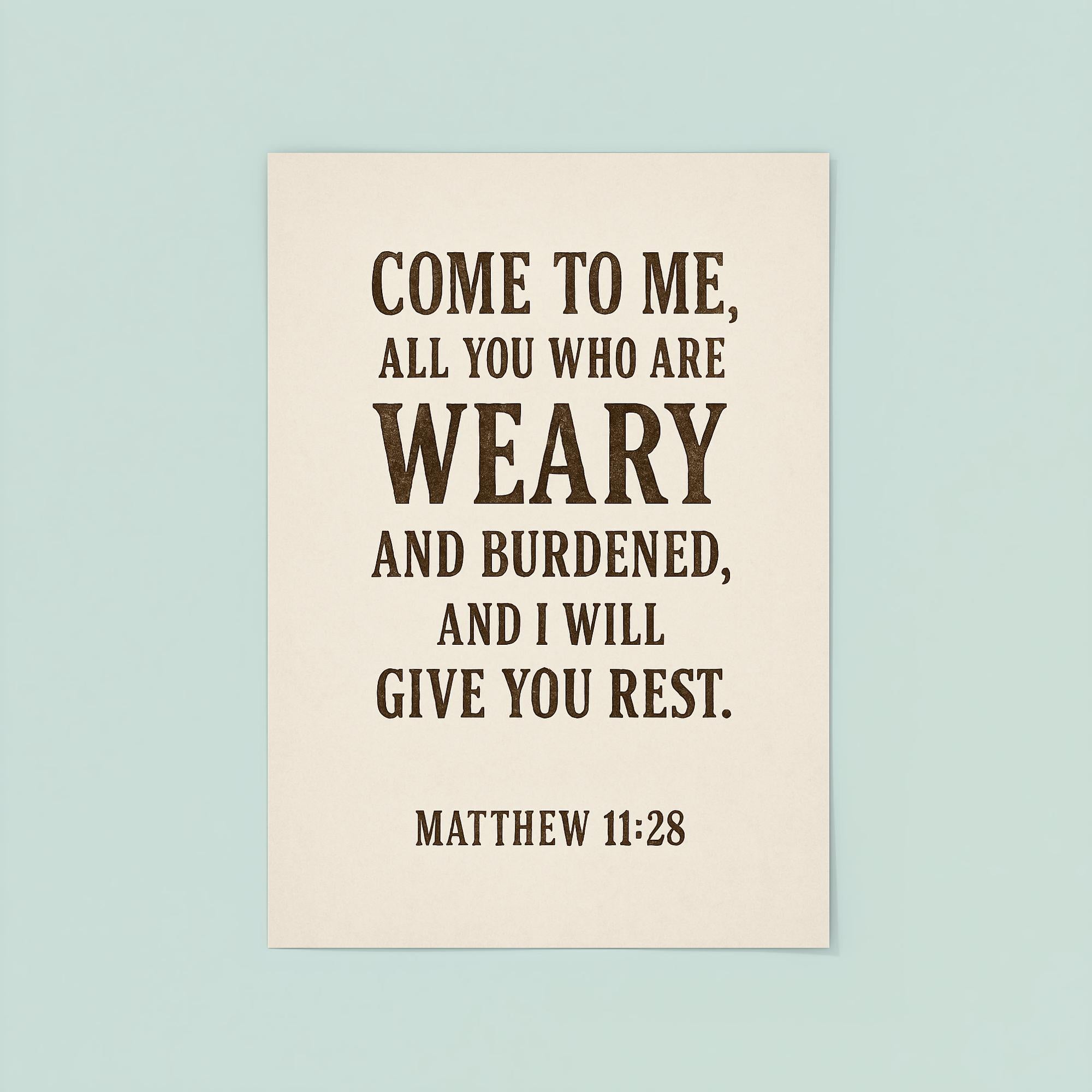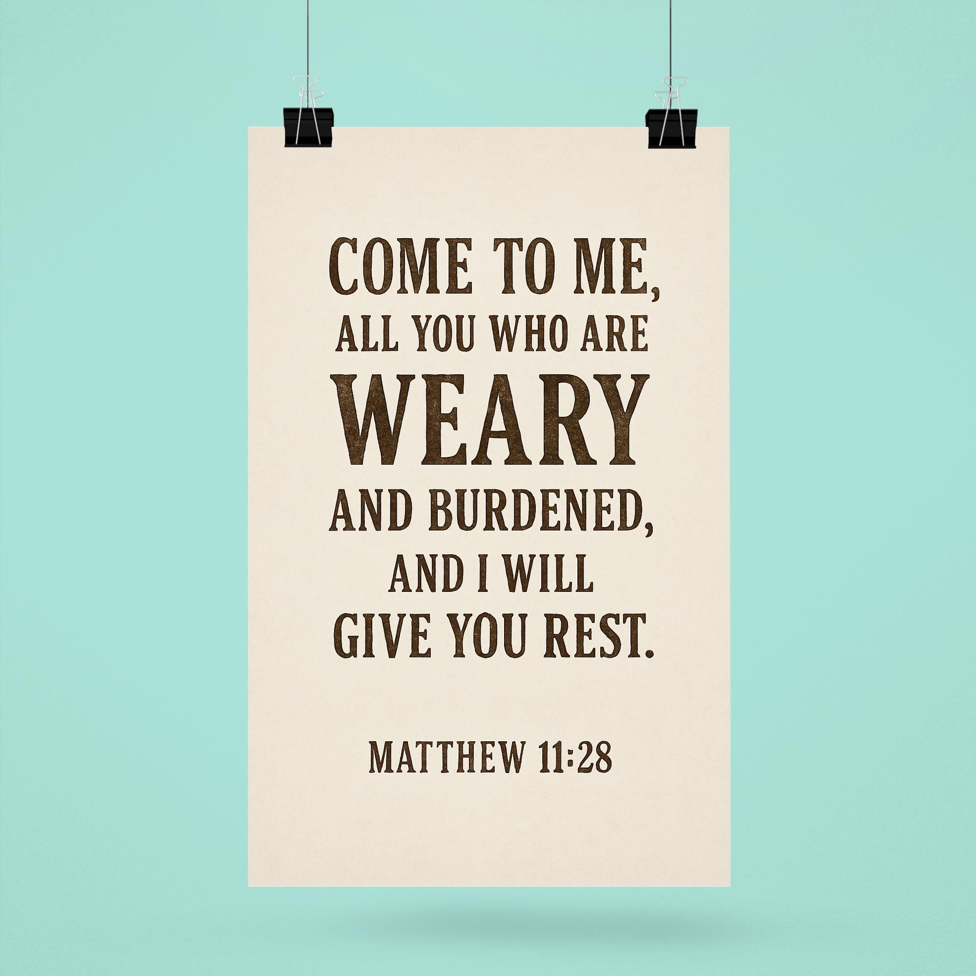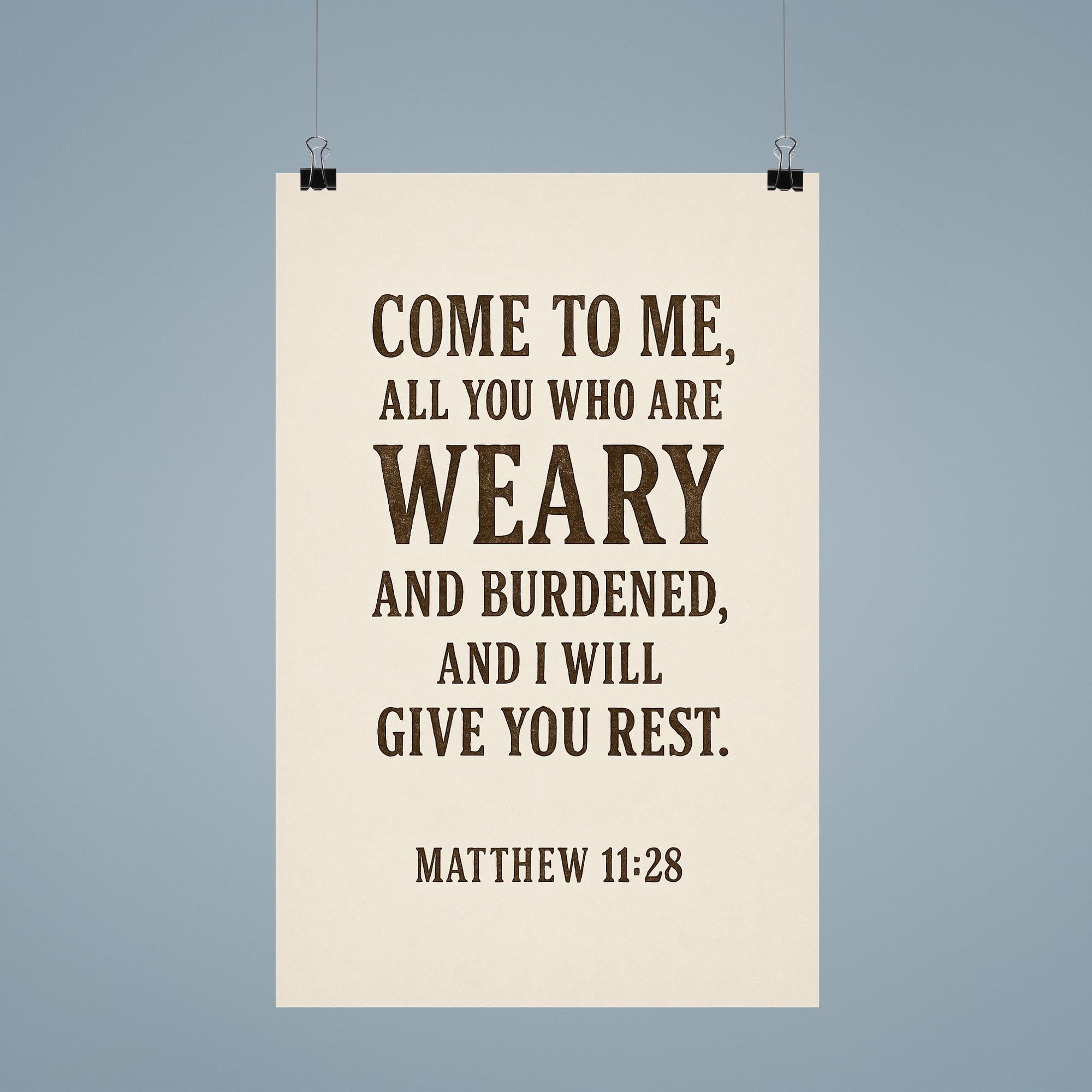 Find comfort and peace with this inspiring poster featuring Matthew 11:28: “Come to me, all you who are weary and burdened, and I will give you rest.” Perfect for any space where you seek encouragement and solace, it’s a daily reminder of hope and renewal. Let this timeless promise uplift your spirit every day.