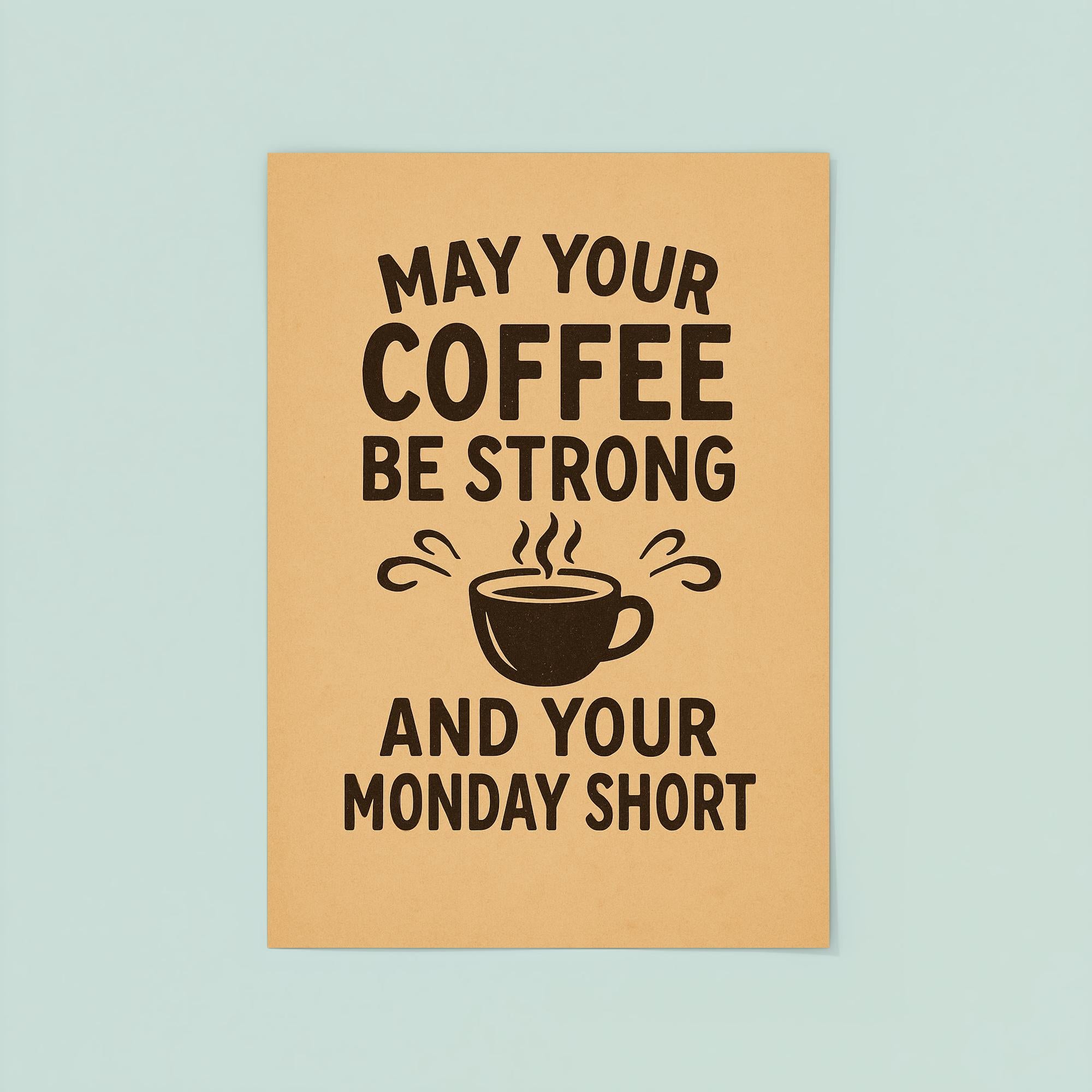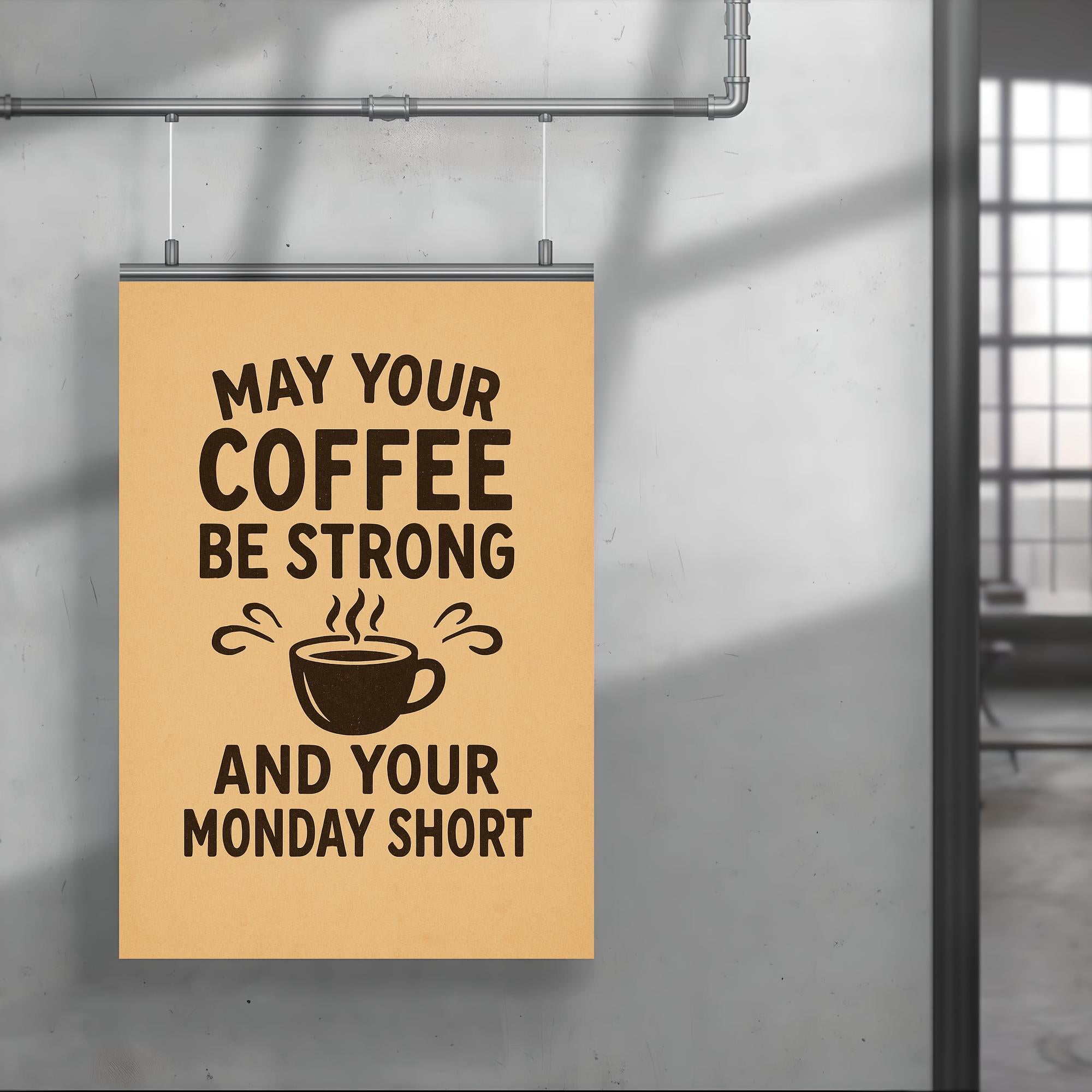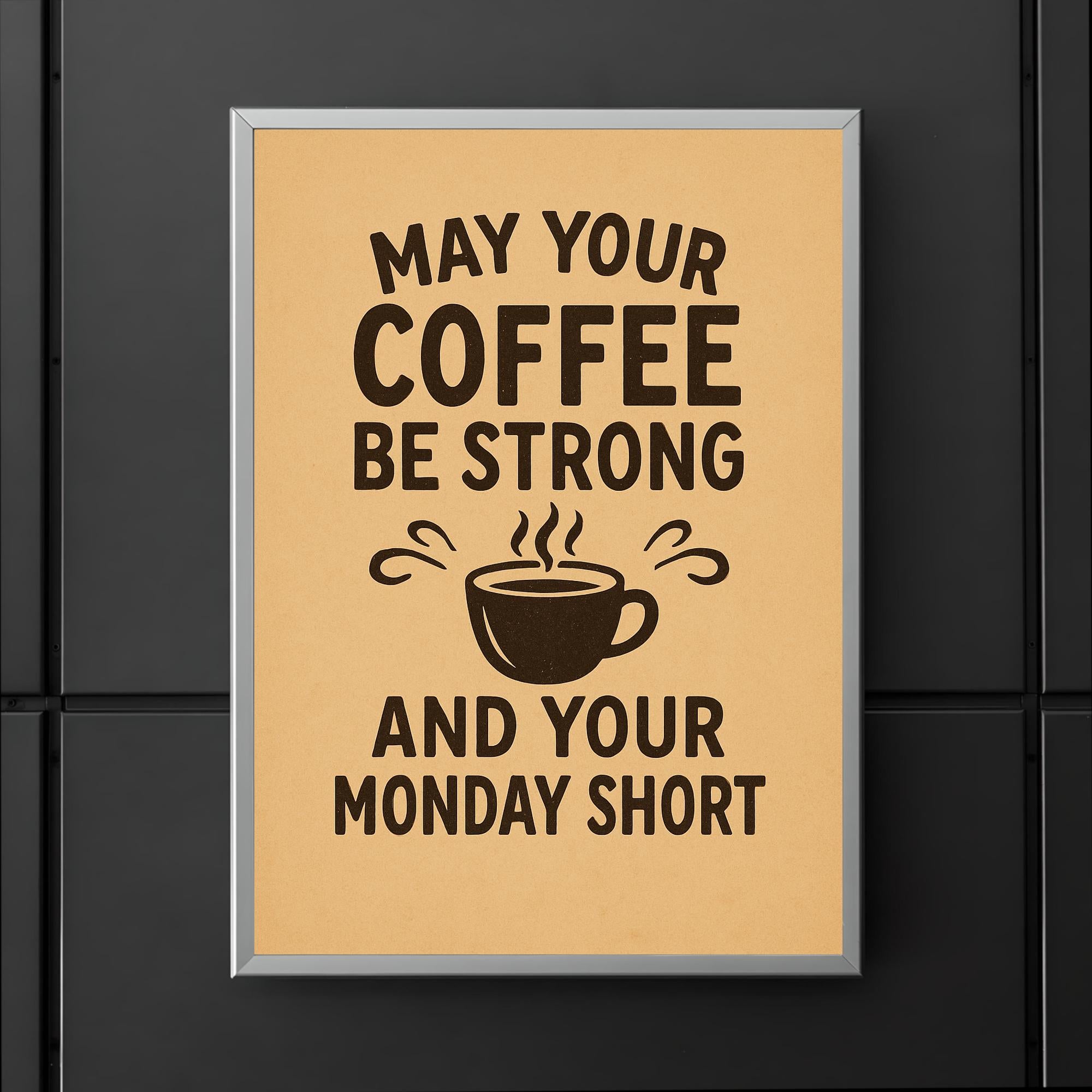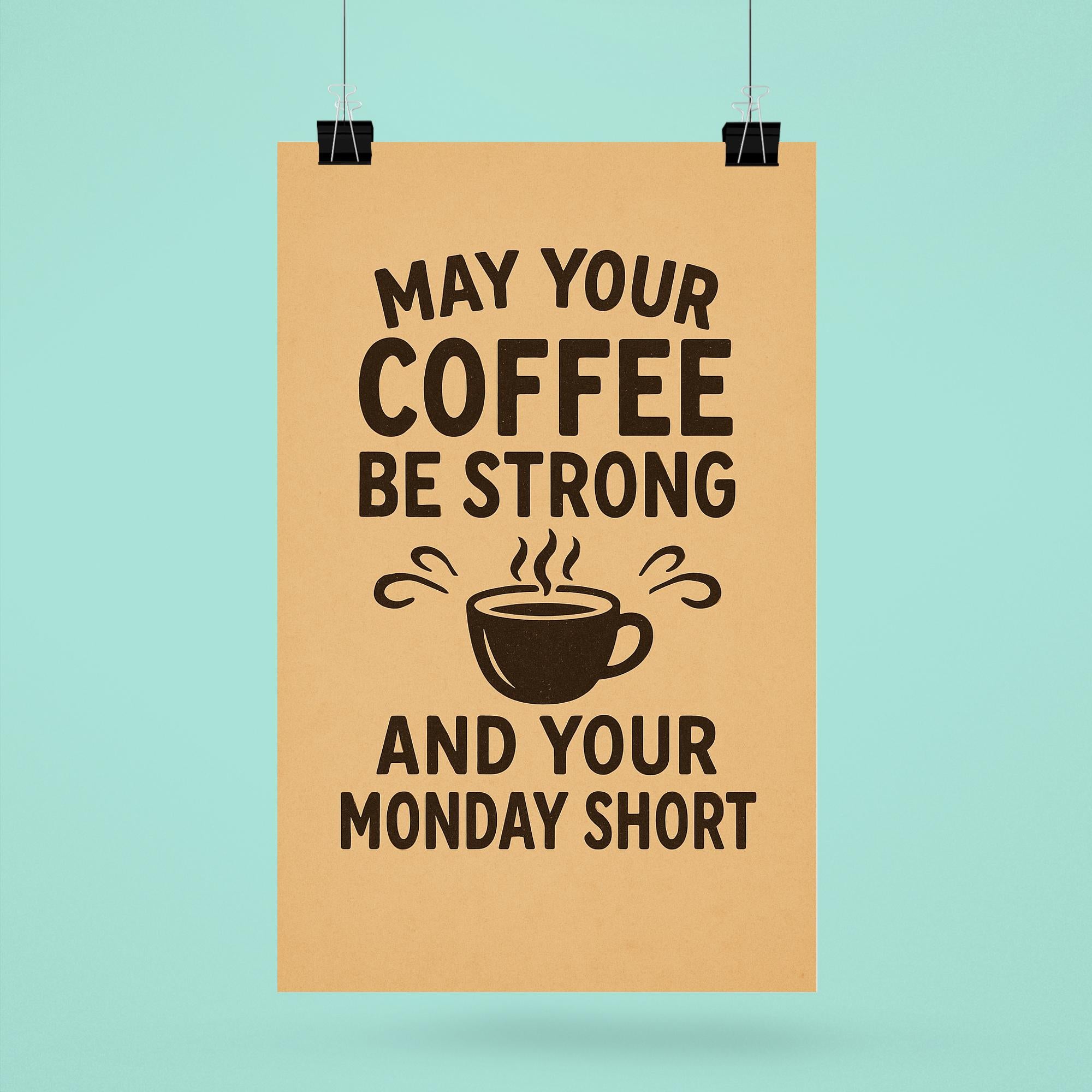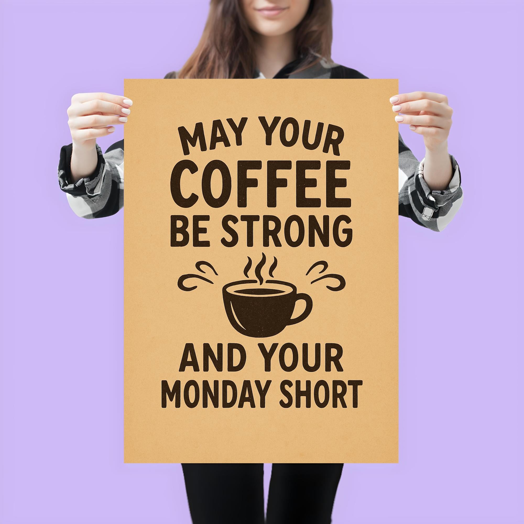 Kickstart your week with a dose of motivation and a splash of humor! This "May your coffee be strong and your Monday short" poster delivers a playful reminder to tackle Mondays with energy and optimism. Perfect for your home, office, or coffee nook, it's an instant mood booster that sets the tone for a productive week ahead.