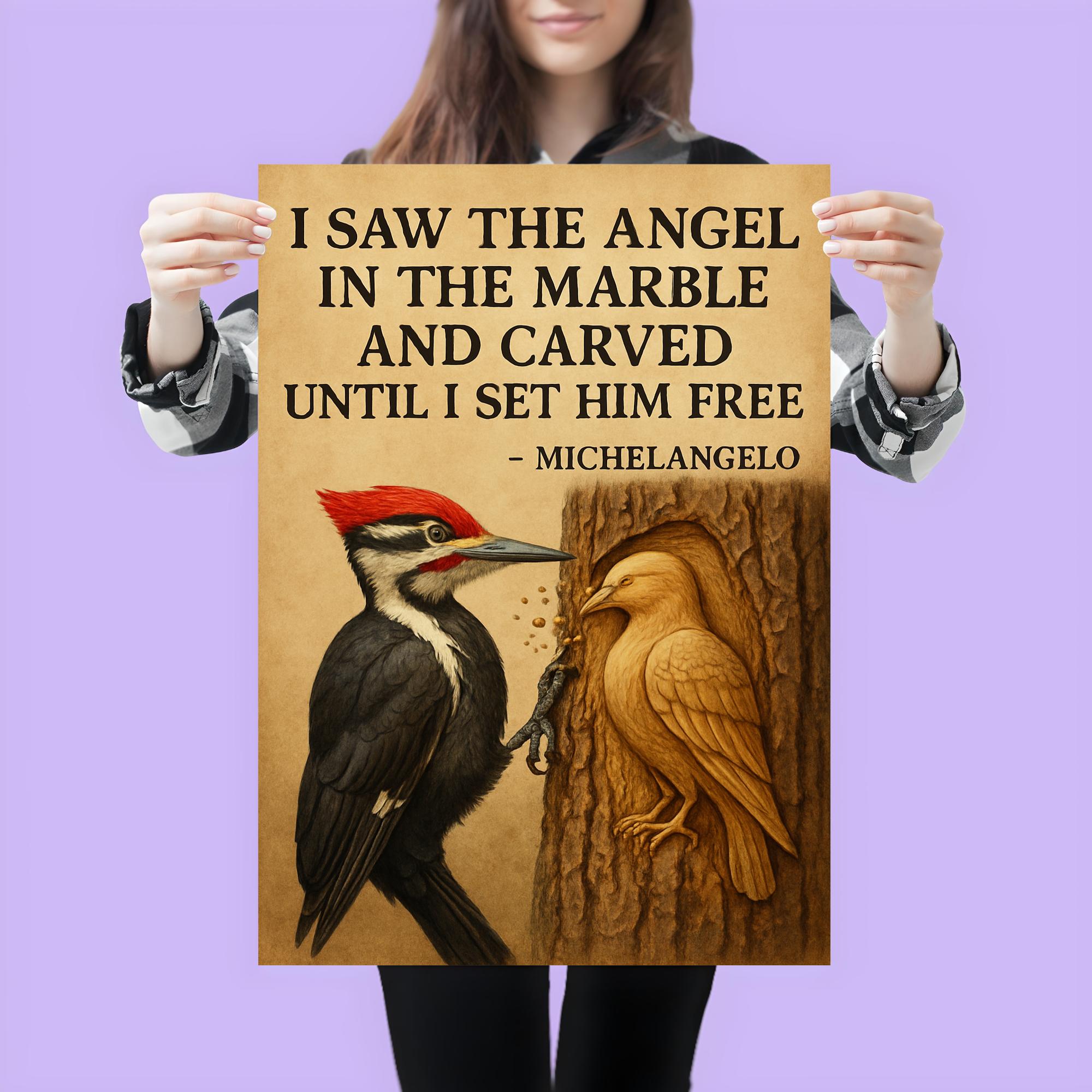Michelangelo Angel Sculpture Quote Poster Print – Unique Marble & Woodpecker Wall Art for Home Decor