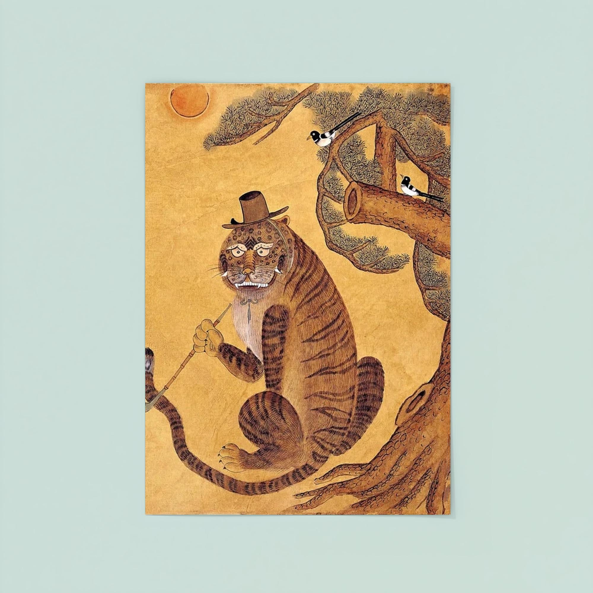 Bring a piece of Korean heritage into your space with this striking poster of the Minhwa Tiger Smoking a Pipe, accompanied by playful magpies. This traditional folk art captures the bold spirit and whimsical charm of Korea’s cultural symbols, making it a captivating centerpiece that sparks conversation and adds timeless character to any room.