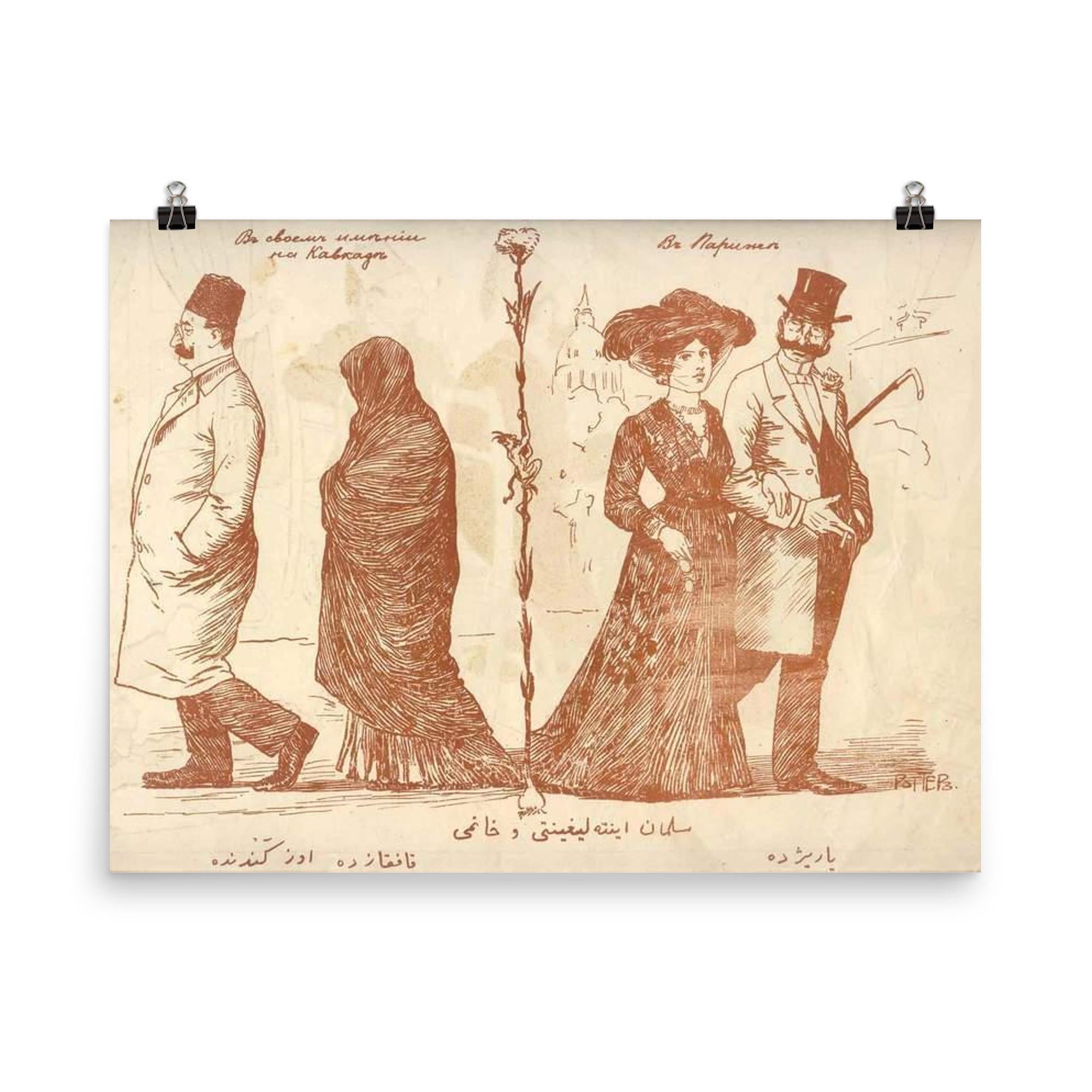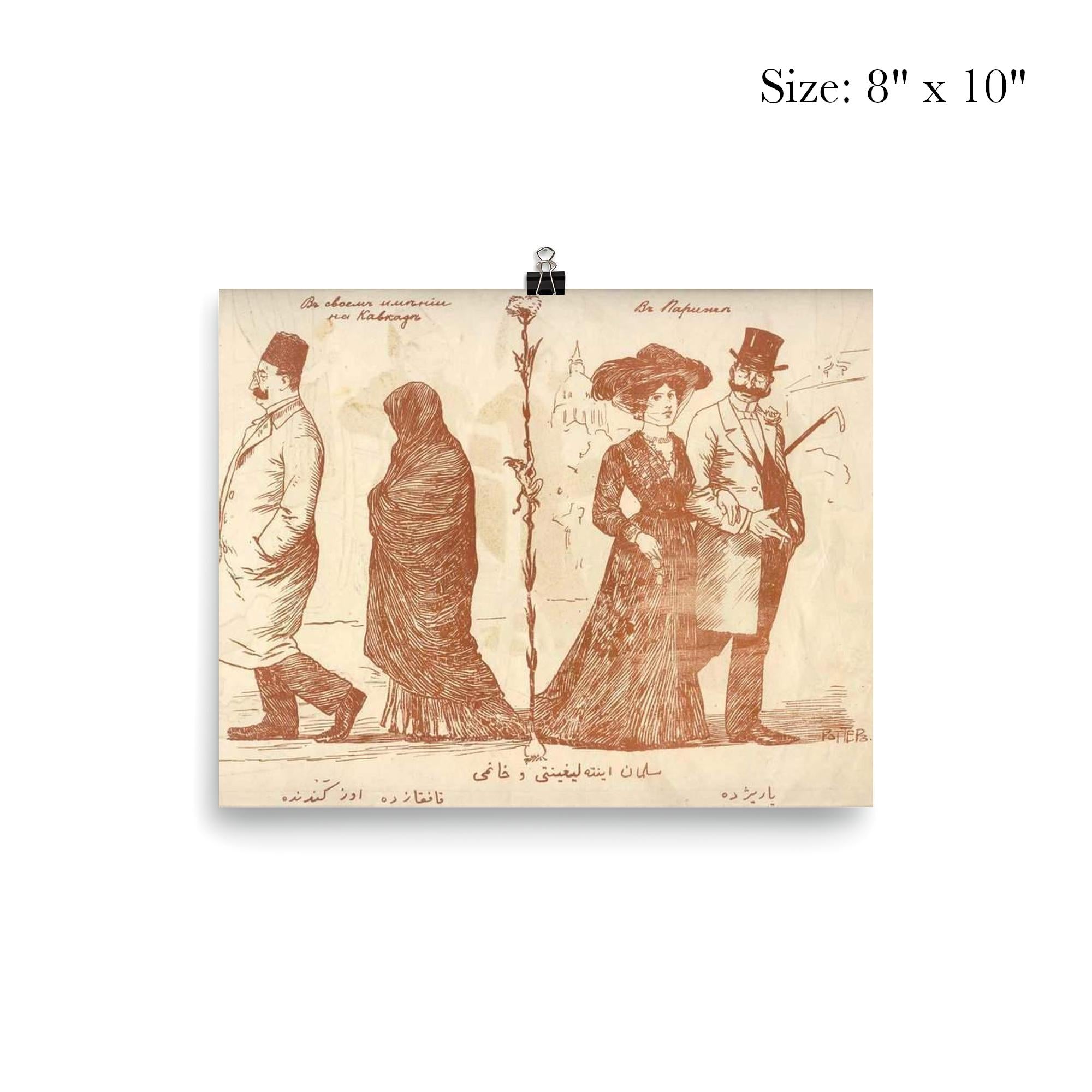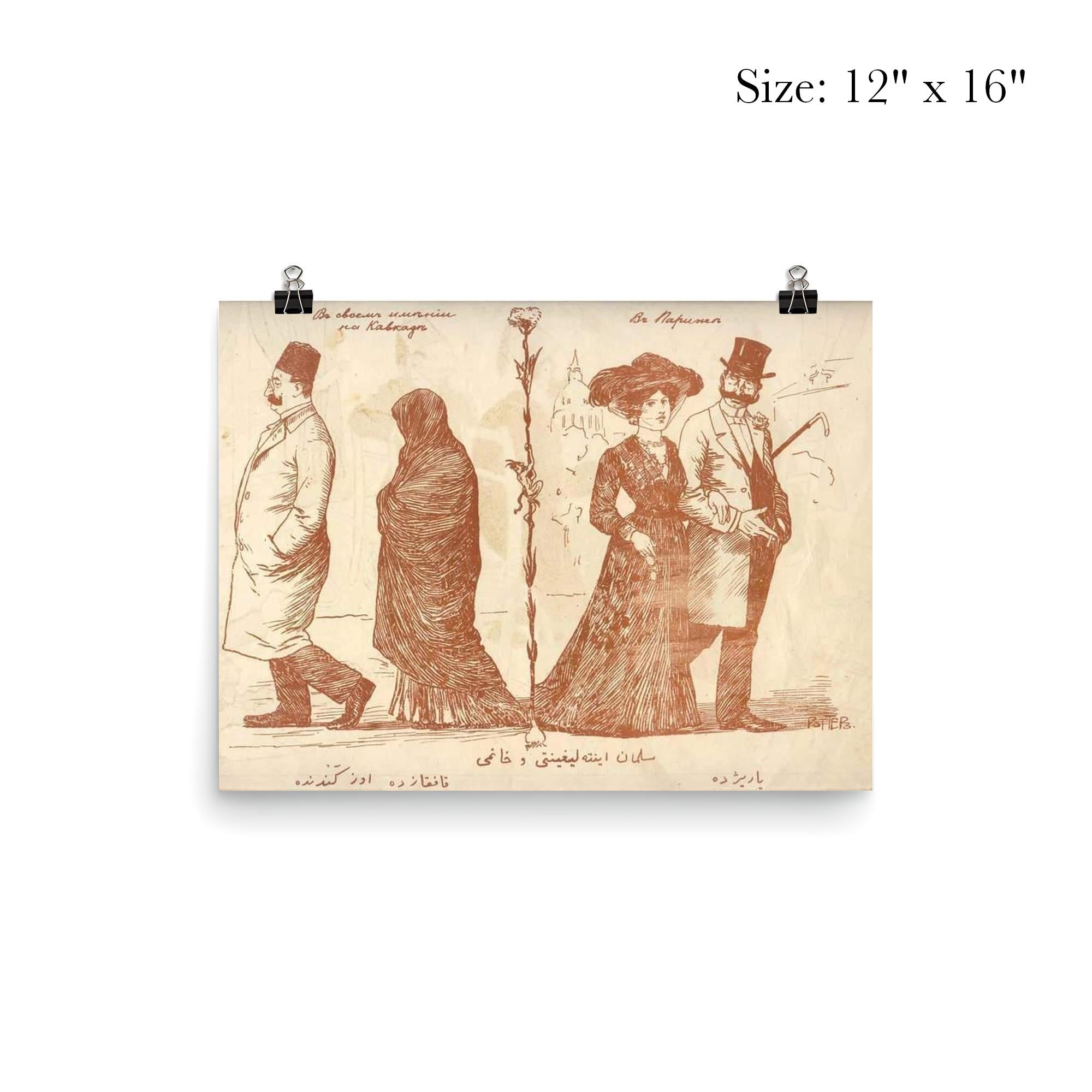 Step back into the early 20th century with this striking poster of the Molla Naseruddin satirical magazine cover from the 1910s. Capturing a poignant commentary on the contrasting attire of elite Muslims in their home countries versus Western Europe, this piece offers a rare and thought-provoking glimpse into cultural identity and societal perceptions of the era. Perfect for lovers of history, art, and social commentary, it makes a meaningful addition to any collection or living space.