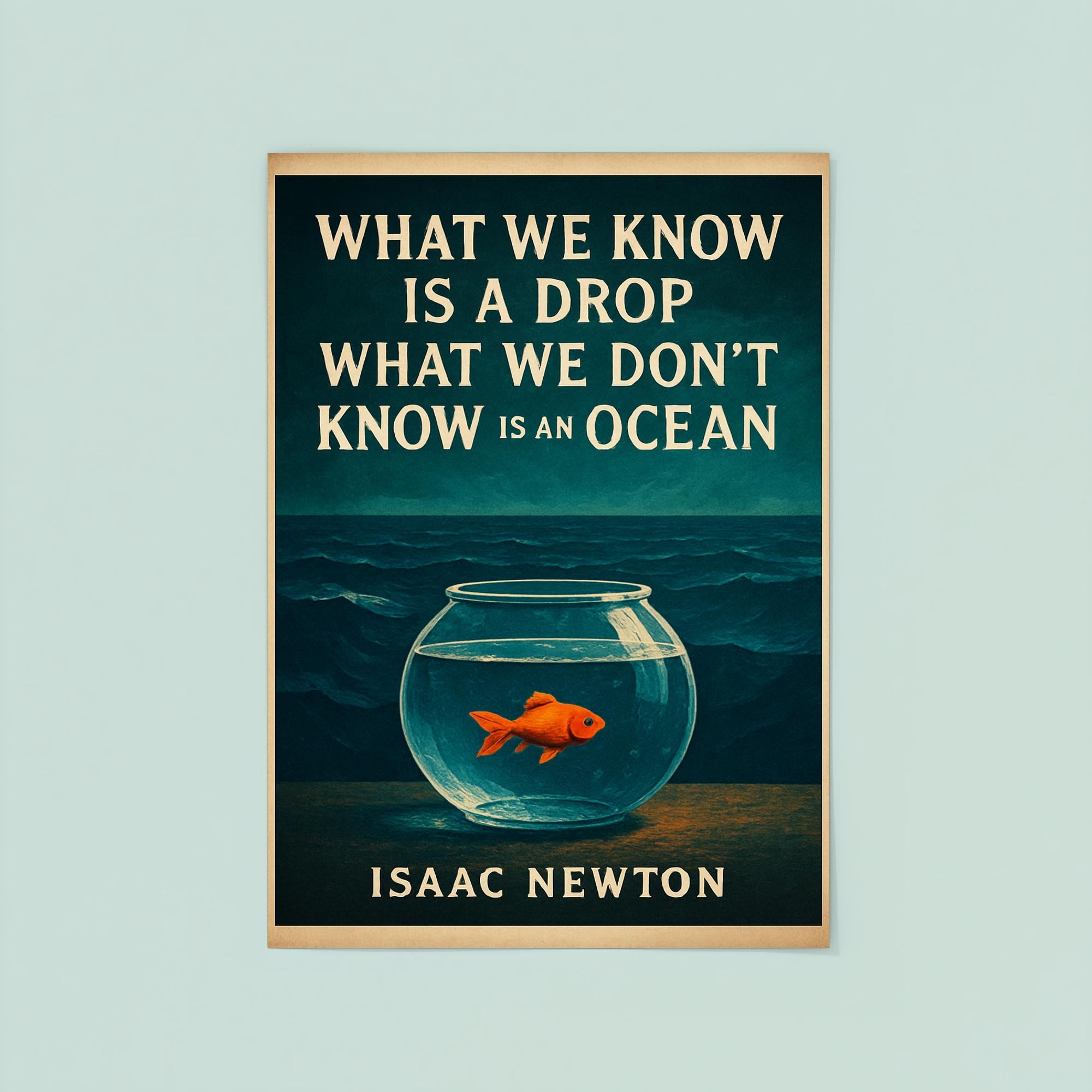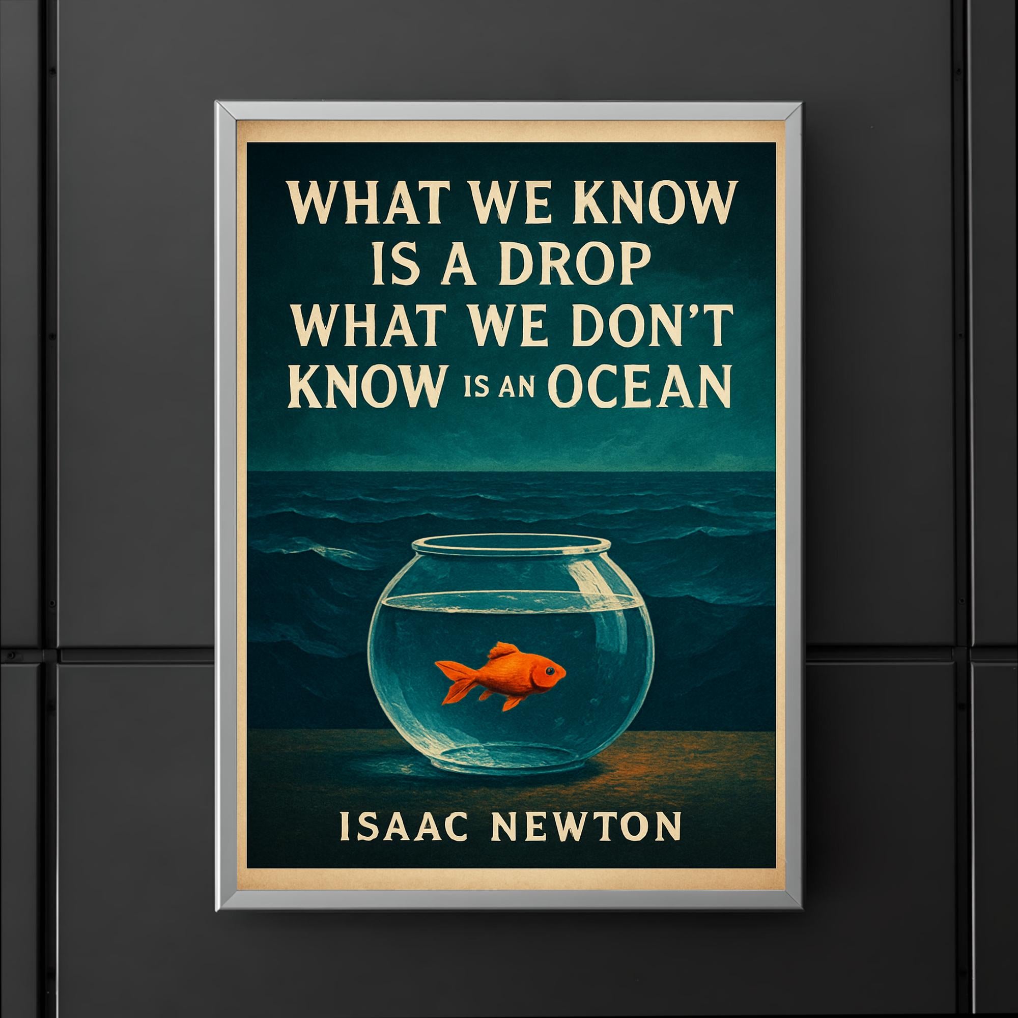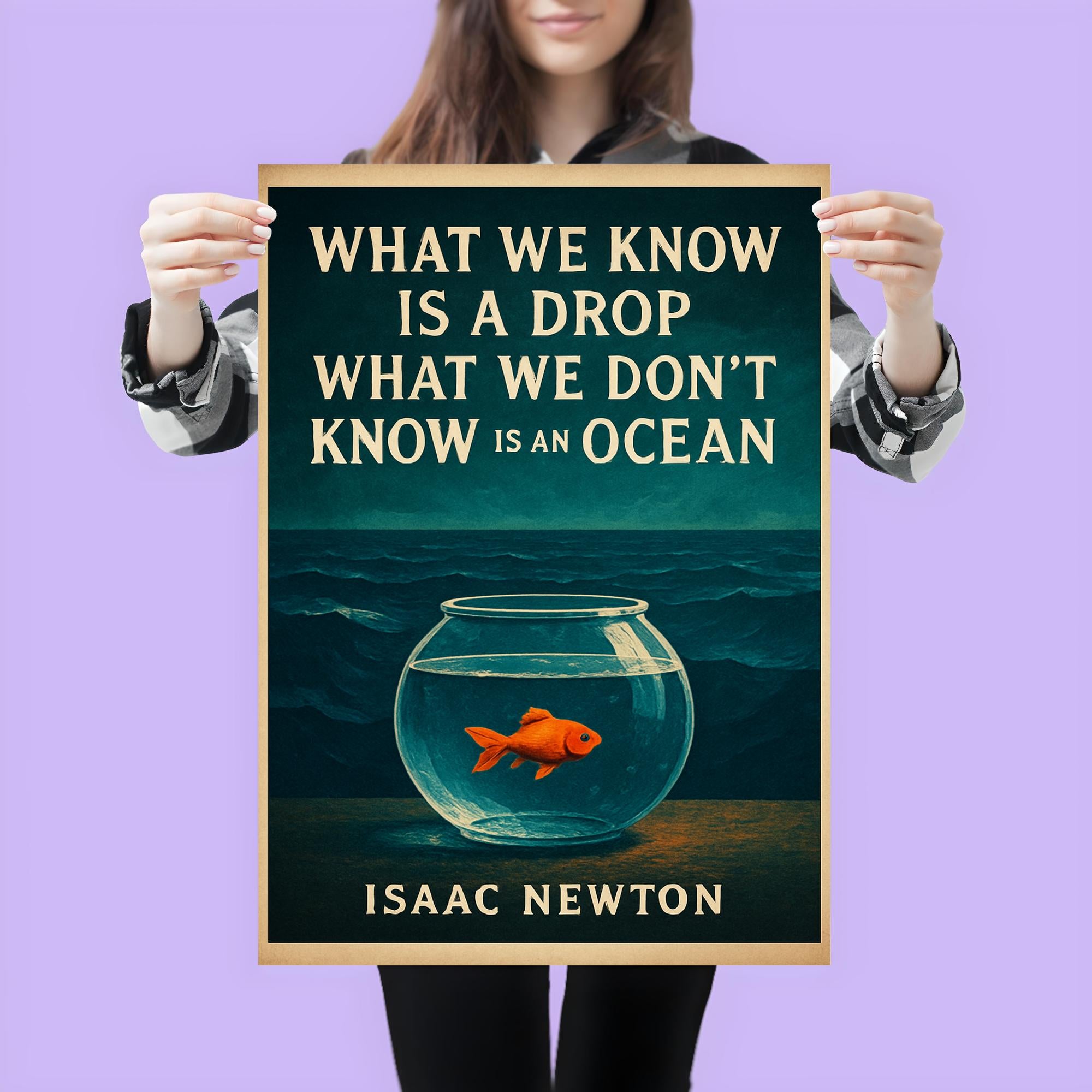 Discover inspiration in simplicity with this striking poster featuring Newton’s profound words: "If I have seen further it is by standing on the shoulders of giants," paired thoughtfully with the imagery of a tiny fish in a fishbowl surrounded by an ocean. A powerful reminder of perspective, growth, and the vastness beyond our immediate view—perfect for your workspace or study to fuel creativity and ambition every day.