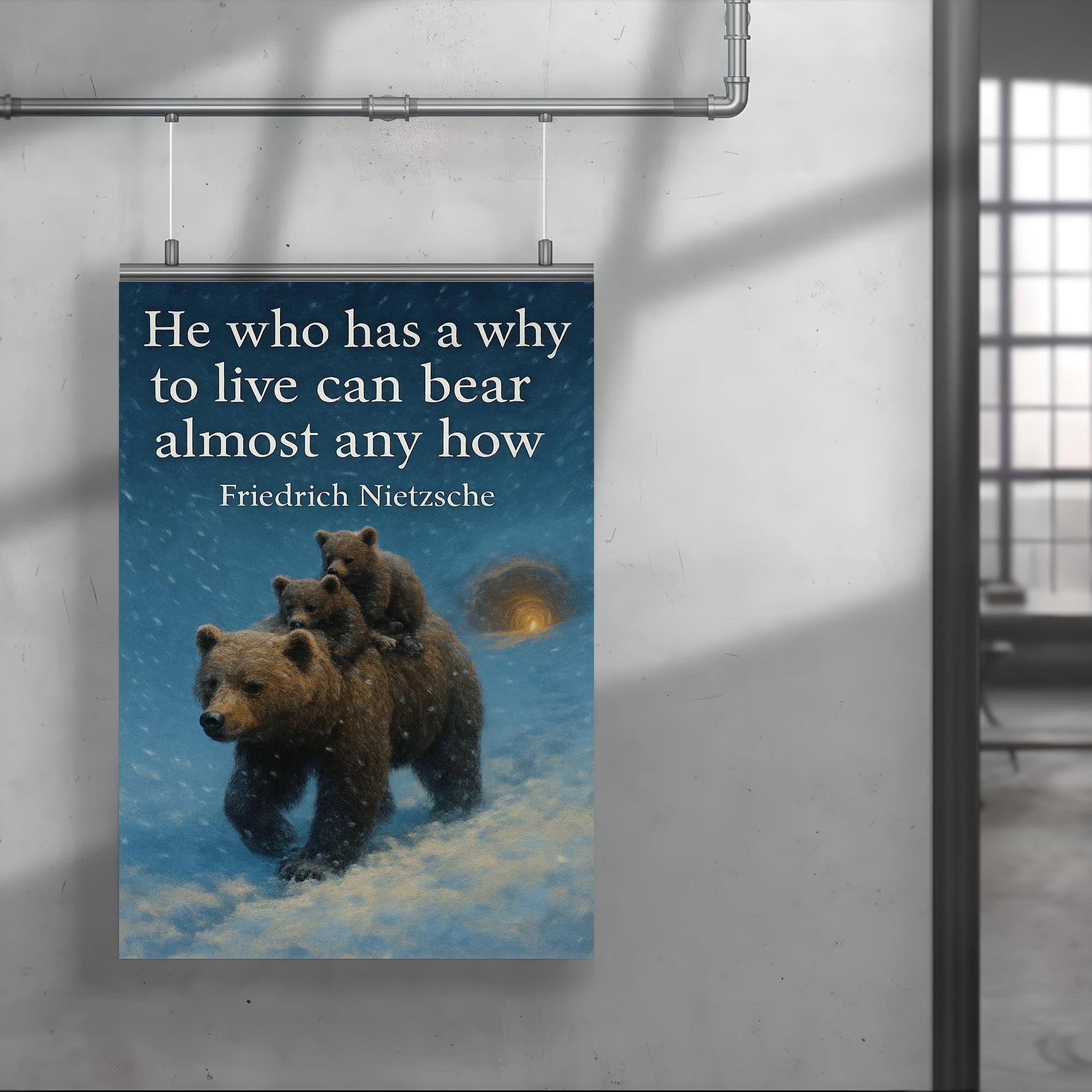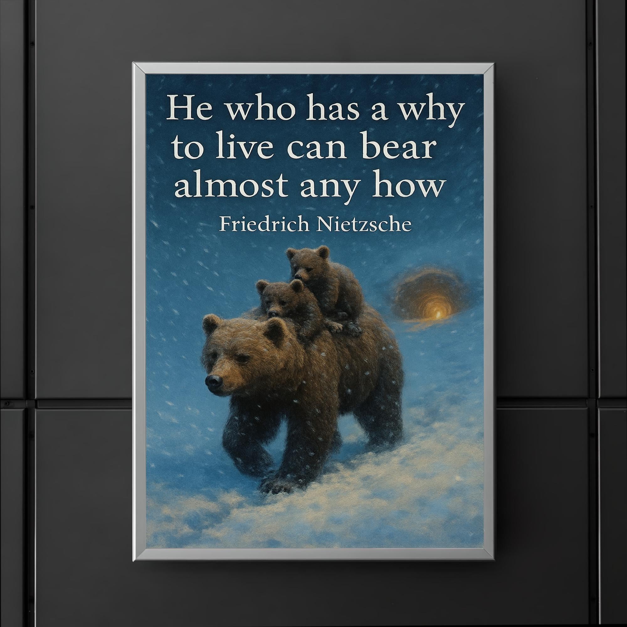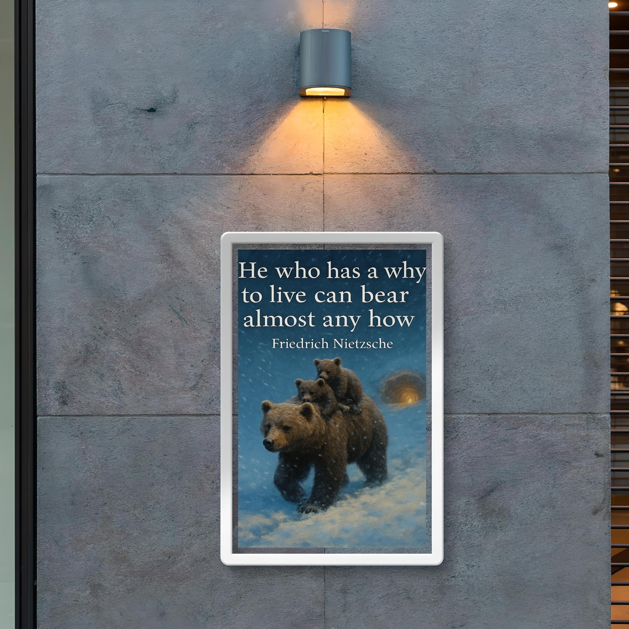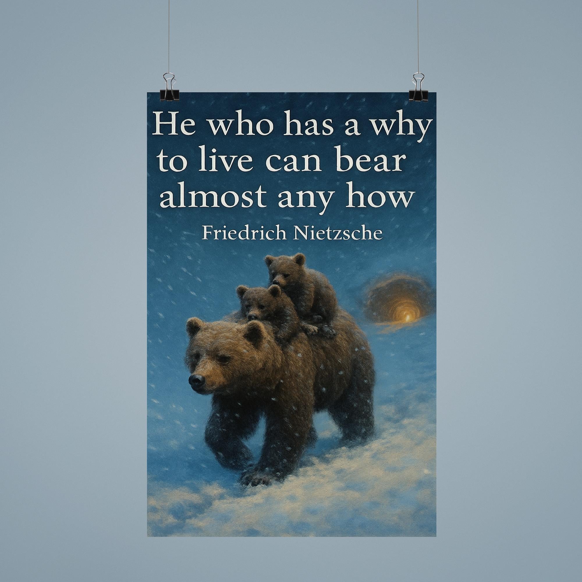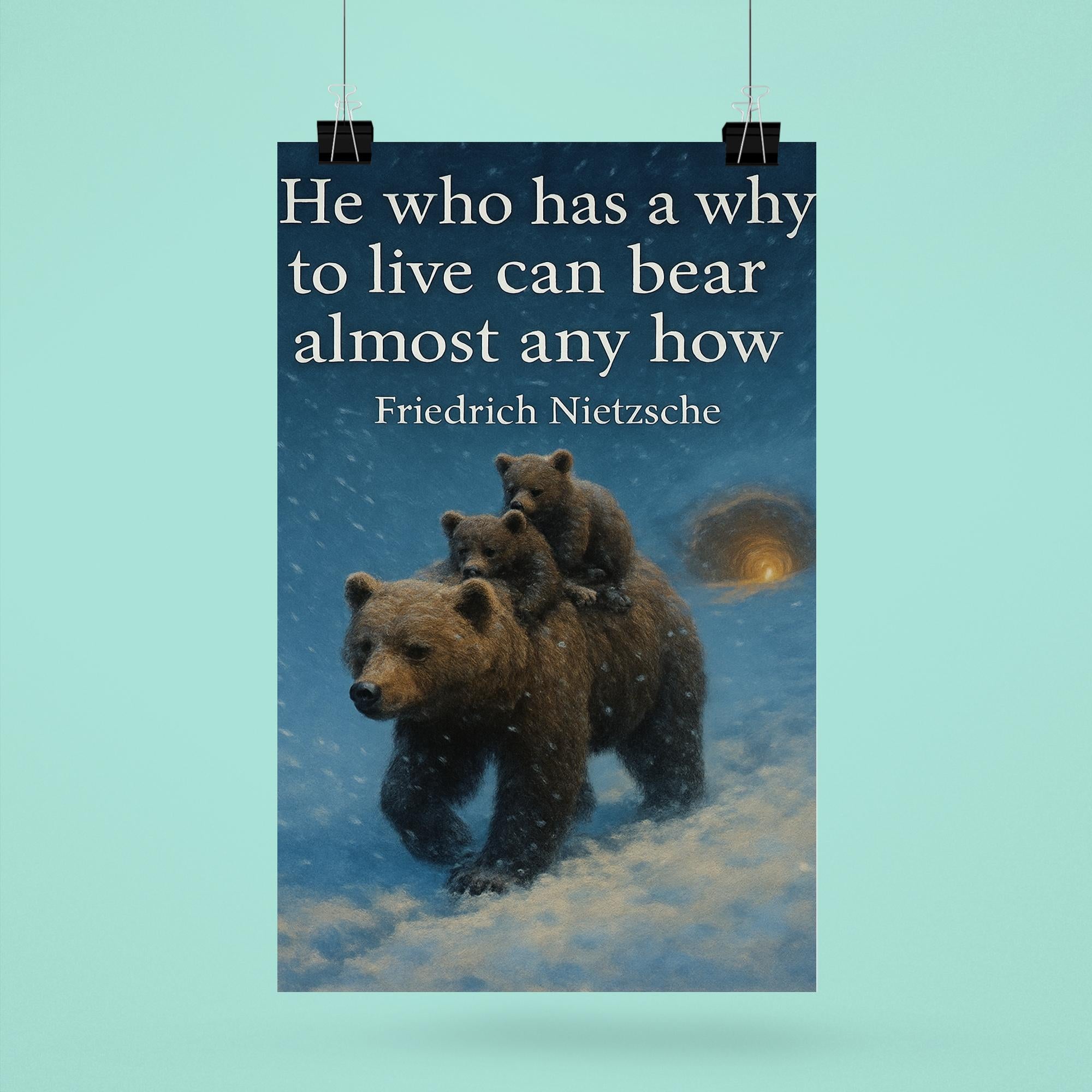 Find strength in every storm with this striking poster featuring Nietzsche’s timeless words, “He who has a why to live can bear almost any how.” Paired with the powerful image of a mother bear shielding her cubs in a blizzard, it’s a moving reminder of resilience, purpose, and unwavering love. Perfect for inspiring courage and determination in any space.