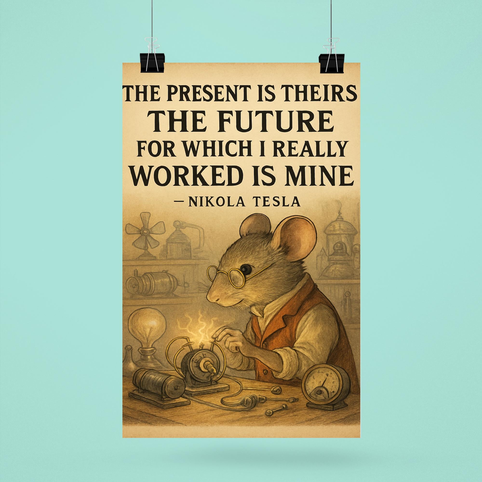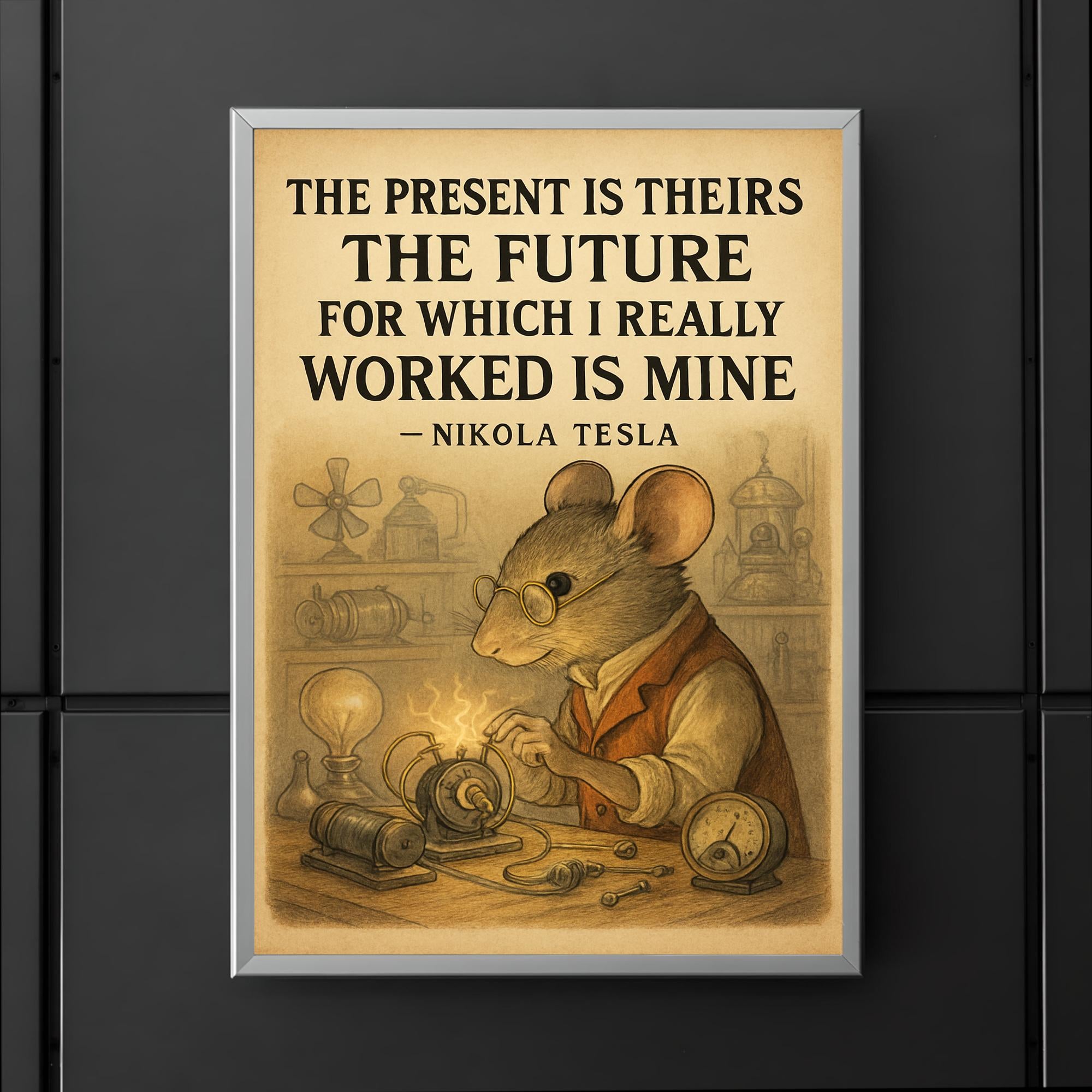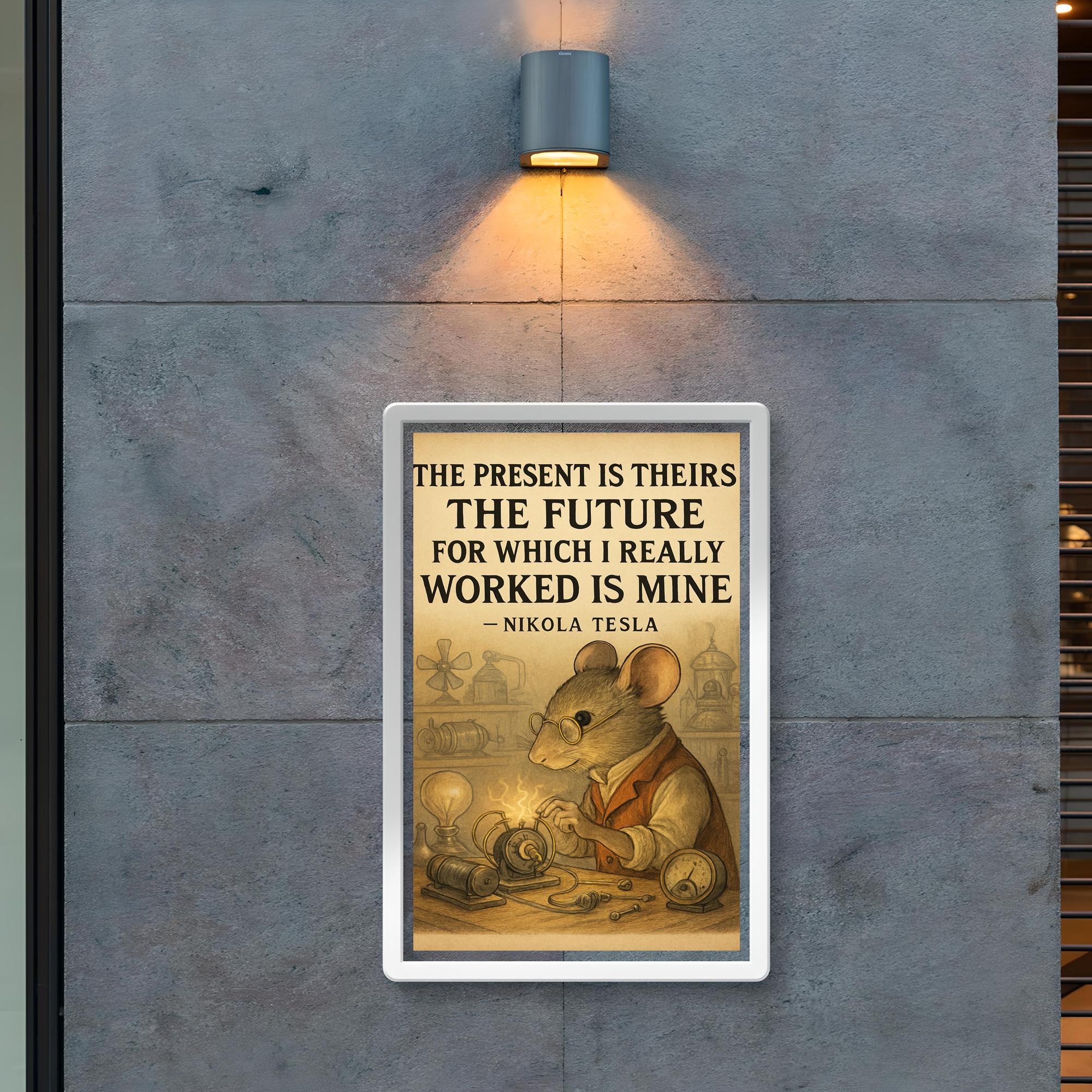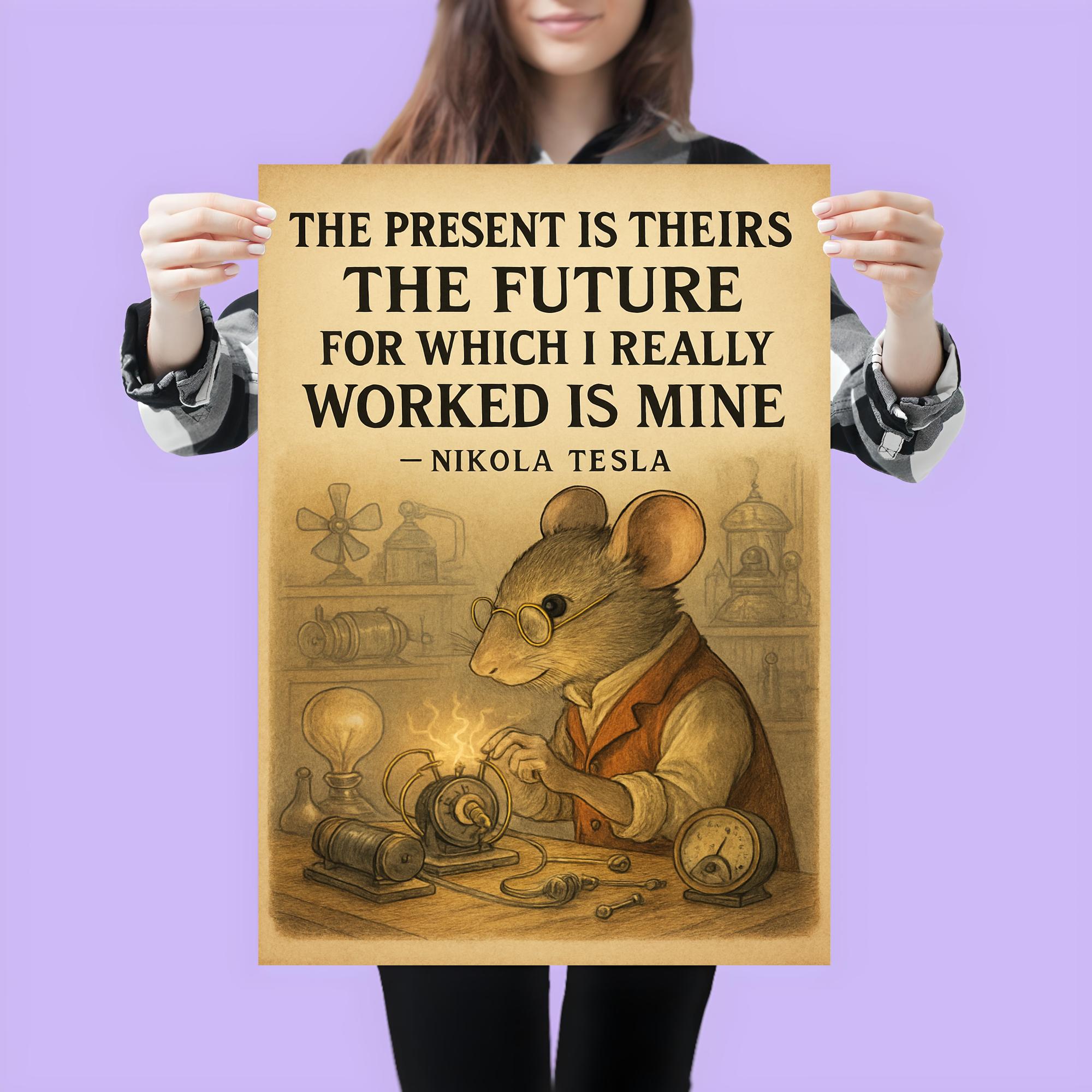 Ignite your ambition with this powerful Nikola Tesla quote: "The present is theirs; the future, for which I really worked, is mine." Perfect for dreamers and doers alike, this poster serves as a daily reminder that true success belongs to those who dare to shape tomorrow. Elevate your space with Tesla’s visionary spirit and fuel your drive toward greatness.