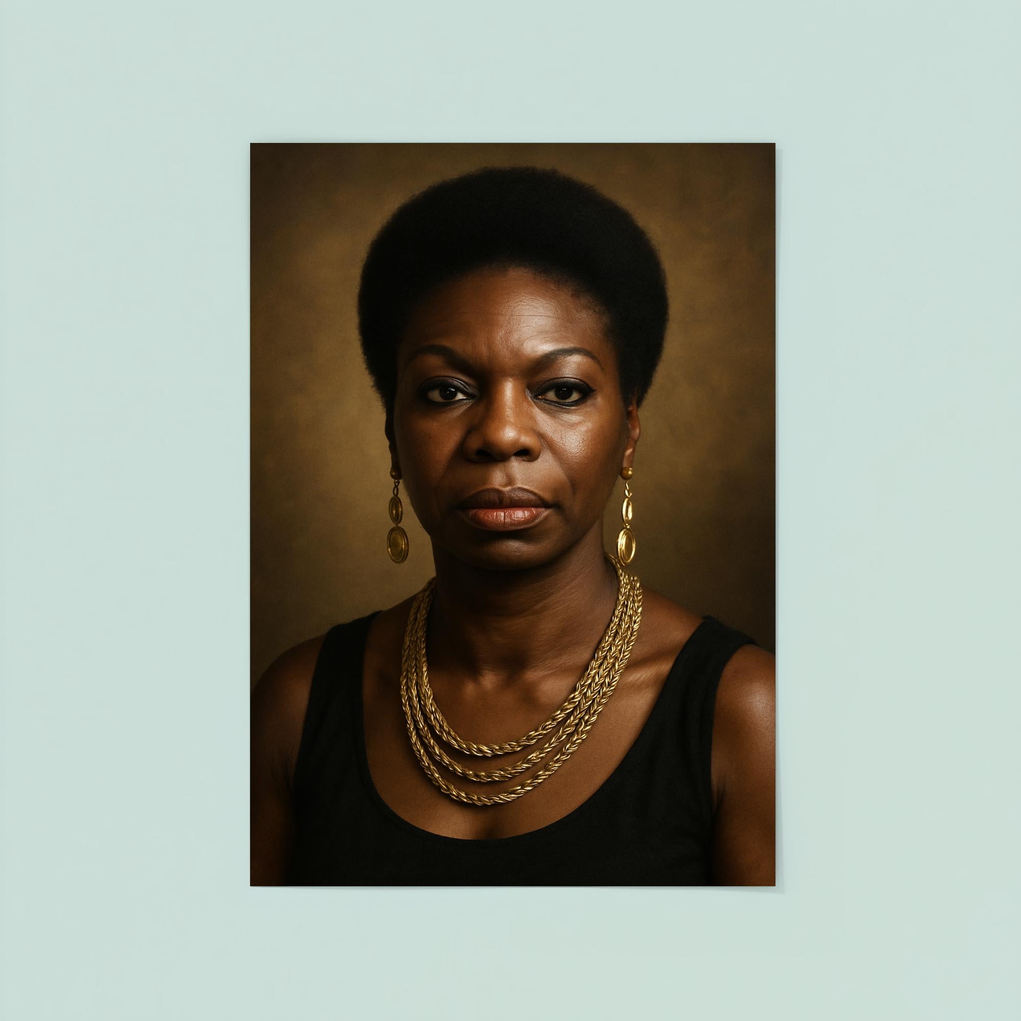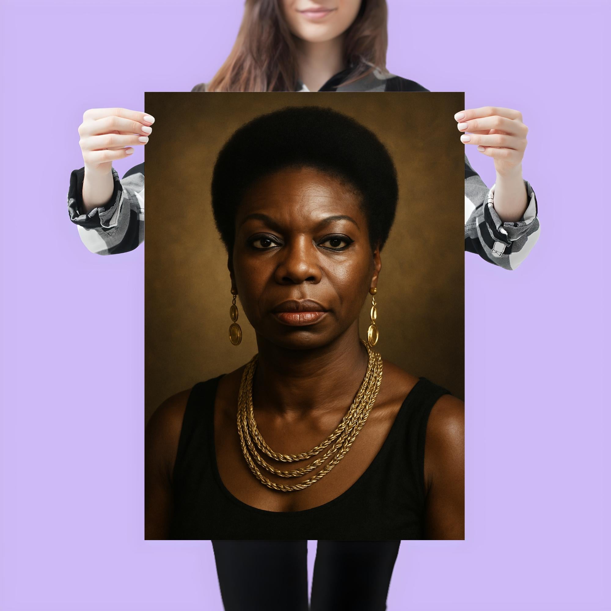 Celebrate the timeless spirit of Nina Simone with this striking portrait poster. Capturing the essence of her powerful presence, this artwork serves as a bold tribute to the legendary singer, pianist, and activist. Perfect for any space that honors music, passion, and unshakable strength.