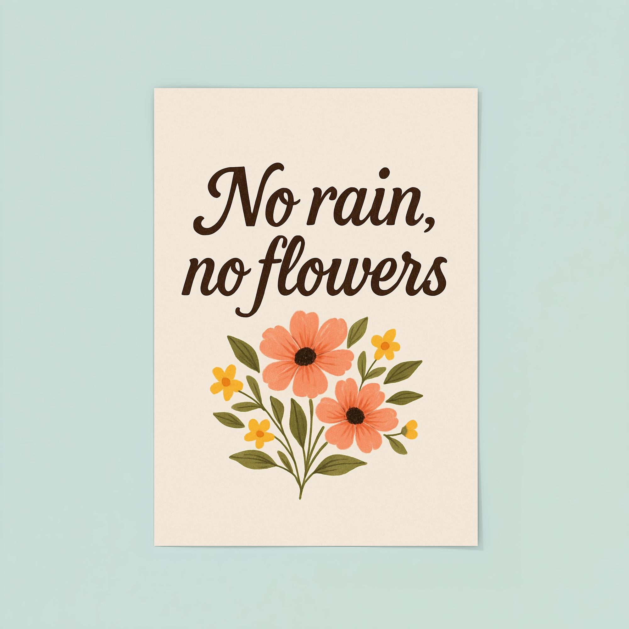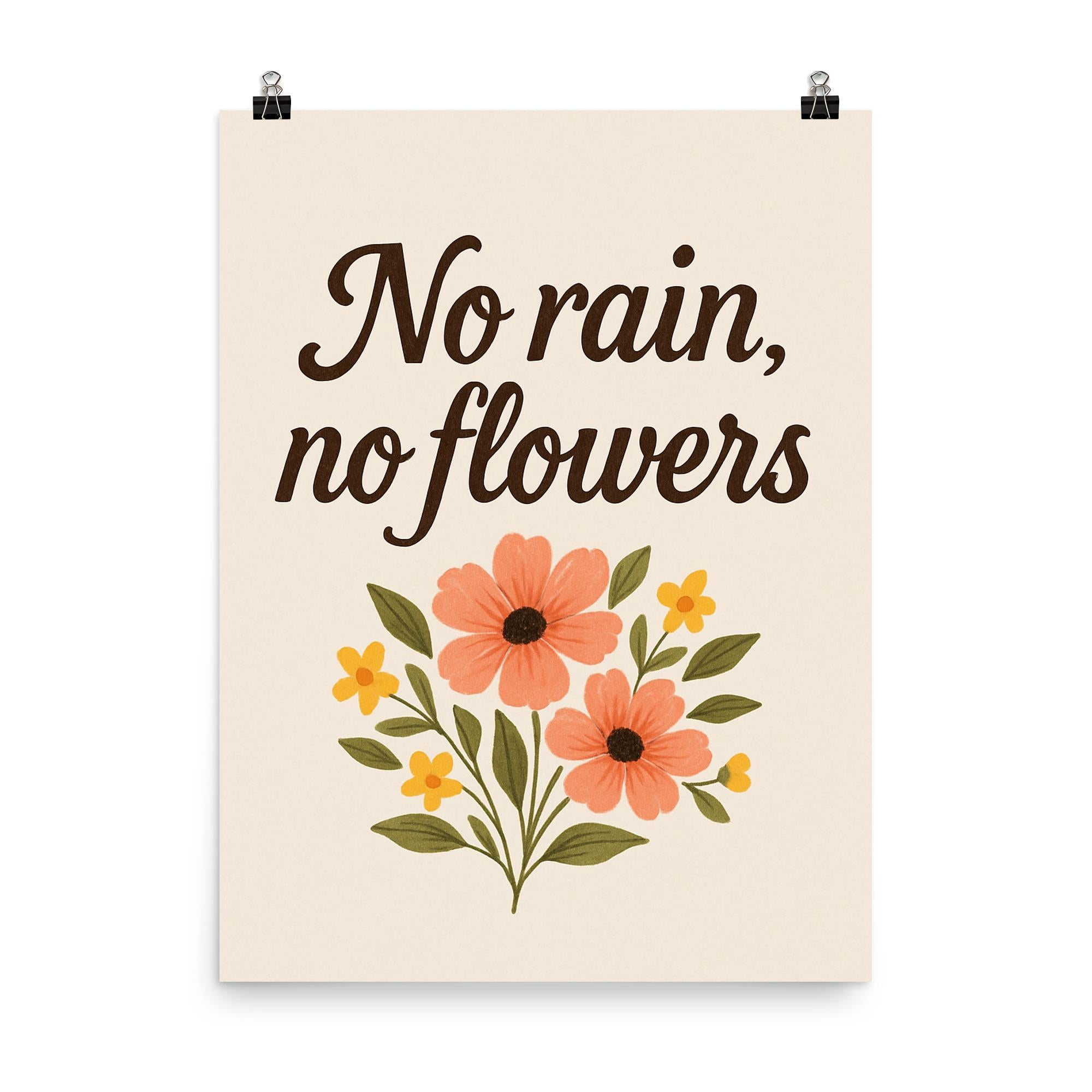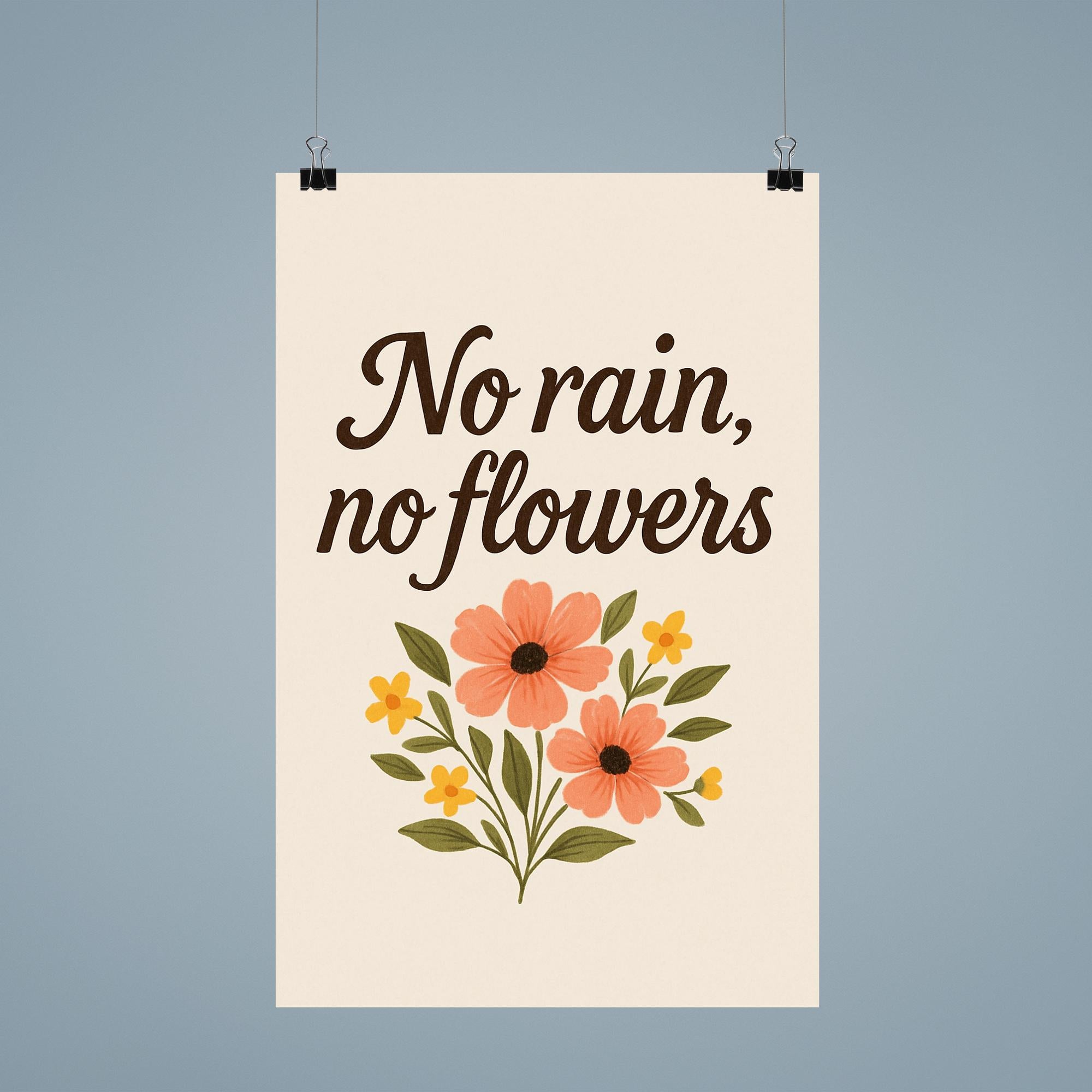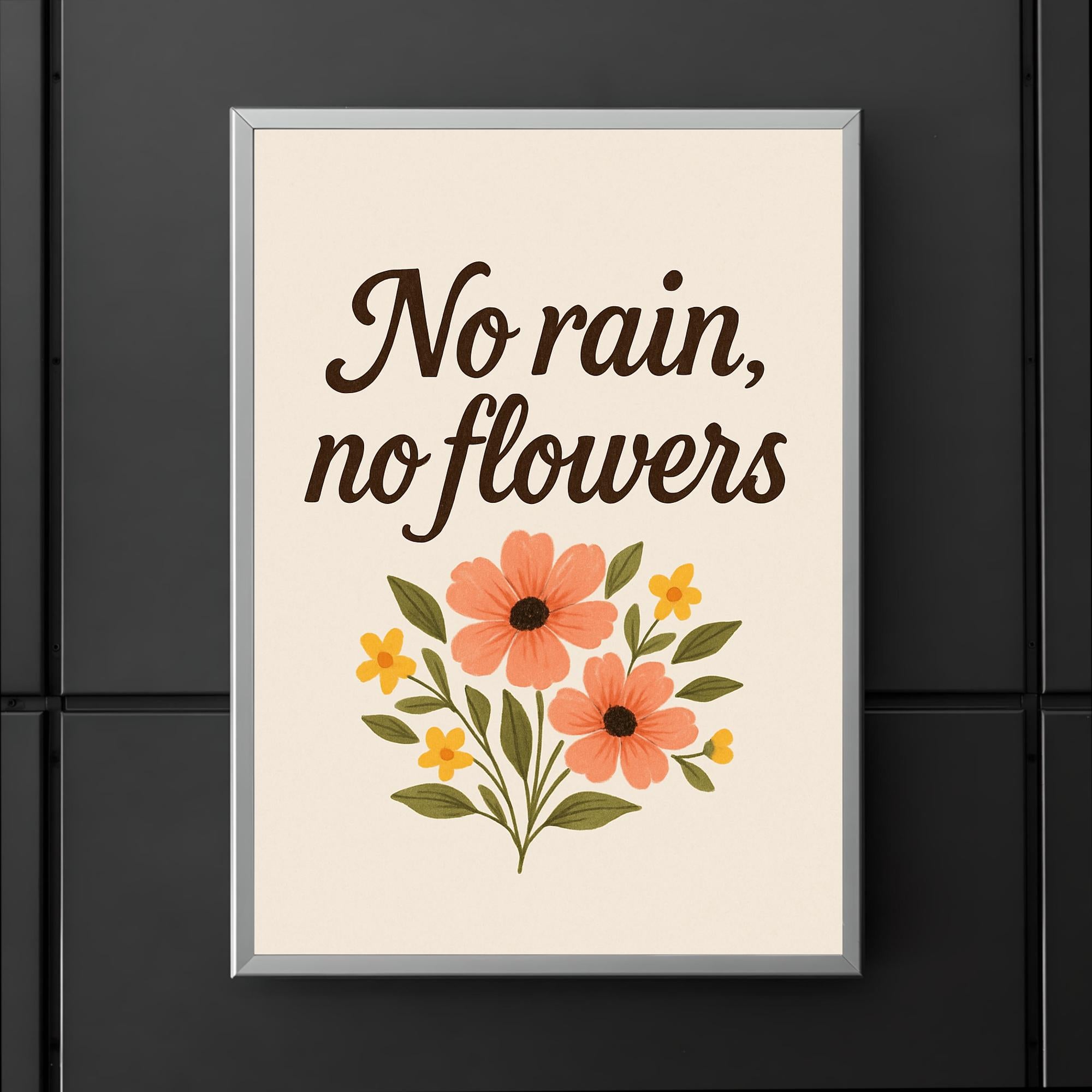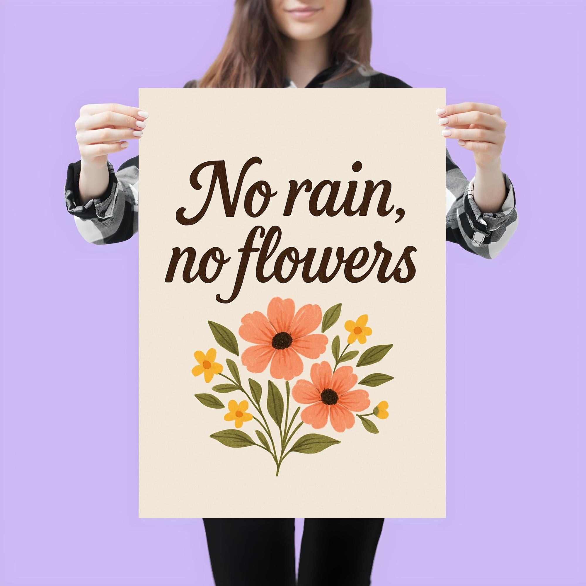 Celebrate resilience and growth with a "No Rain, No Flowers" poster—a daily reminder that beautiful things often bloom from life's challenges. Perfect for inspiring positivity at home, in the office, or as a thoughtful gift, this message encourages you to embrace every season and cherish the strength it brings. Let it brighten your space and your outlook, whatever the weather.