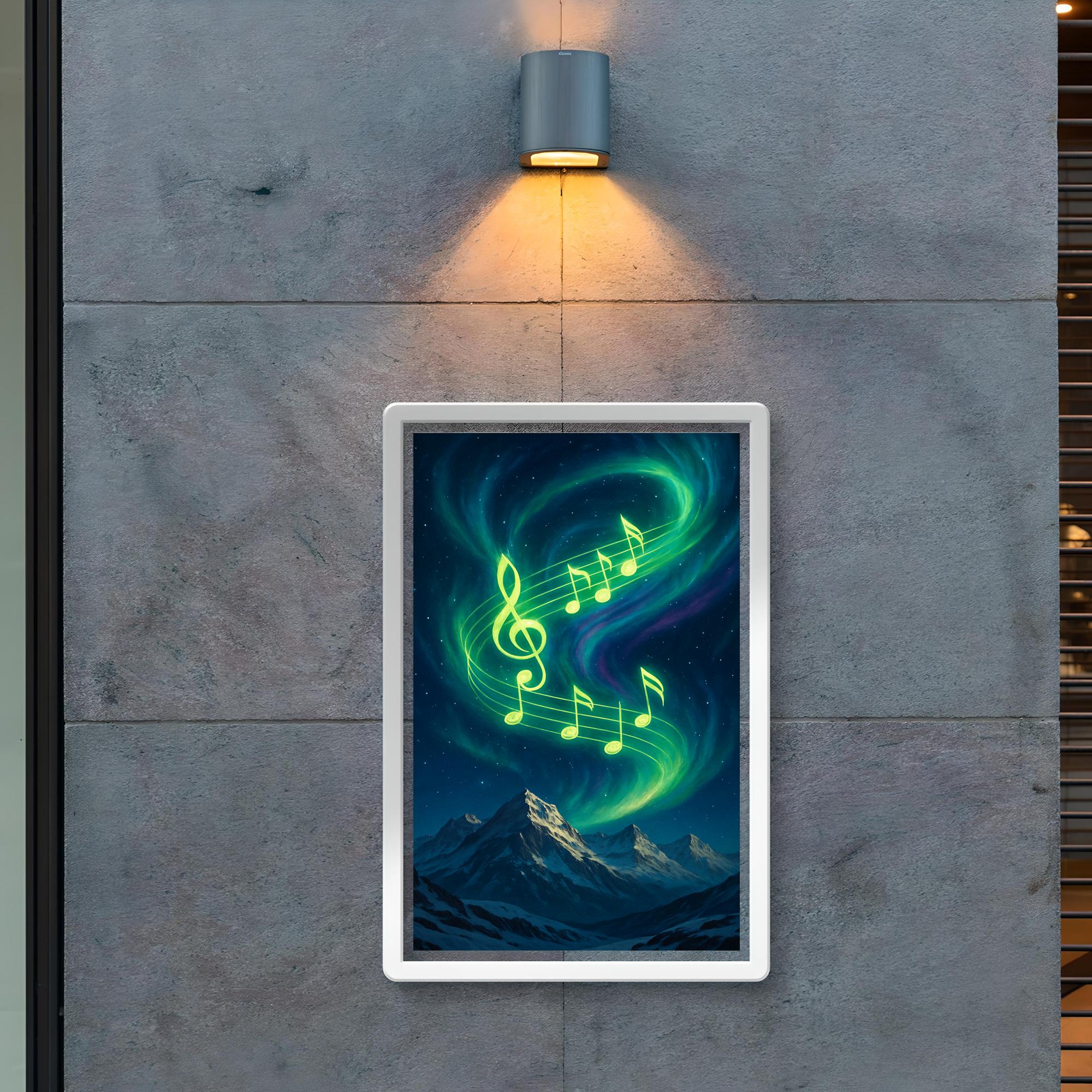 Northern Lights Music Notes Poster Print – Vibrant Aurora Wall Art Over Snowy Mountain Peaks, Unique Nature & Sound Fusion Decoration