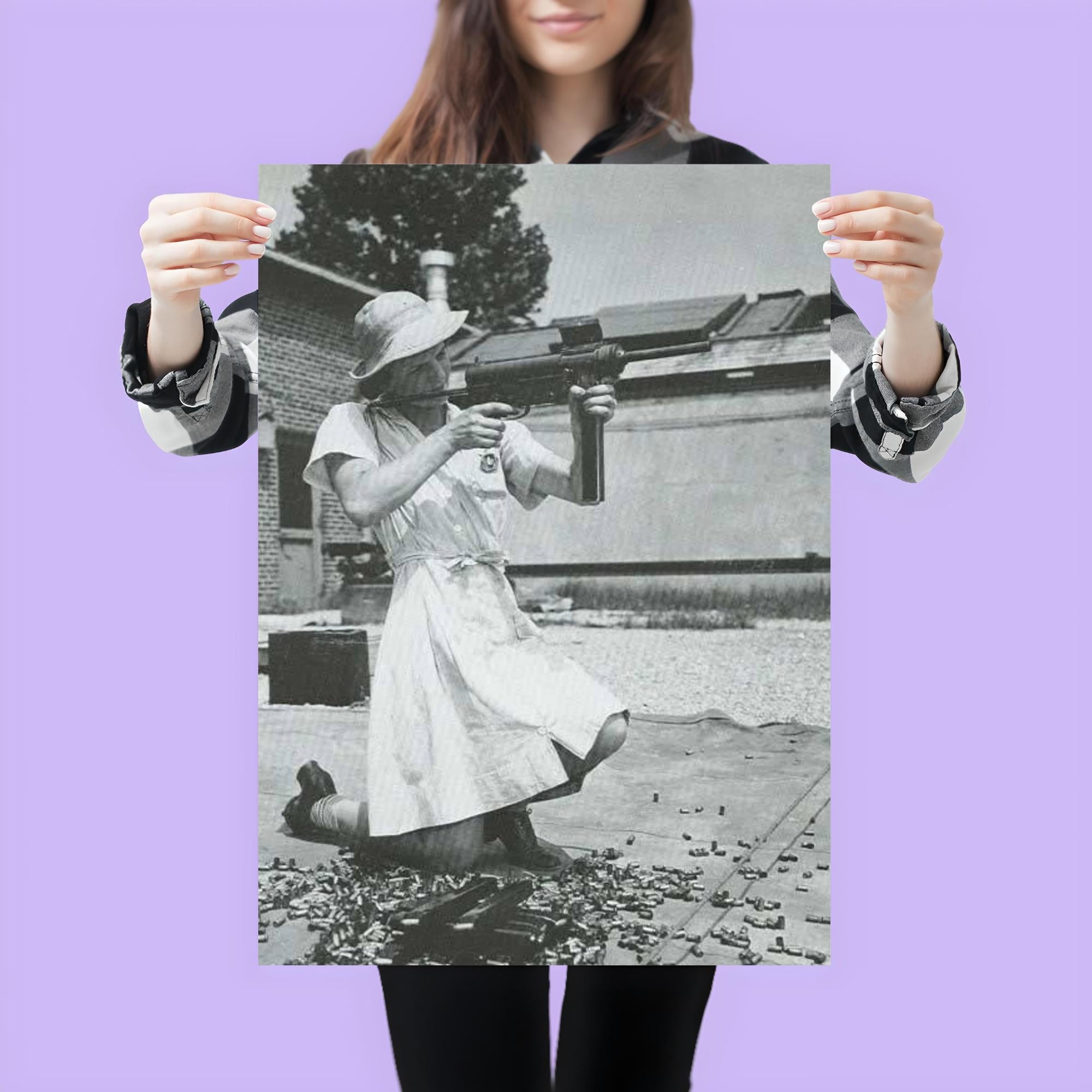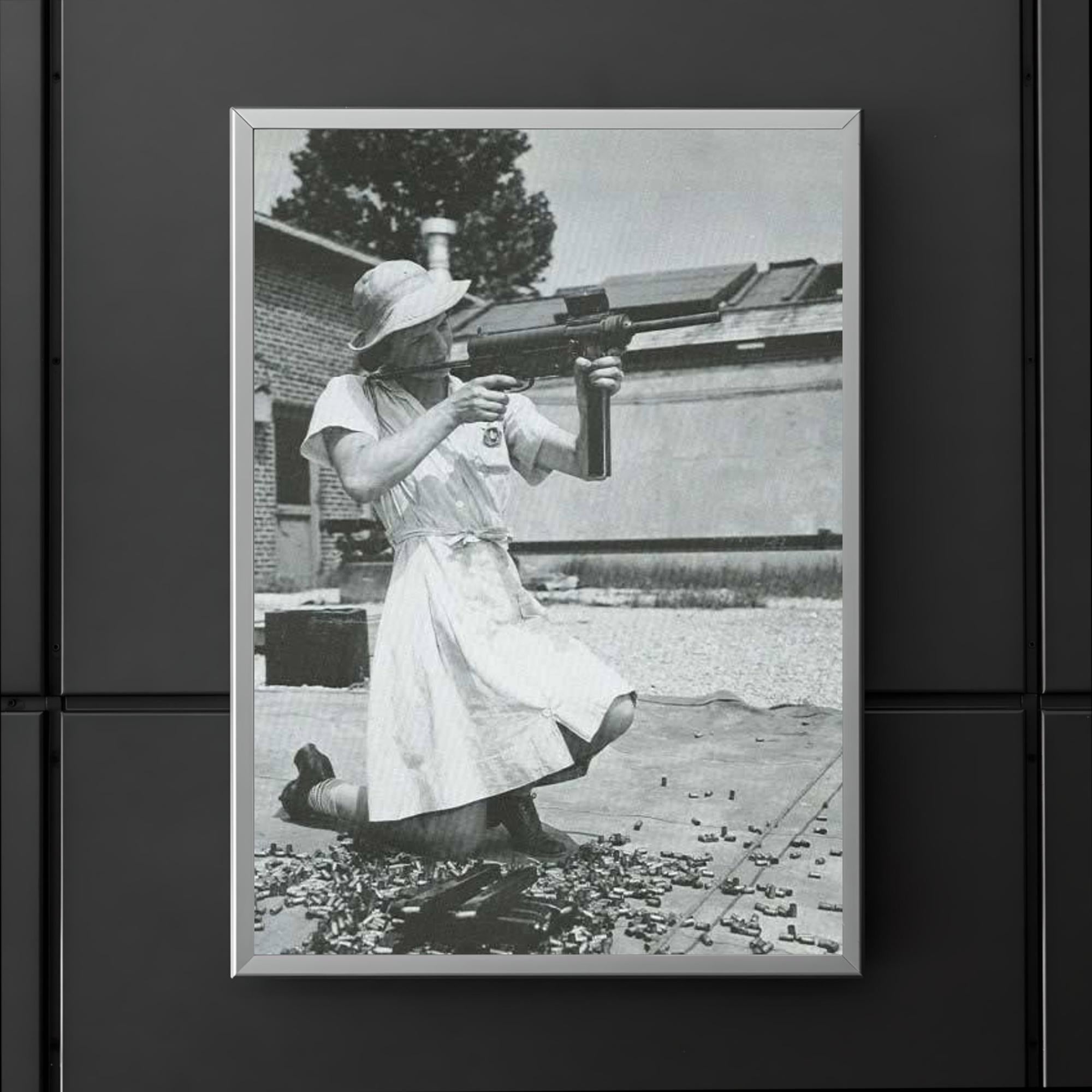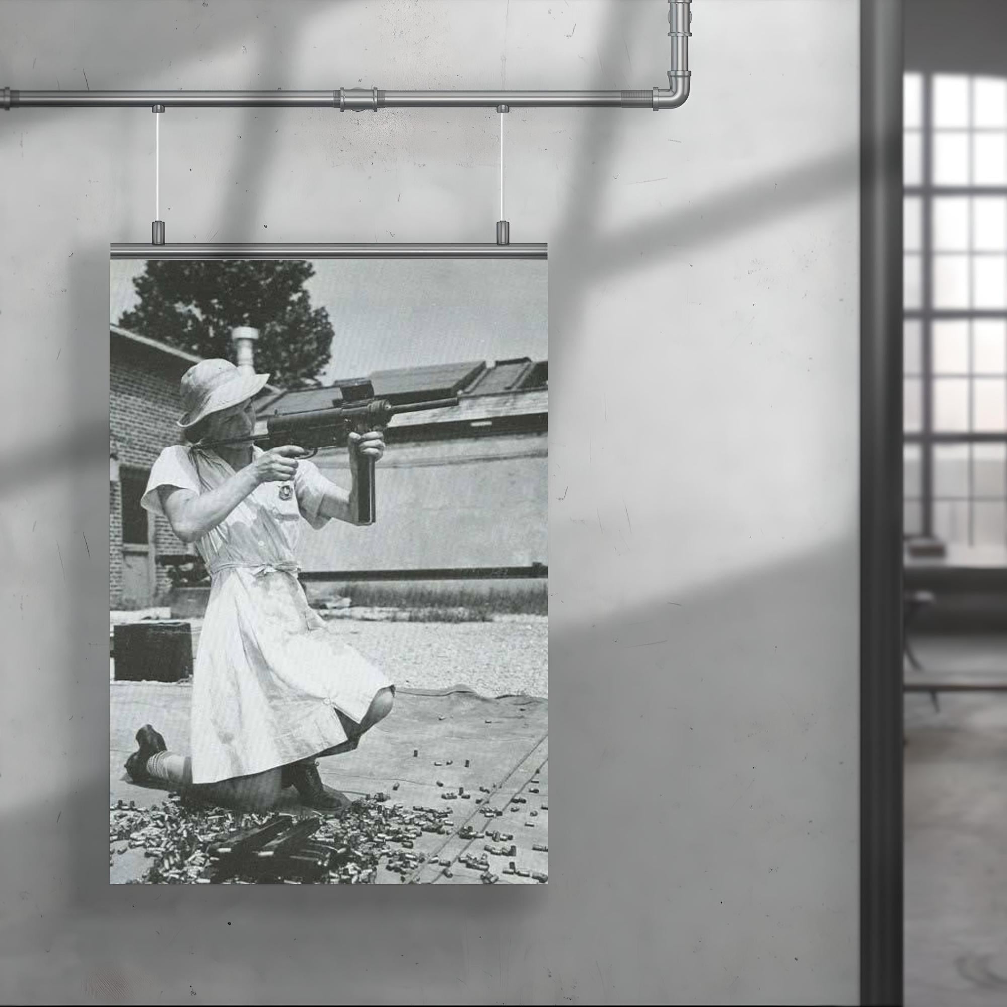 Step back into the resilience and courage of the 1940s with this striking WWII poster featuring a Nurse holding an M-3 Grease Gun. This powerful image captures the unwavering spirit and strength of those who served on the home front and battlefield alike. Perfect for history enthusiasts and collectors, this poster is a vivid tribute to the overlooked heroes of wartime.