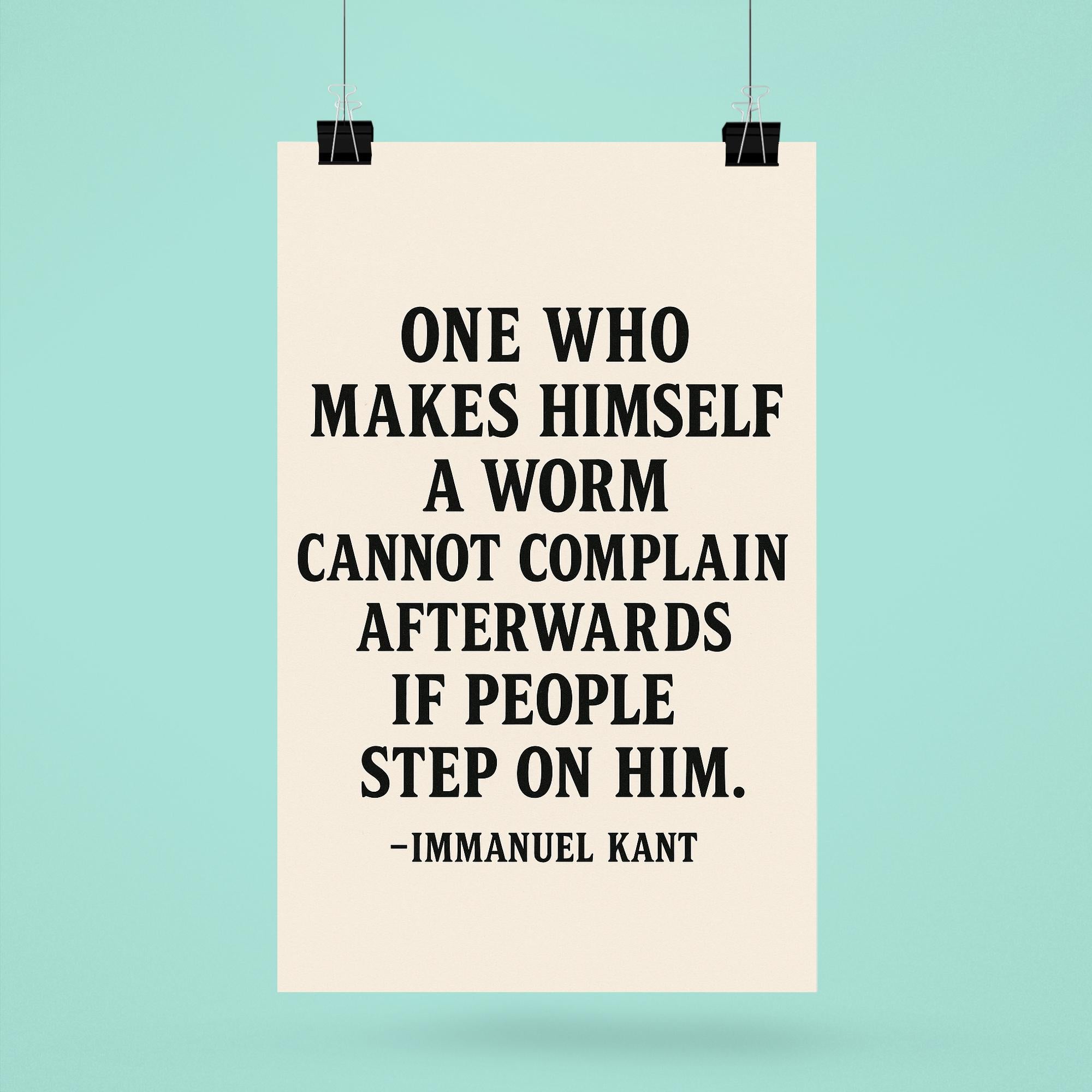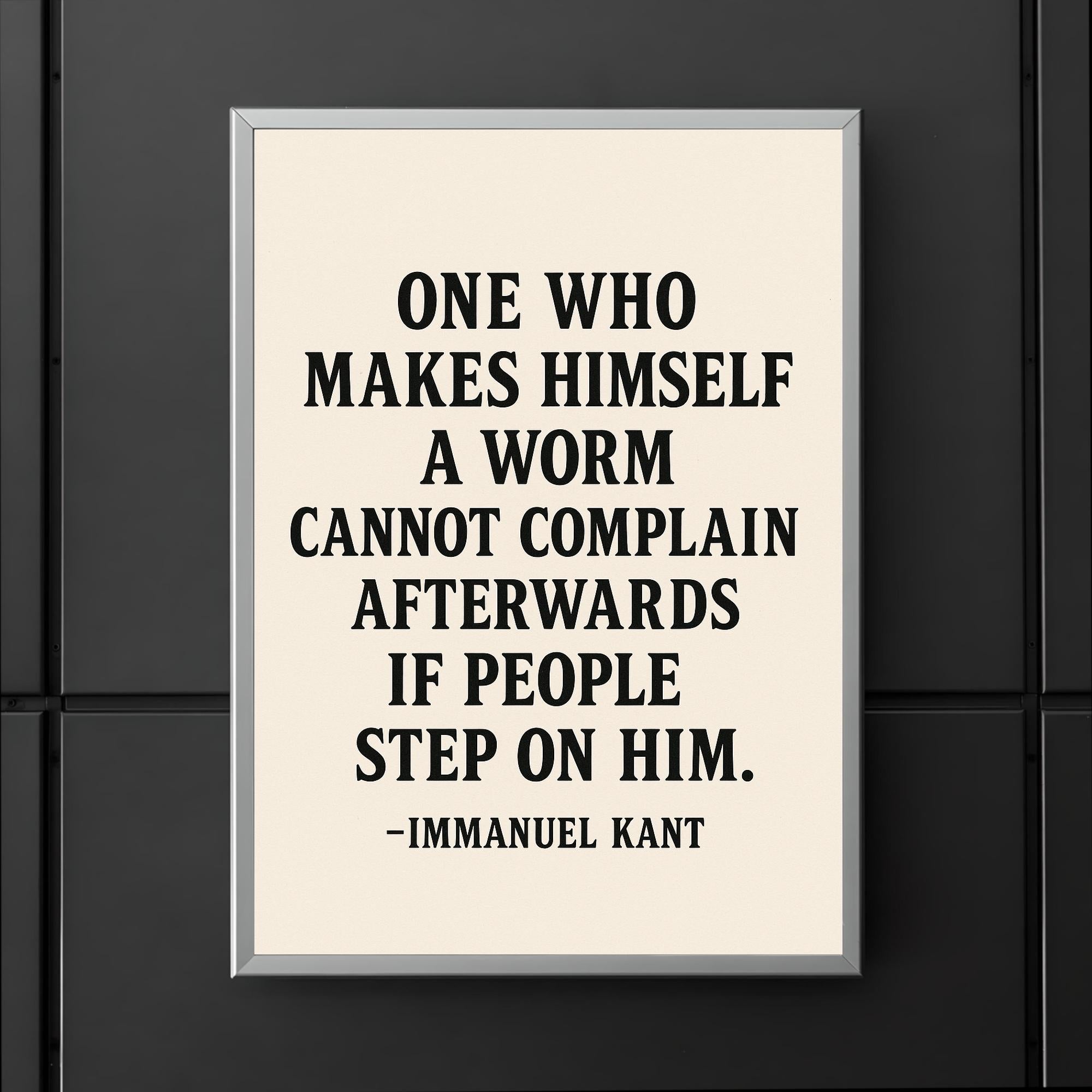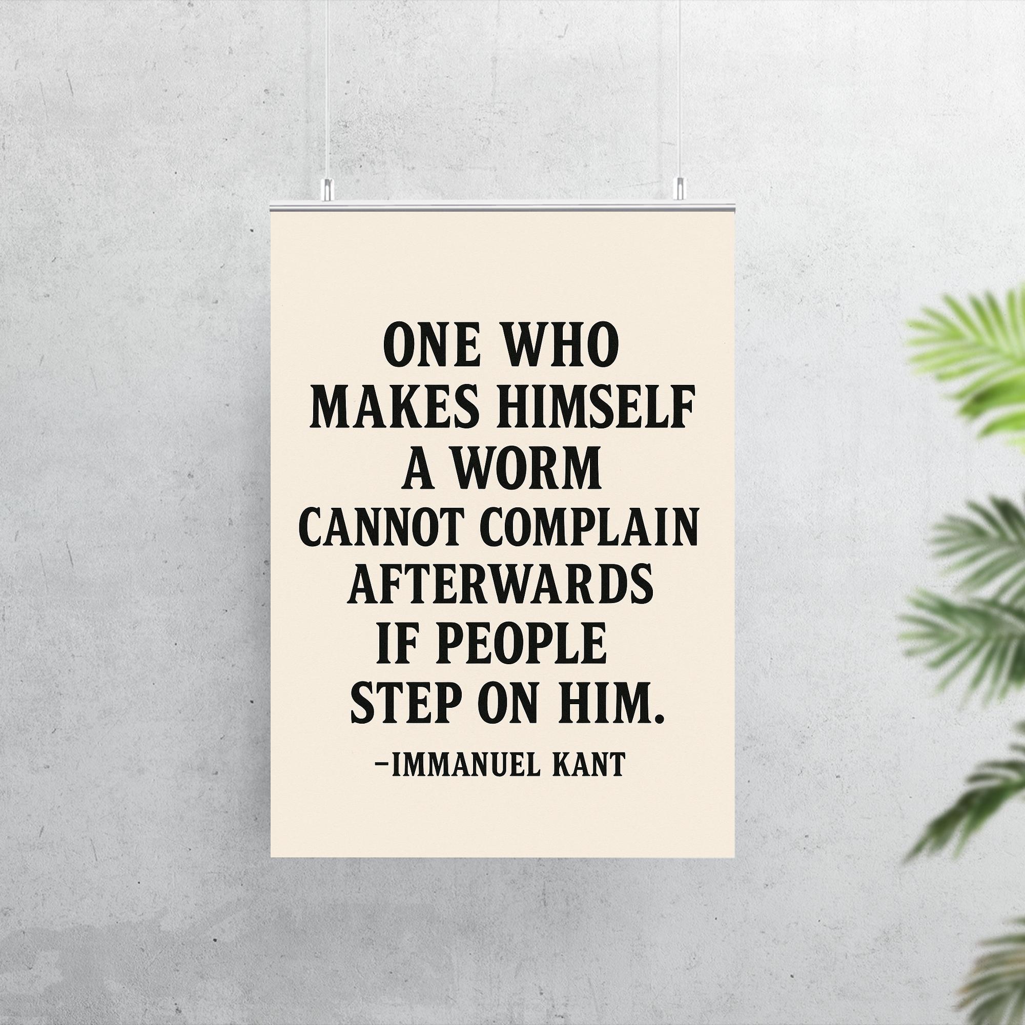 Channel the enduring wisdom of Immanuel Kant with this powerful poster, boldly featuring his unforgettable assertion: “One who makes himself a worm cannot complain afterwards if people step on him.” A daily reminder to value yourself, take up space, and inspire strength—perfect for any space where confidence and clarity matter most.