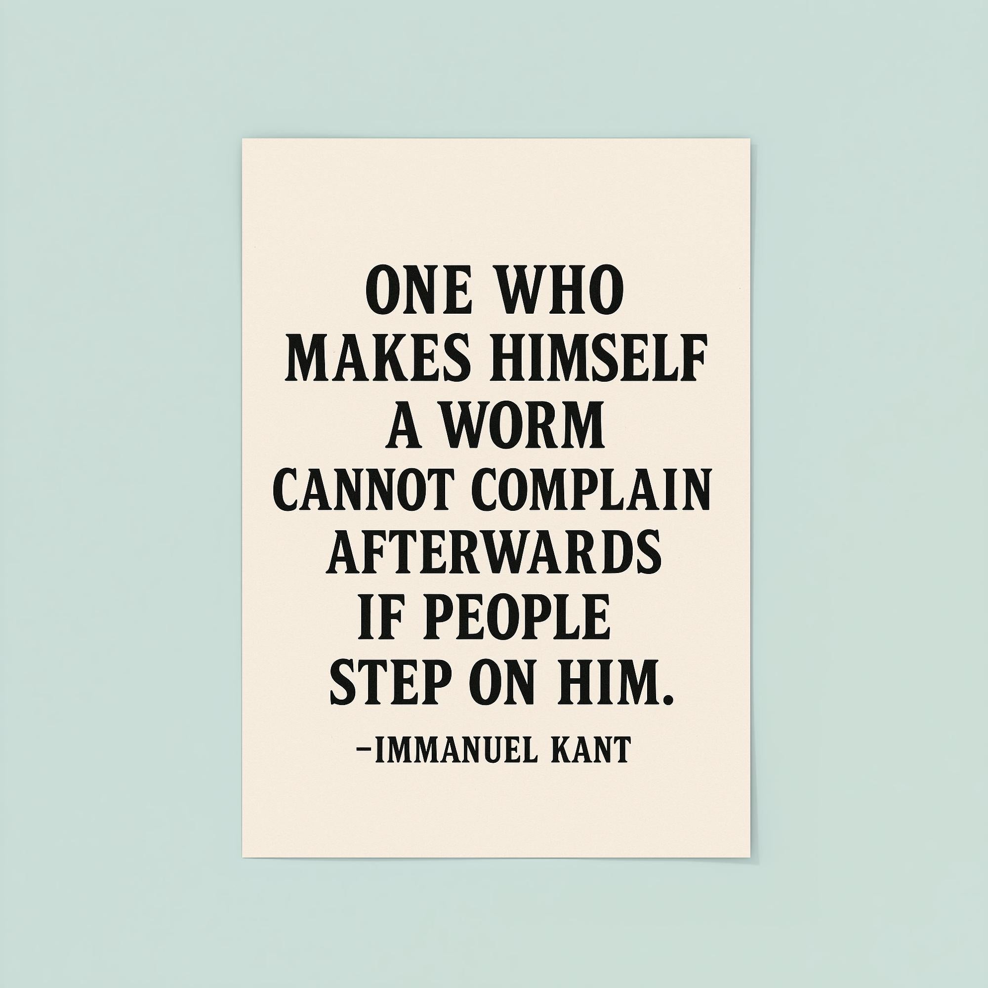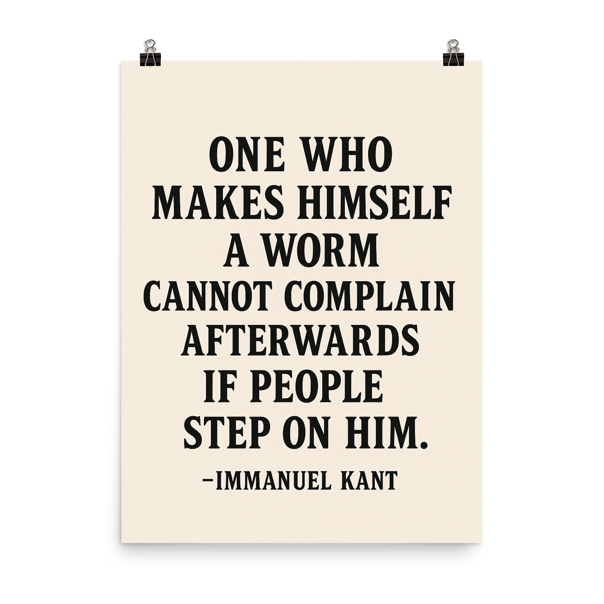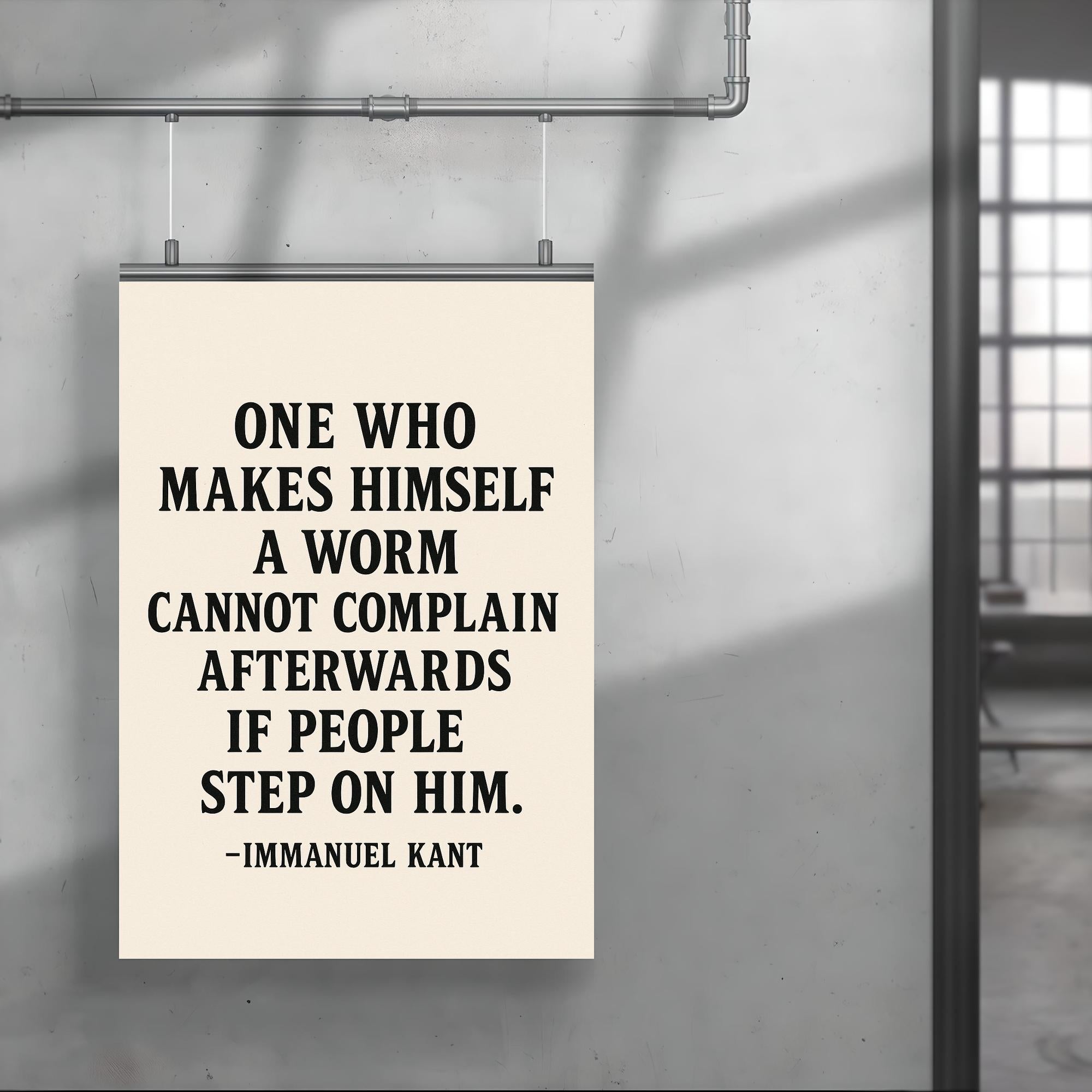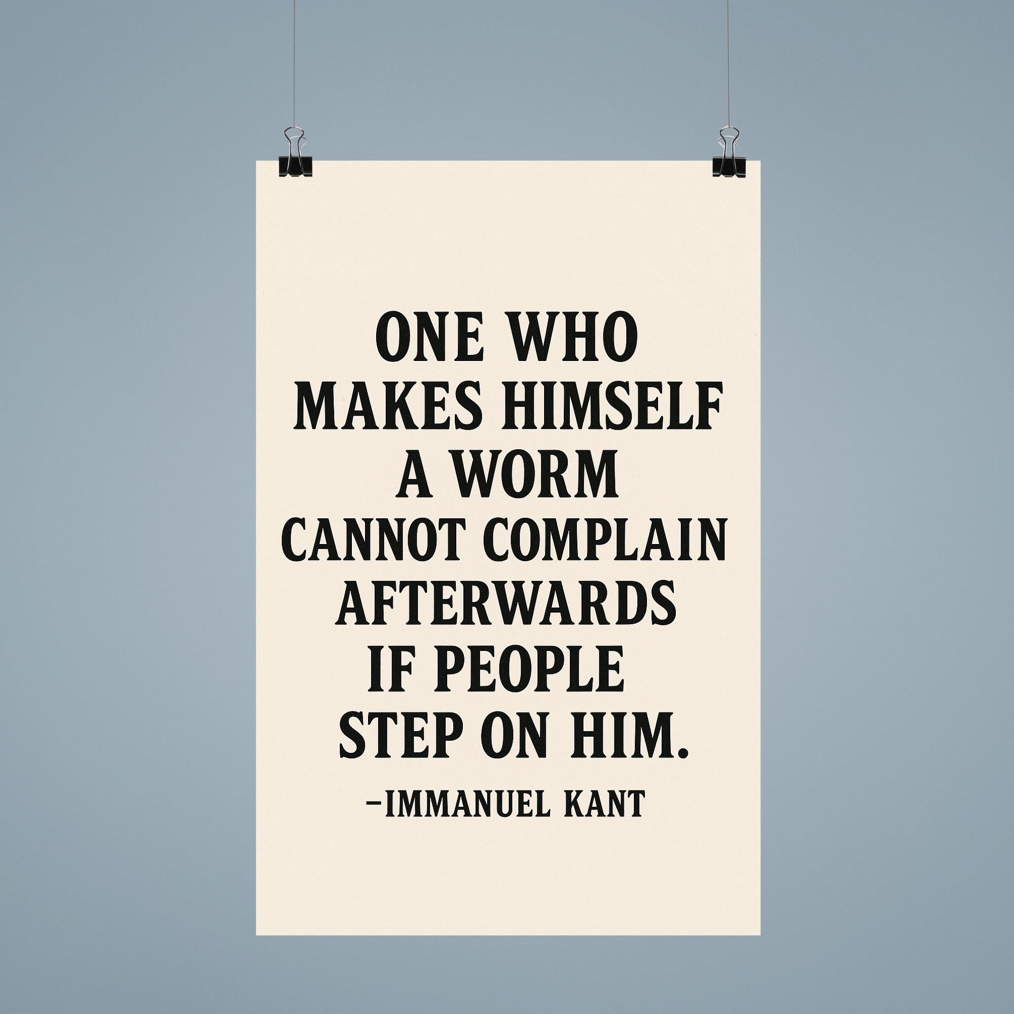 Channel the enduring wisdom of Immanuel Kant with this powerful poster, boldly featuring his unforgettable assertion: “One who makes himself a worm cannot complain afterwards if people step on him.” A daily reminder to value yourself, take up space, and inspire strength—perfect for any space where confidence and clarity matter most.