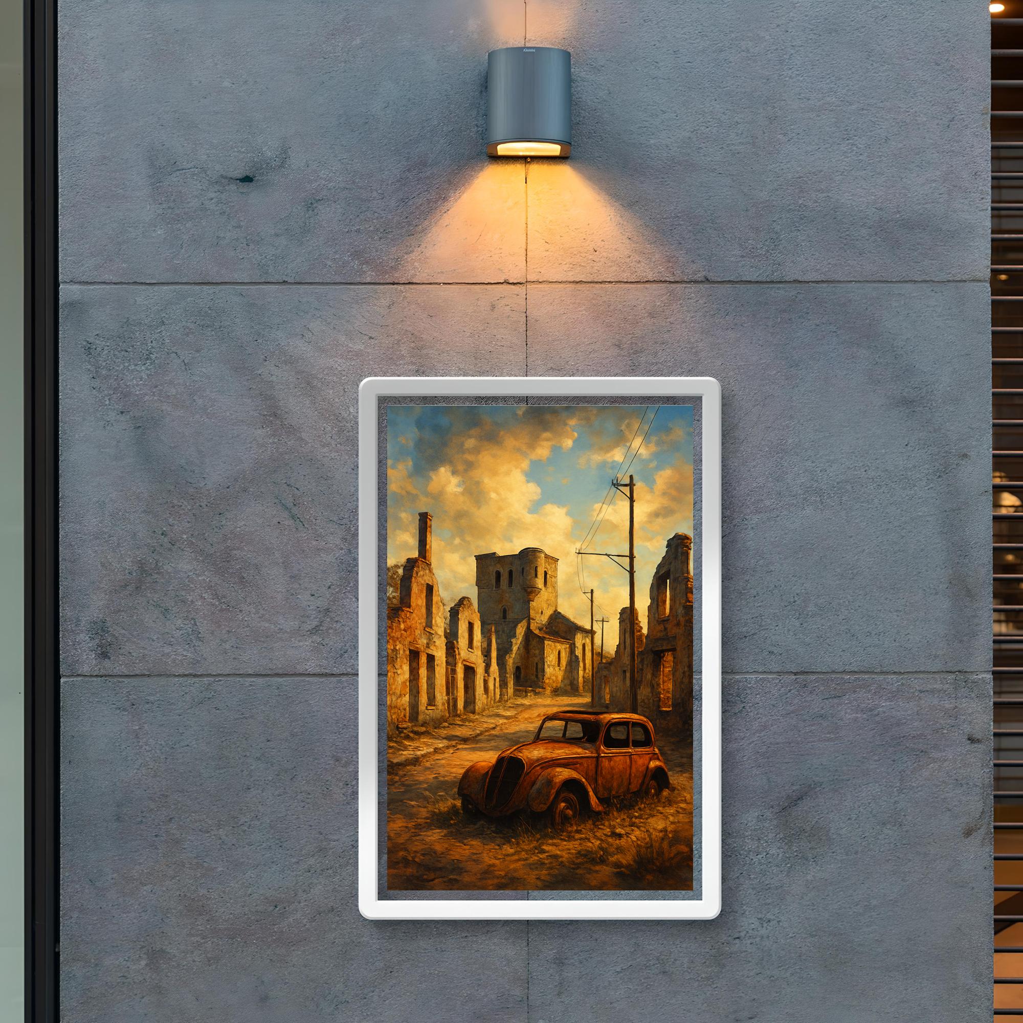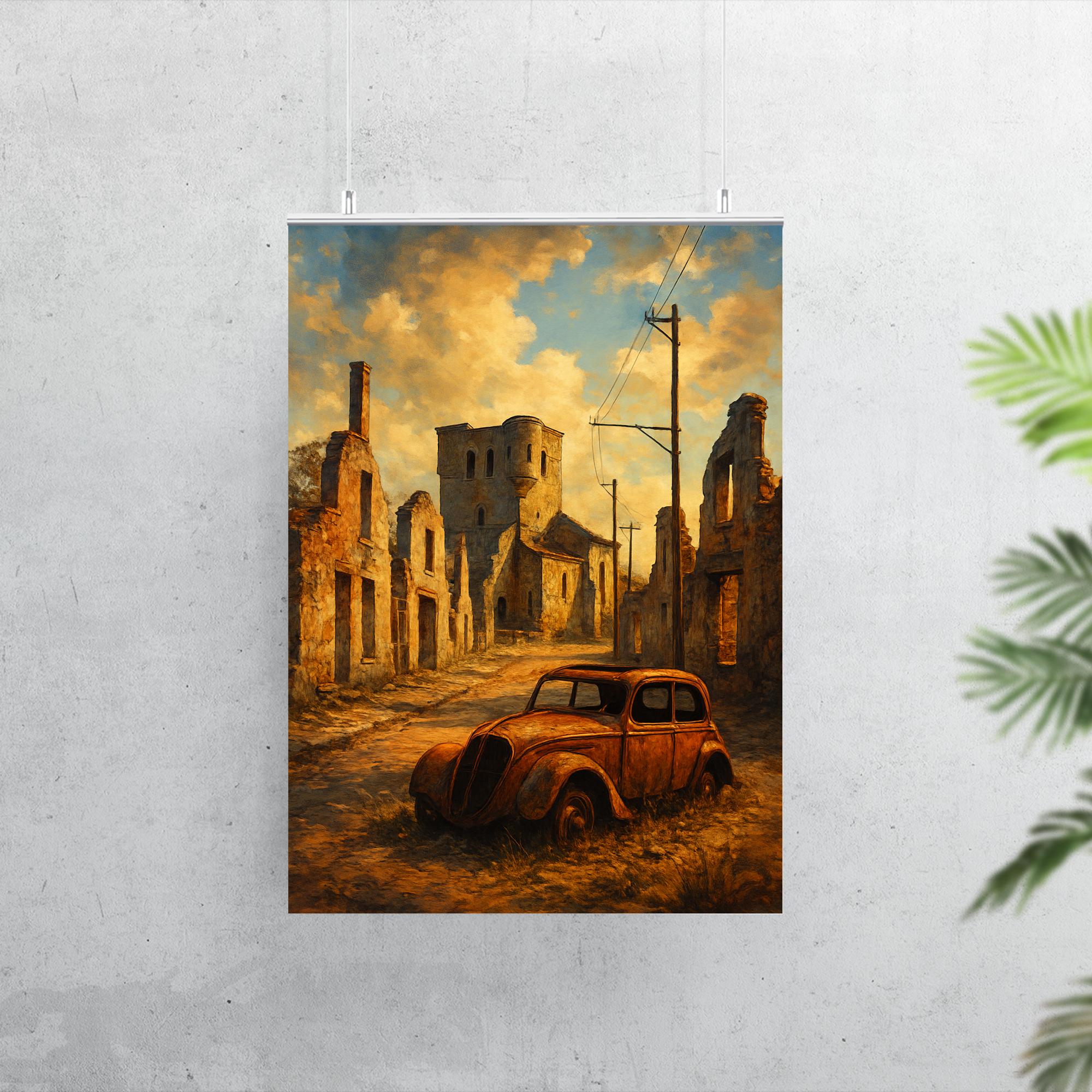 Capture a poignant moment of history with this striking poster of Oradour-sur-Glane, France. Honoring the memory of a village forever preserved in time, it serves as a powerful tribute to resilience and remembrance. Perfect for those who value meaningful art that tells a story beyond words.