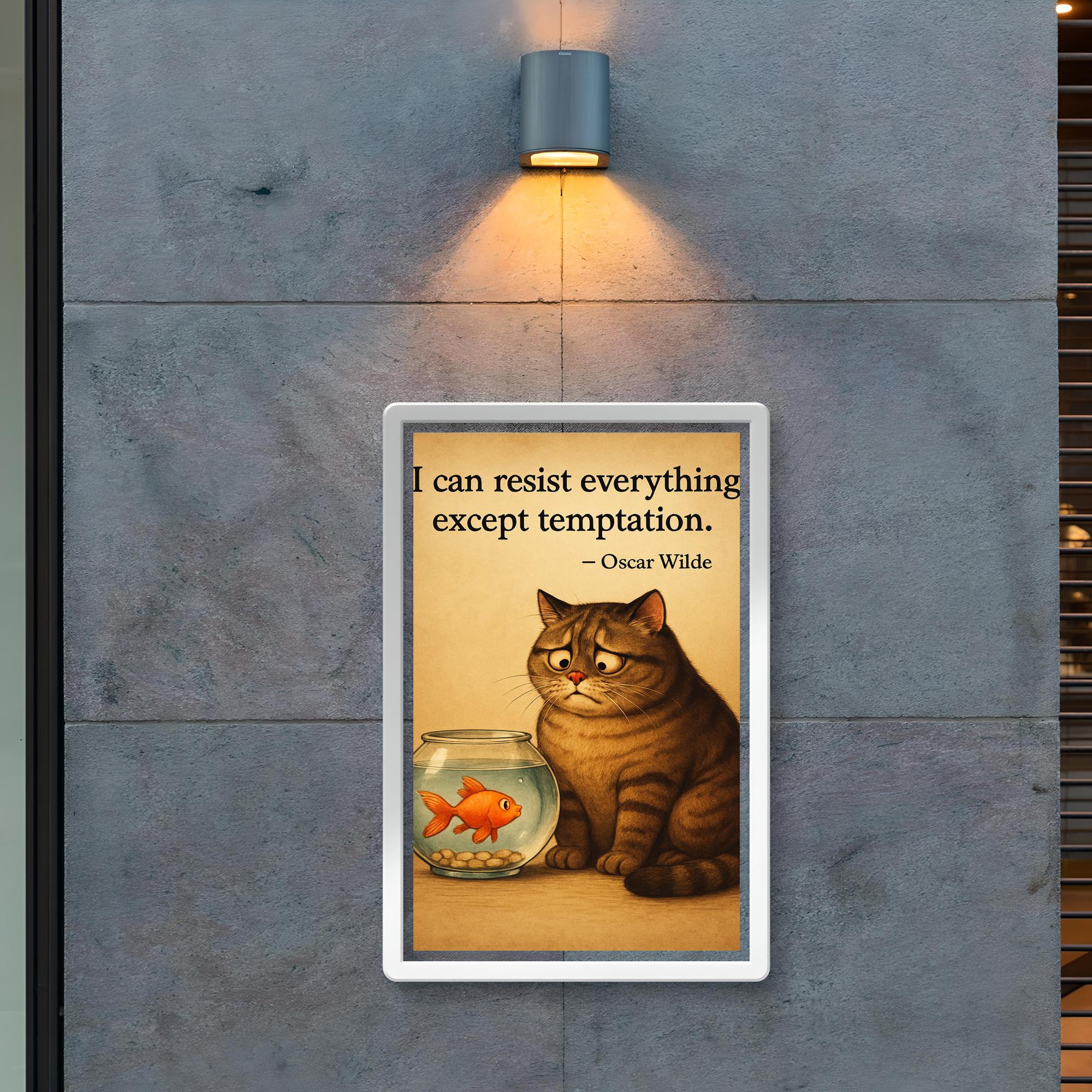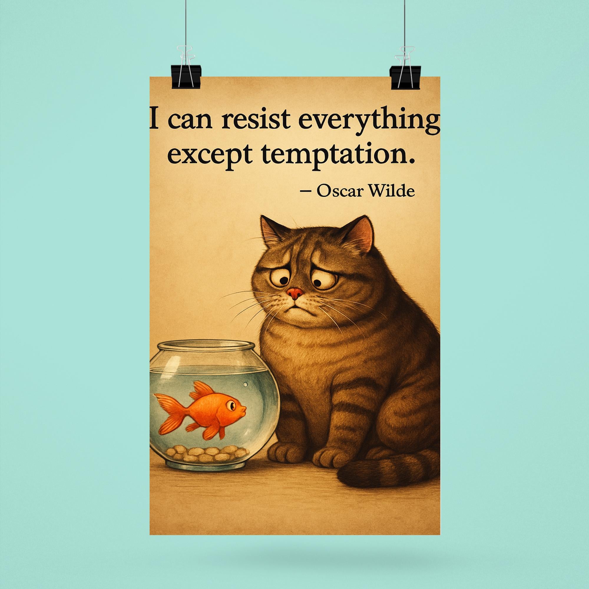 Embrace wit and willpower with this charming Oscar Wilde quote poster featuring a determined cat resisting a tempting fishbowl. Perfect for inspiring focus and humor in any space, it’s a delightful reminder that sometimes, true strength lies in self-control. Add this stylish, thought-provoking piece to your decor and let Wilde’s words fuel your daily motivation.