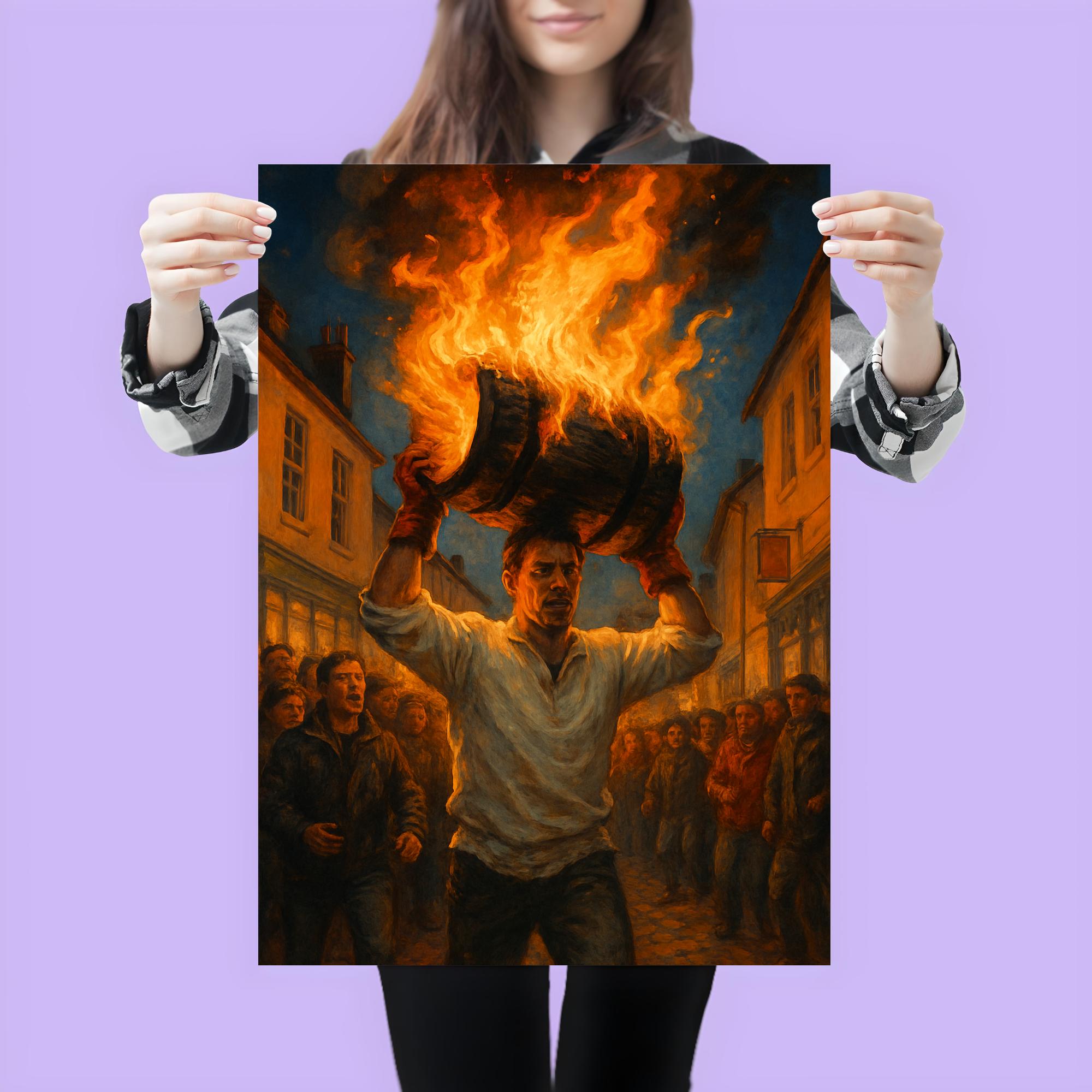Celebrate the fiery spirit of Ottery St Mary with this striking poster capturing the iconic Tar Barrels tradition. Perfect for history enthusiasts and festival lovers alike, it brings a piece of England’s unique heritage into your home. A bold tribute to one of the most thrilling events you can witness, this poster ignites passion and pride with every glance.