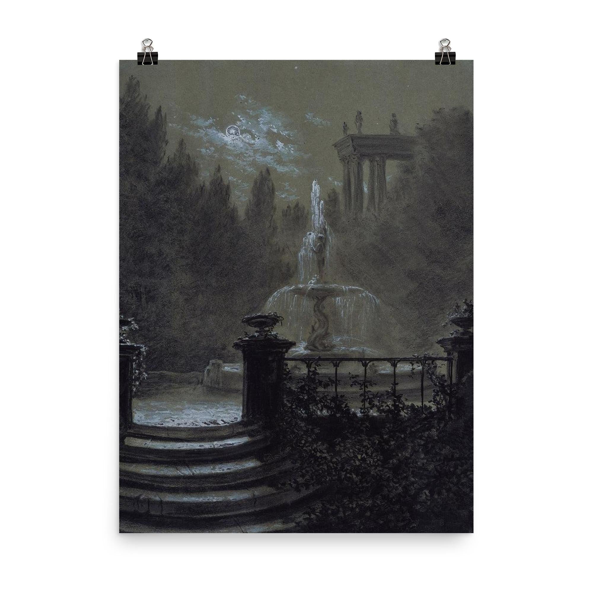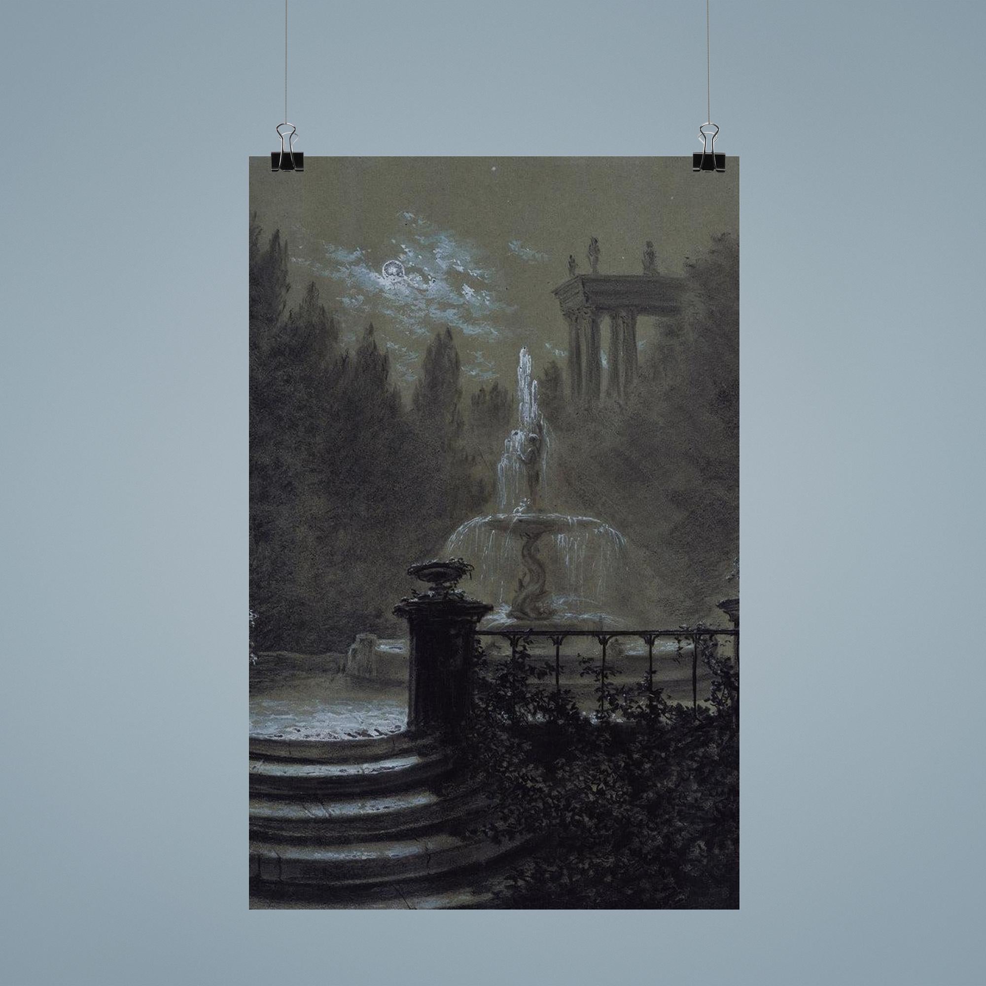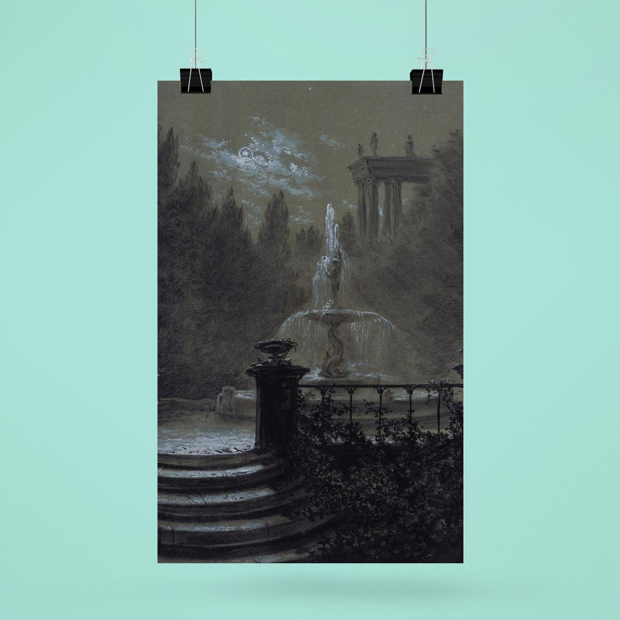 Moonlight Park Fountain Poster Print by Carl Gustav Carus 1851 – Vintage Romantic Wall Art for Elegant Home Décor