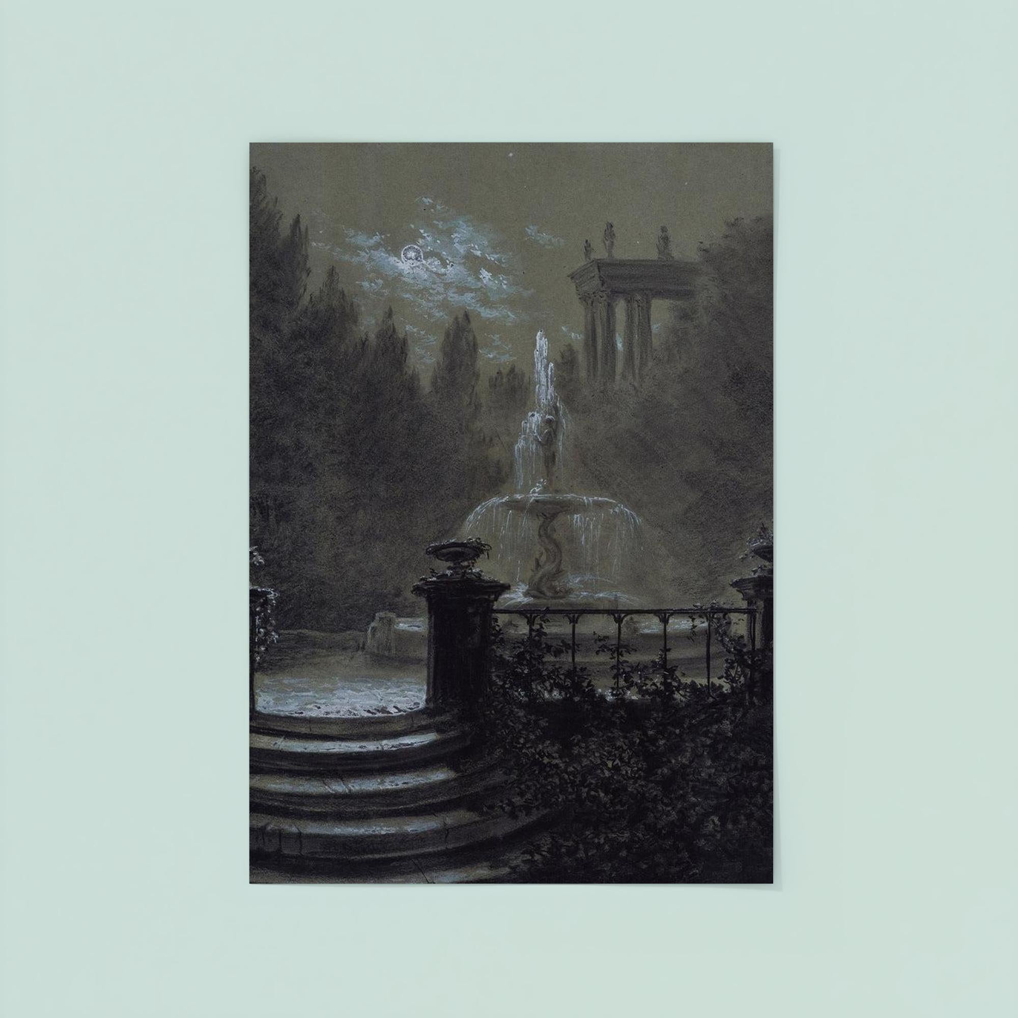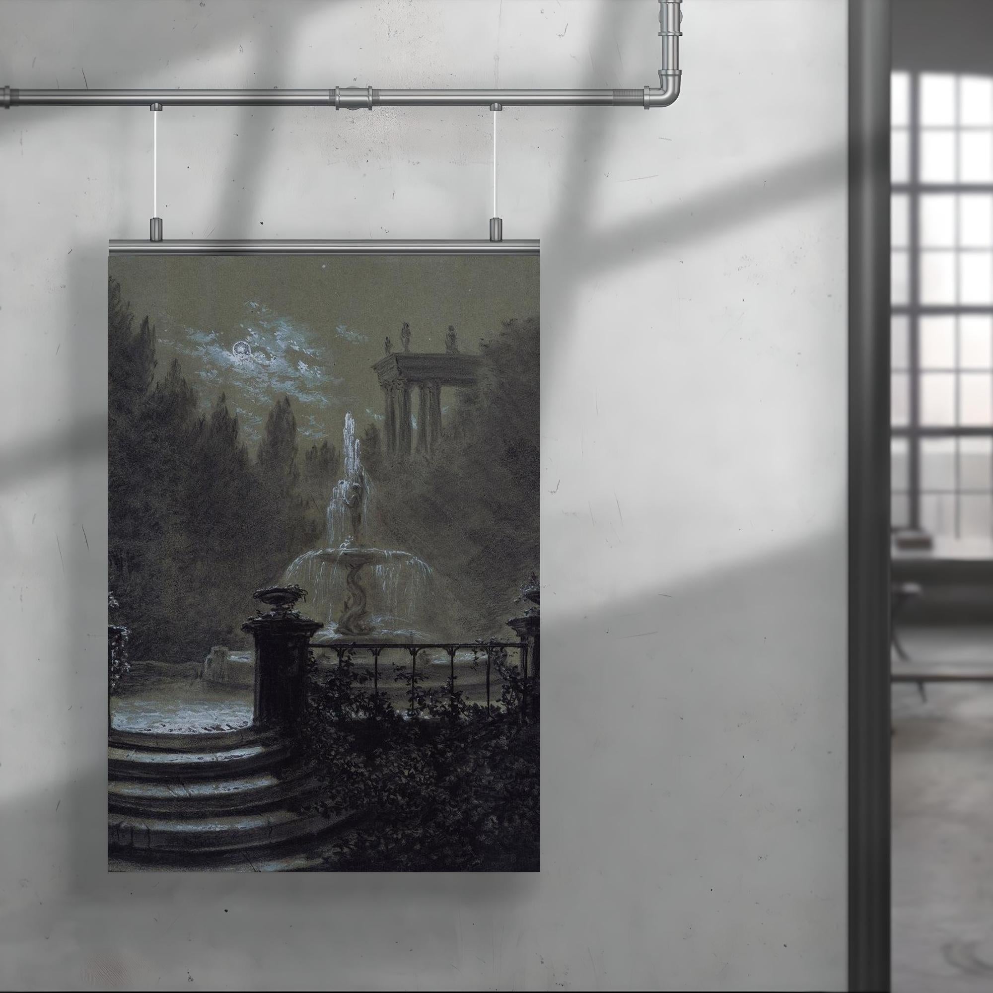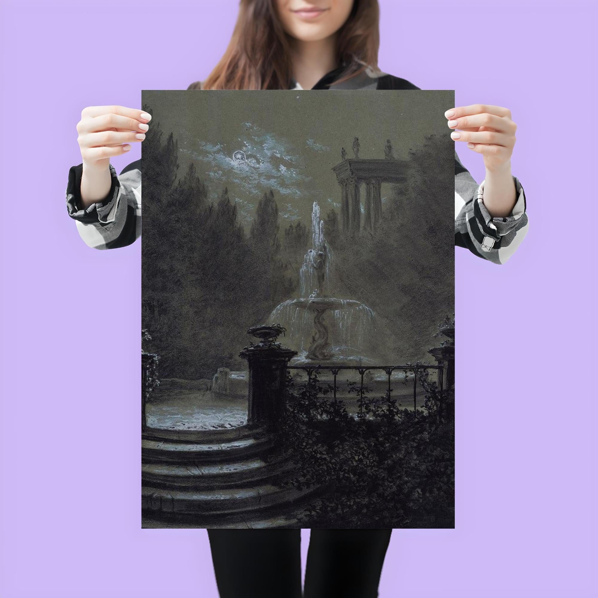 Moonlight Park Fountain Poster Print by Carl Gustav Carus 1851 – Vintage Romantic Wall Art for Elegant Home Décor