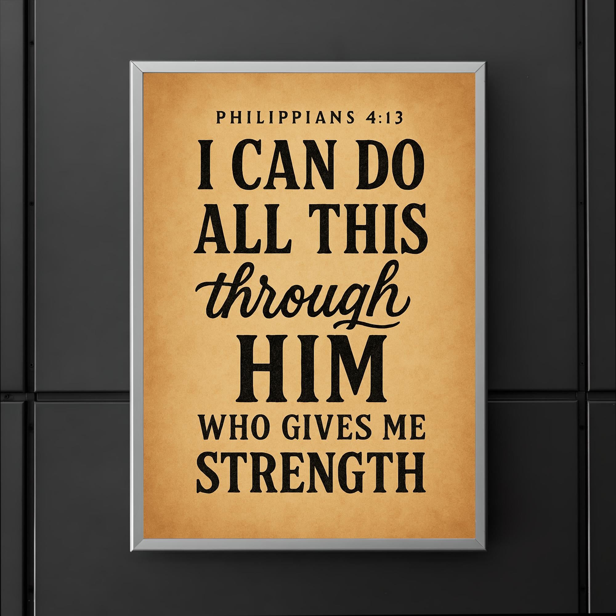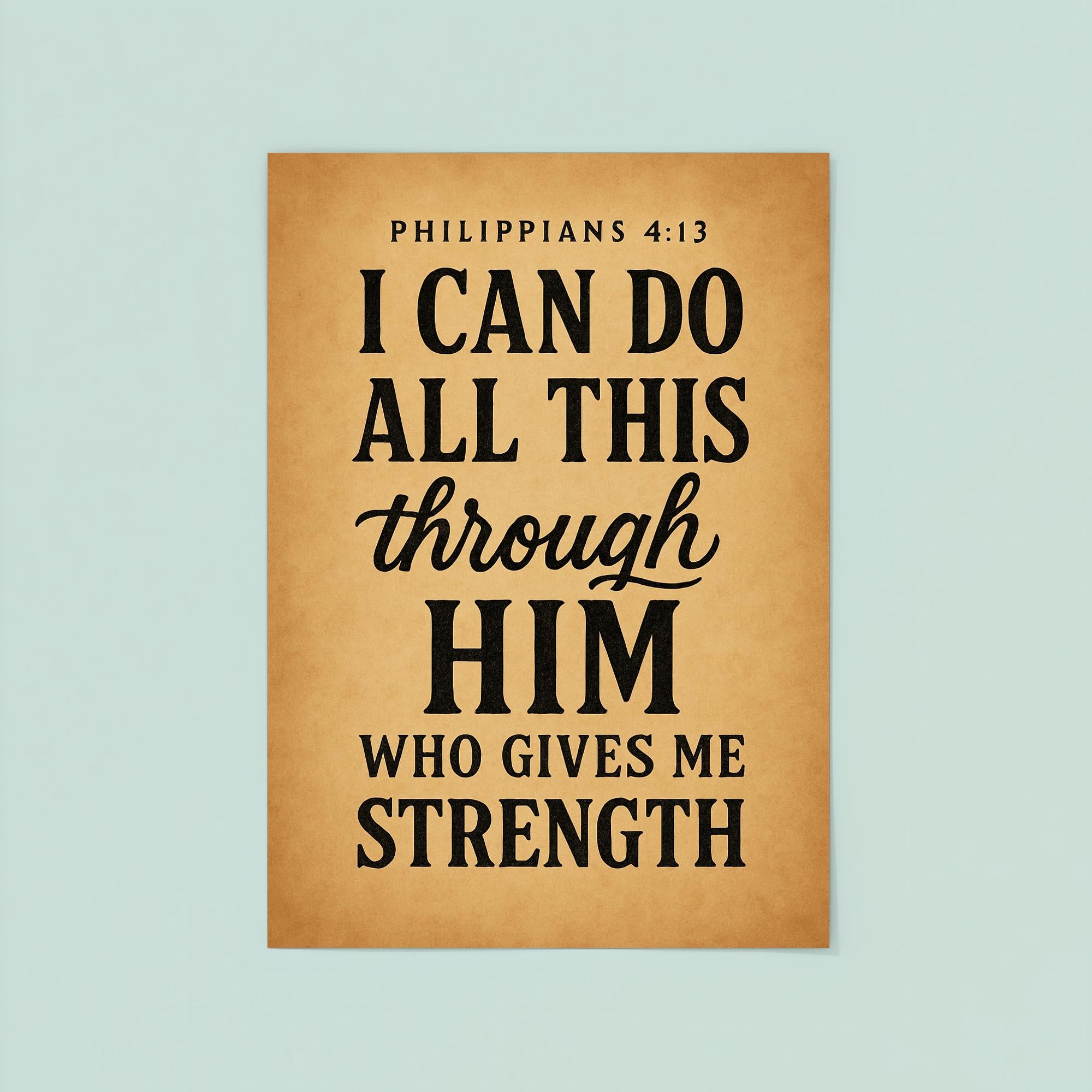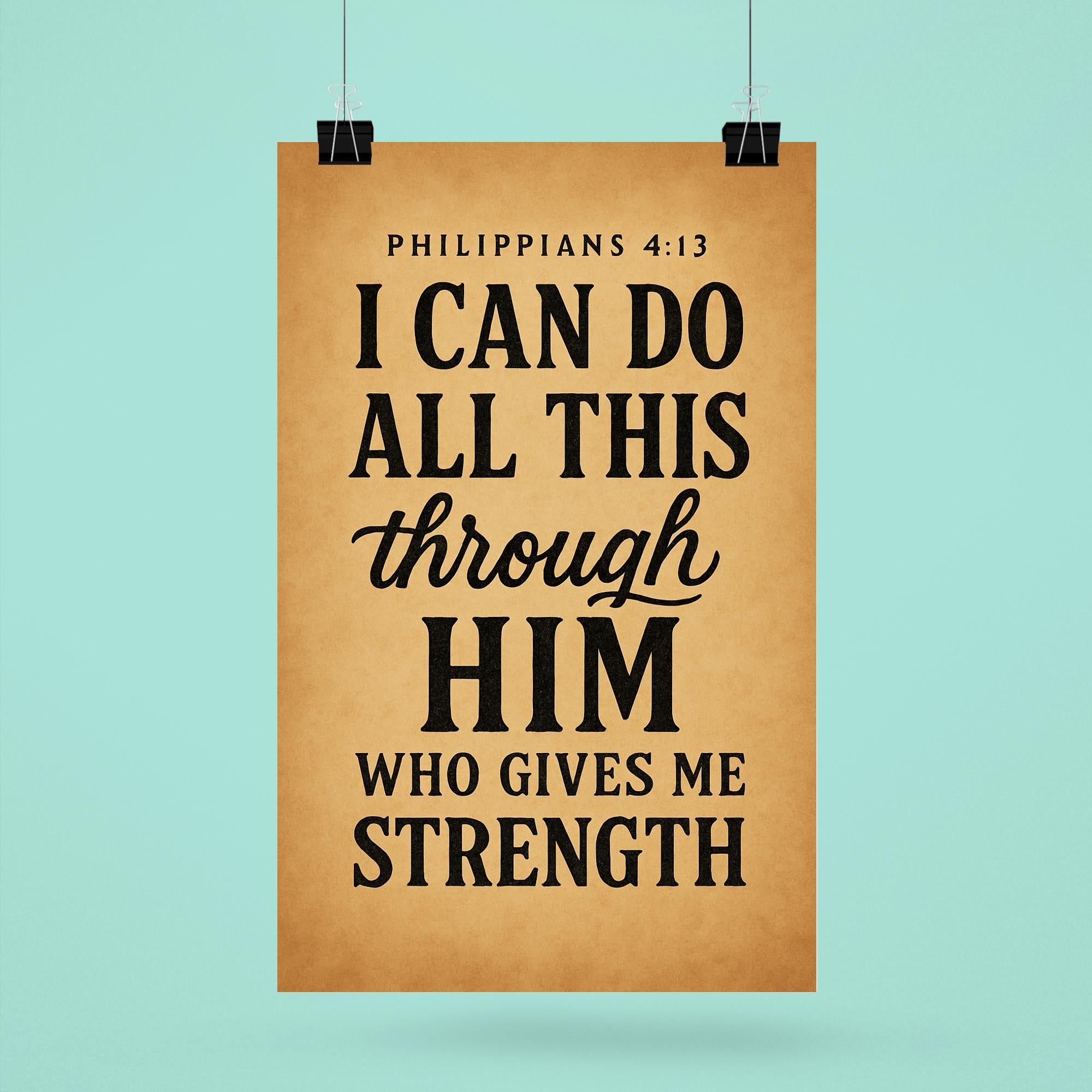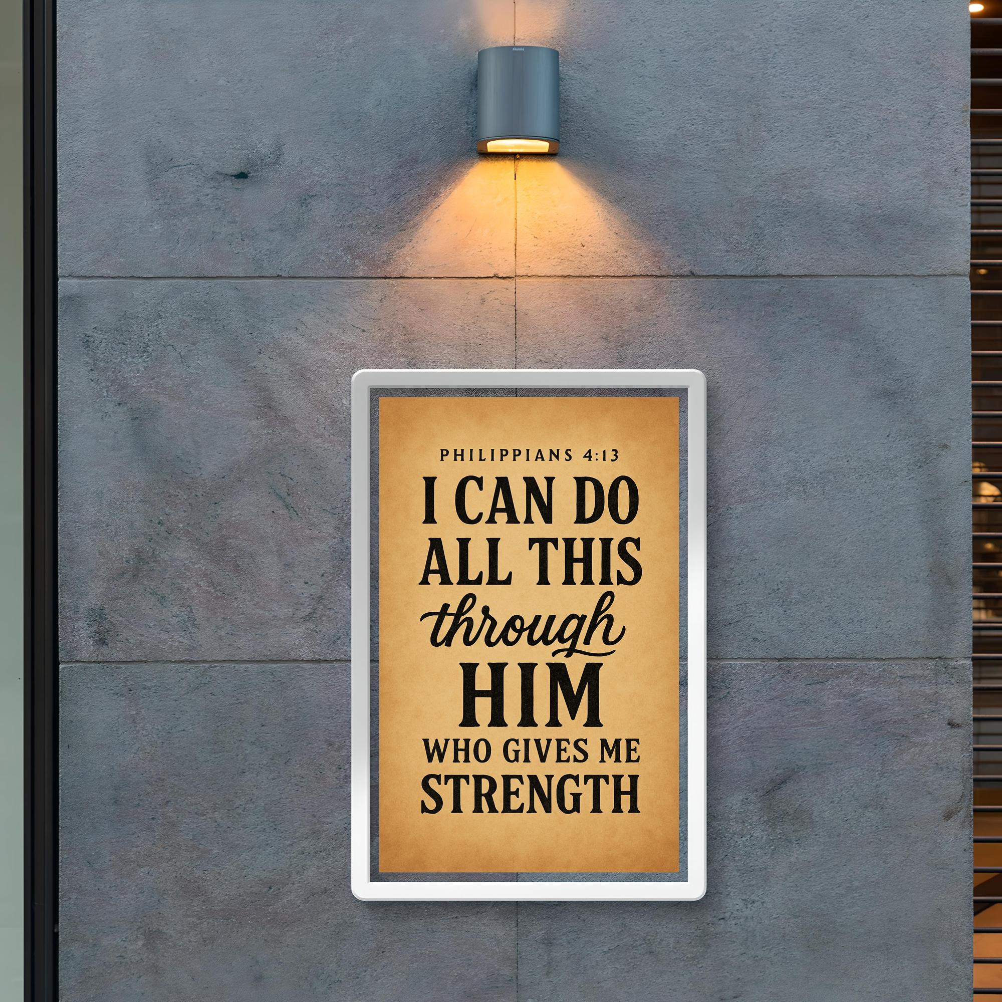 Draw daily inspiration from the timeless promise of Philippians 4:13: "I can do all this through him who gives me strength." This powerful poster serves as a steadfast reminder of resilience and faith, uplifting your spirit and empowering you to face any challenge with confidence and grace. Perfect for any space where motivation and encouragement are needed most.
