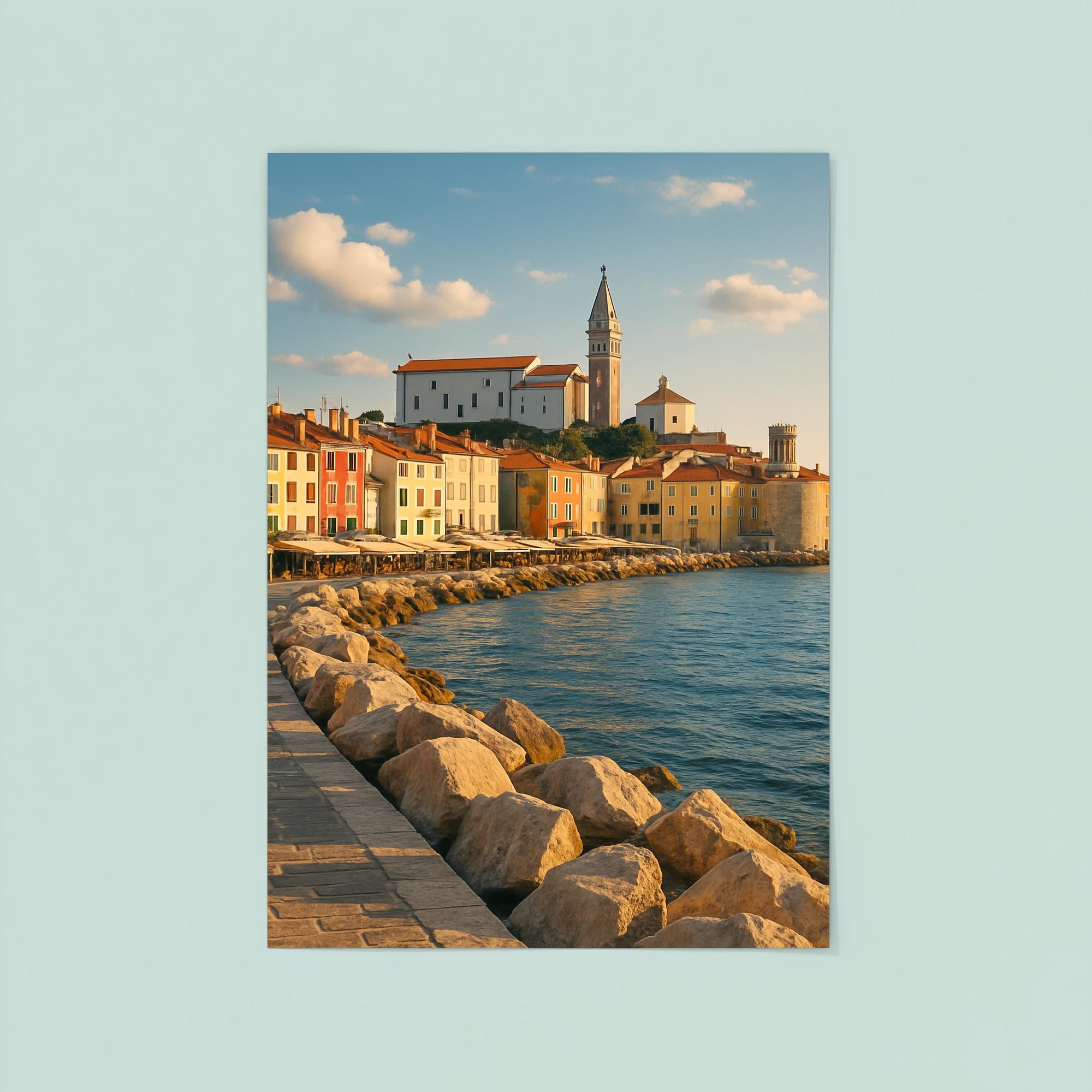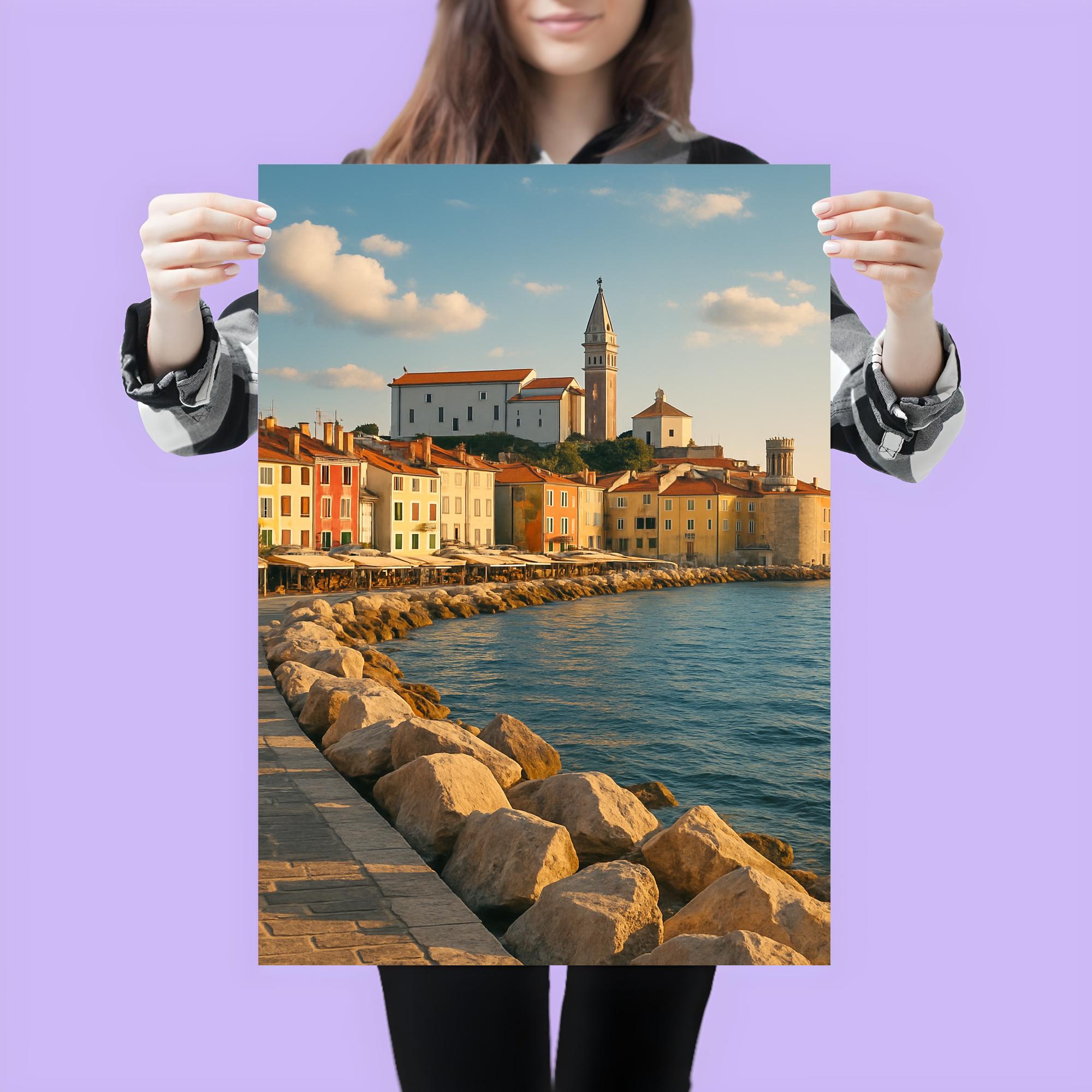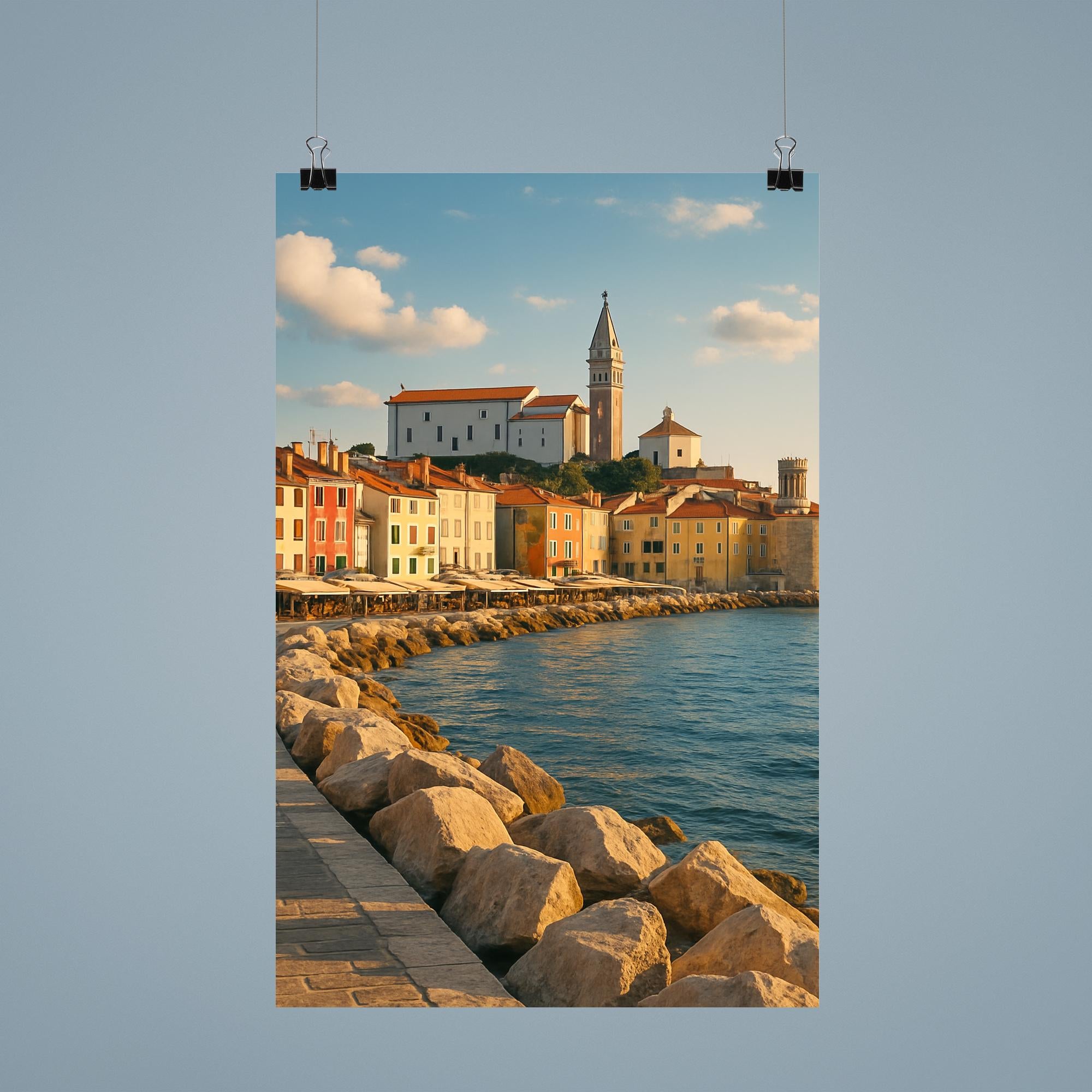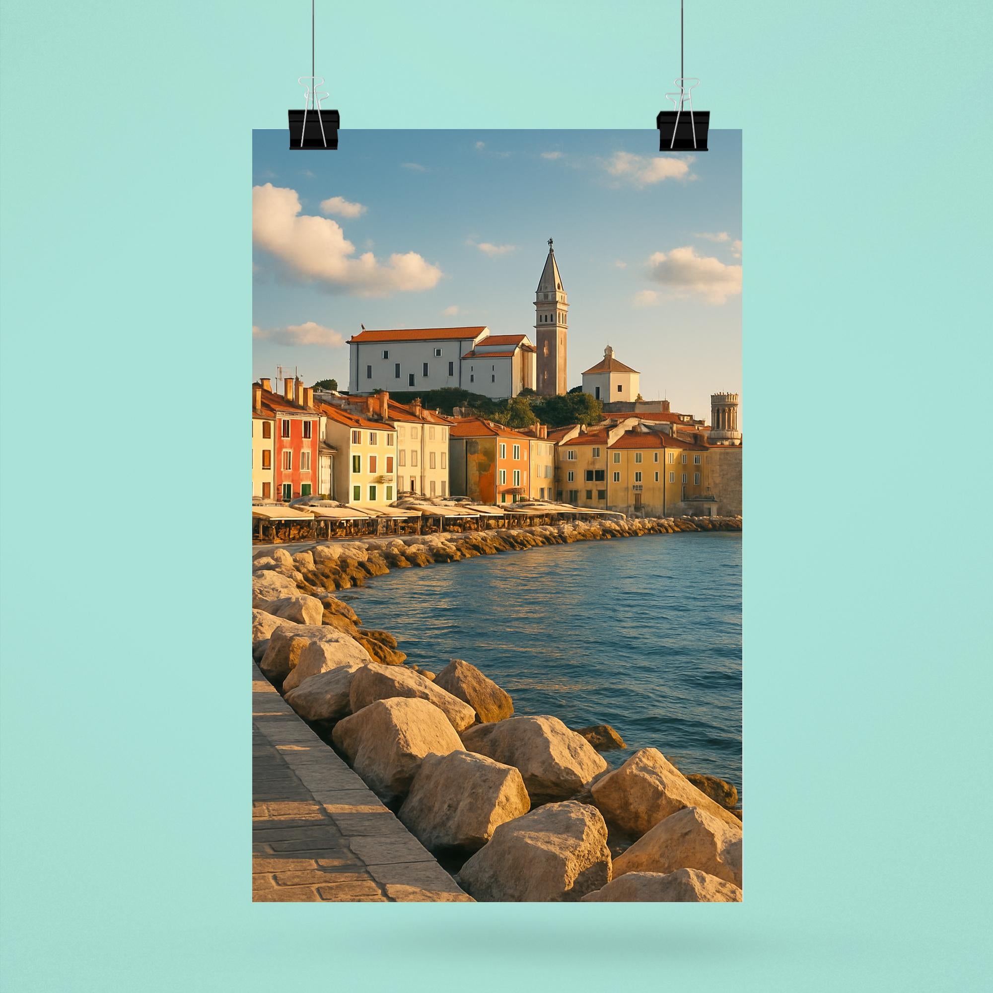 Transform your space with this stunning poster capturing the timeless charm of Piran Old Town Seafront, Slovenia. The artwork beautifully highlights the serene coastal atmosphere and historic architecture, inviting a sense of wanderlust and tranquility into your home or office. Perfect for anyone who cherishes scenic beauty and European heritage.