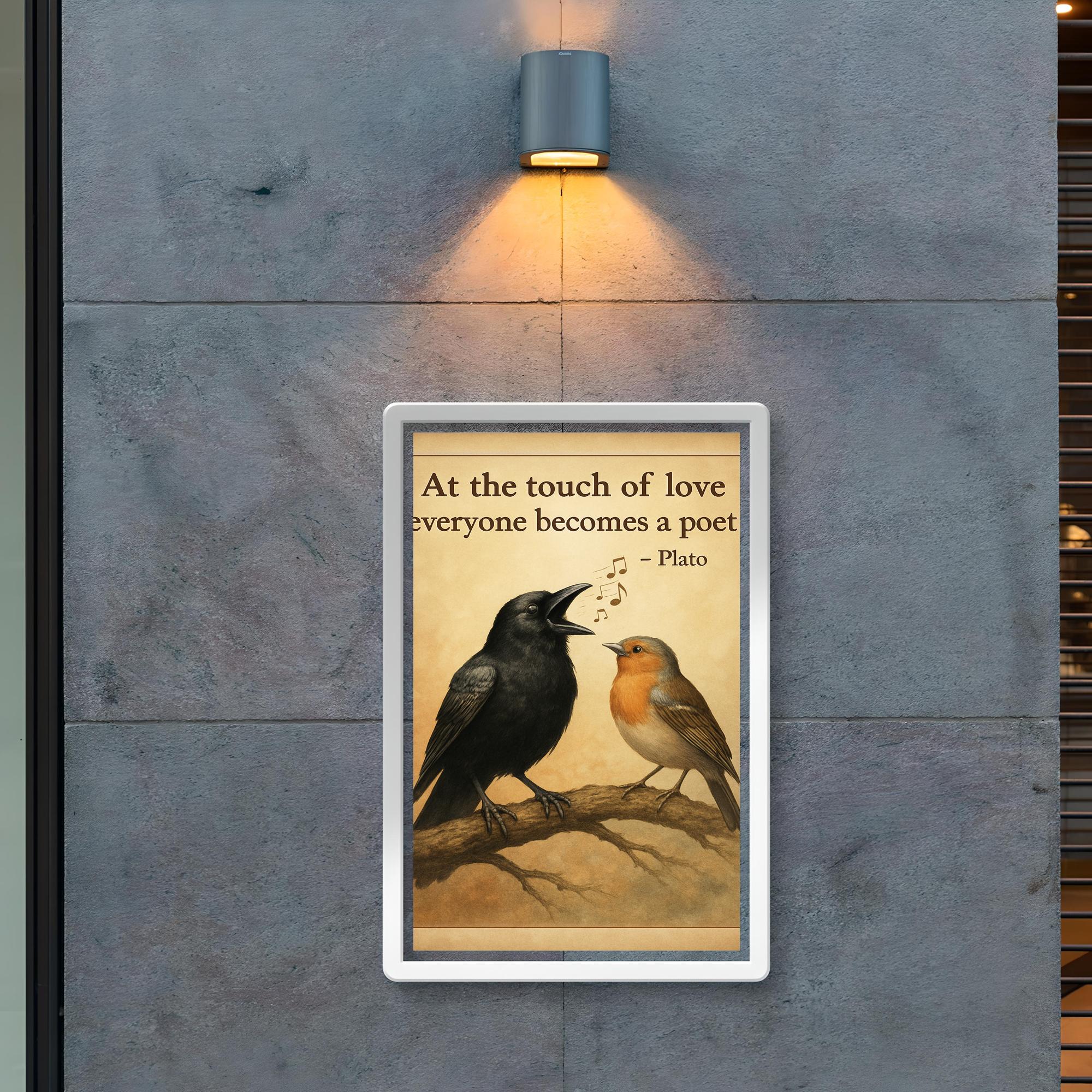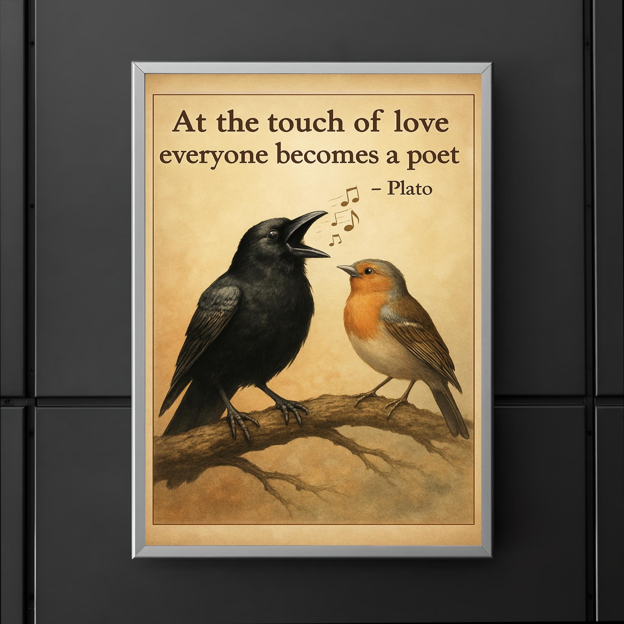 Elevate your space with timeless wisdom captured in this striking Plato quote poster. "At the touch of love, everyone becomes a poet; tone deaf crow singing beautifully" inspires soulful reflection and celebrates the transformative power of love. Perfect for any room, this poster invites you to embrace your inner poet every day.