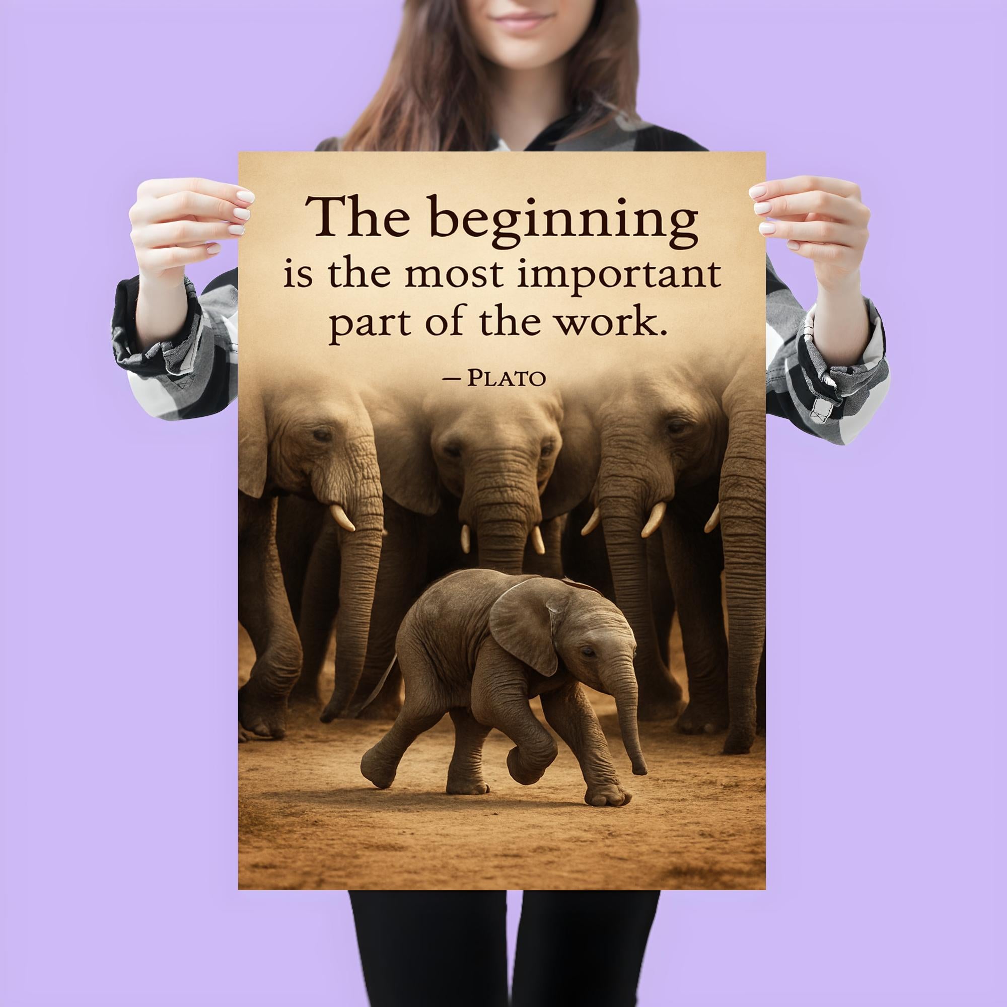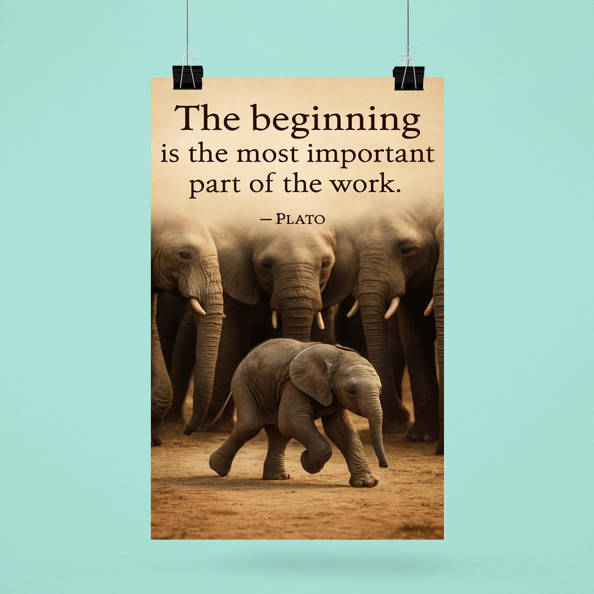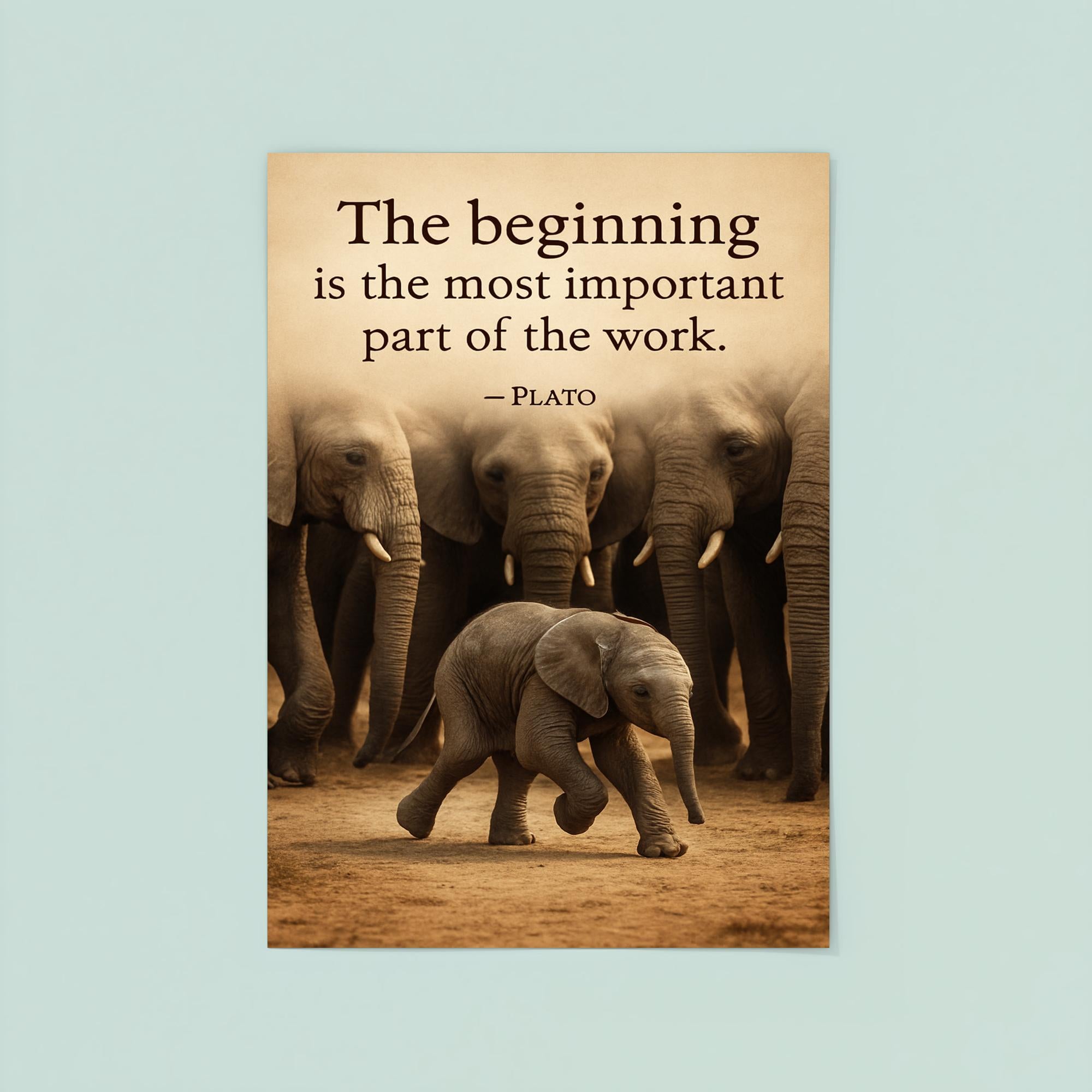 Capture the wisdom of journey and growth with this inspiring poster featuring Plato’s timeless quote alongside a baby elephant taking its first step, watched by its herd. Perfect for sparking motivation and reflection, it serves as a gentle reminder of courage, support, and the power of new beginnings in every step we take.