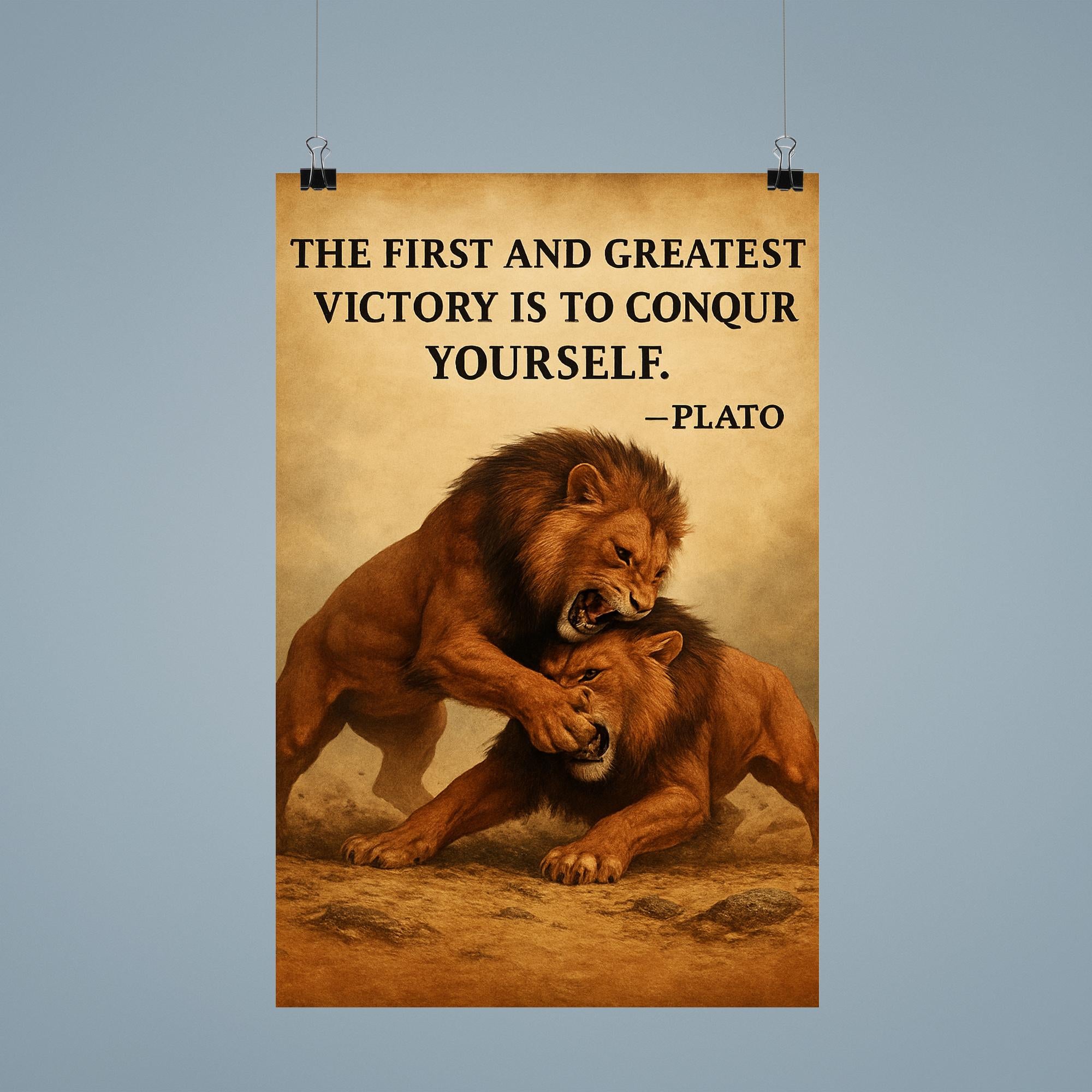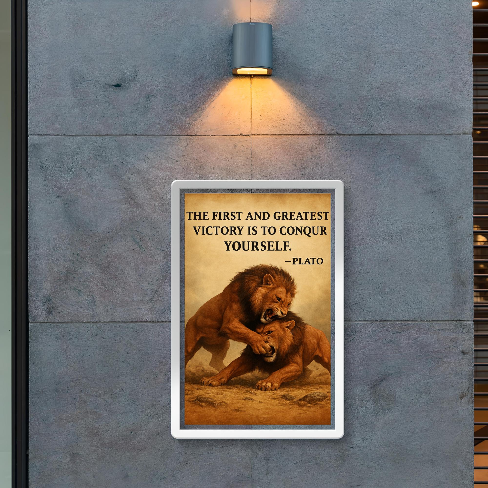 Transform your space with a powerful reminder from Plato: "The first and greatest victory is to conquer yourself." This striking poster captures the essence of inner strength and discipline, inspiring you every day to master your own challenges before facing the world. Ideal for anyone passionate about personal growth, philosophy, or the relentless pursuit of self-mastery.