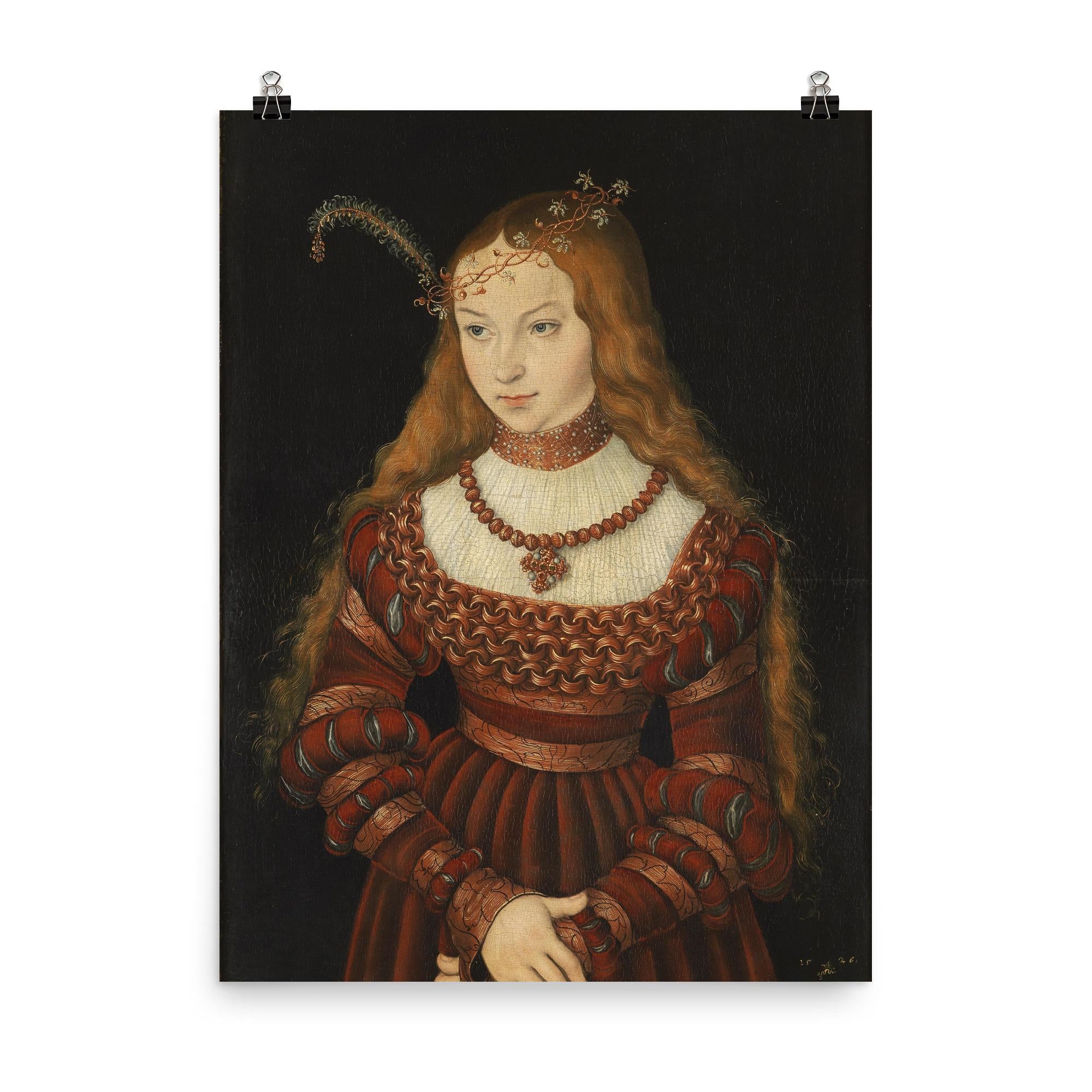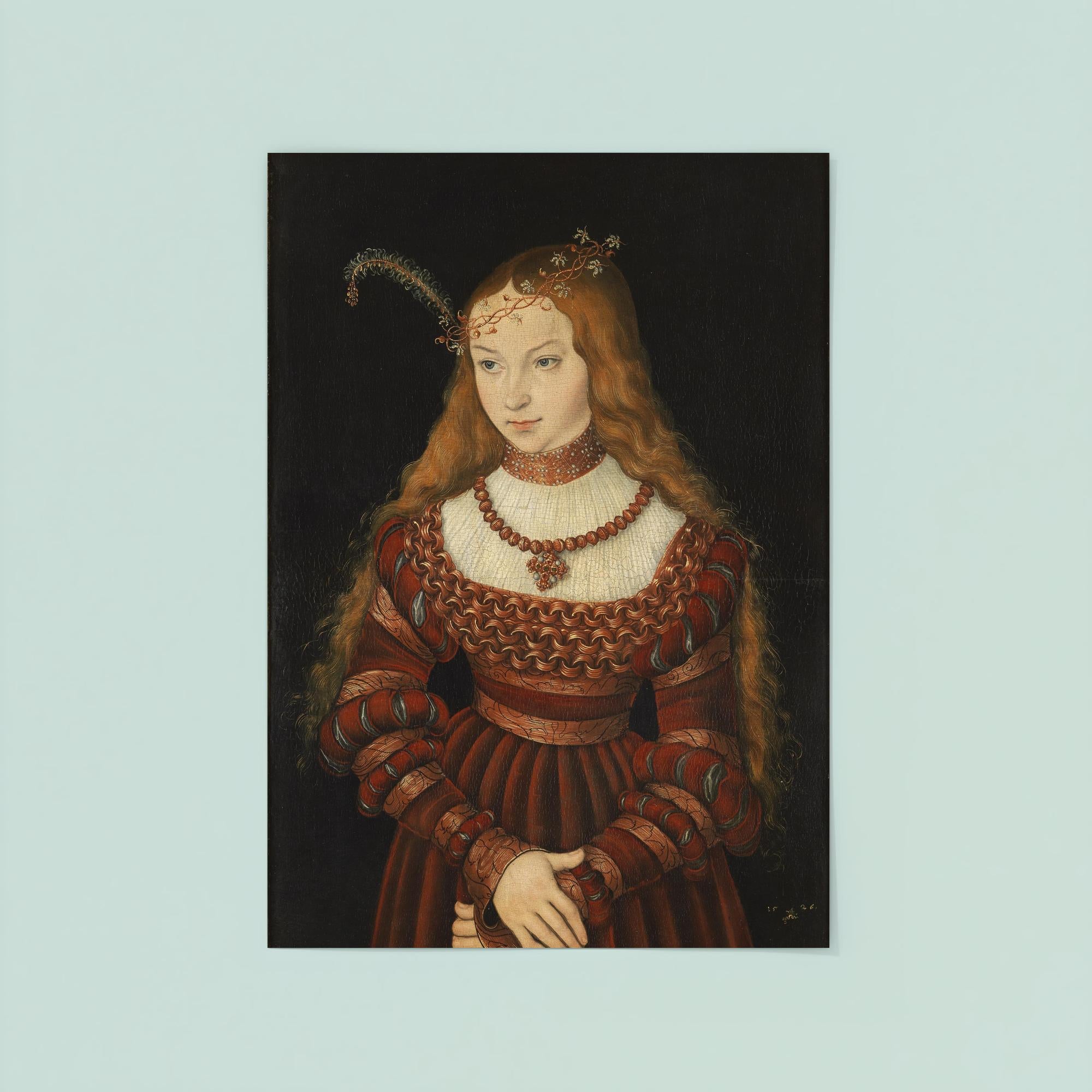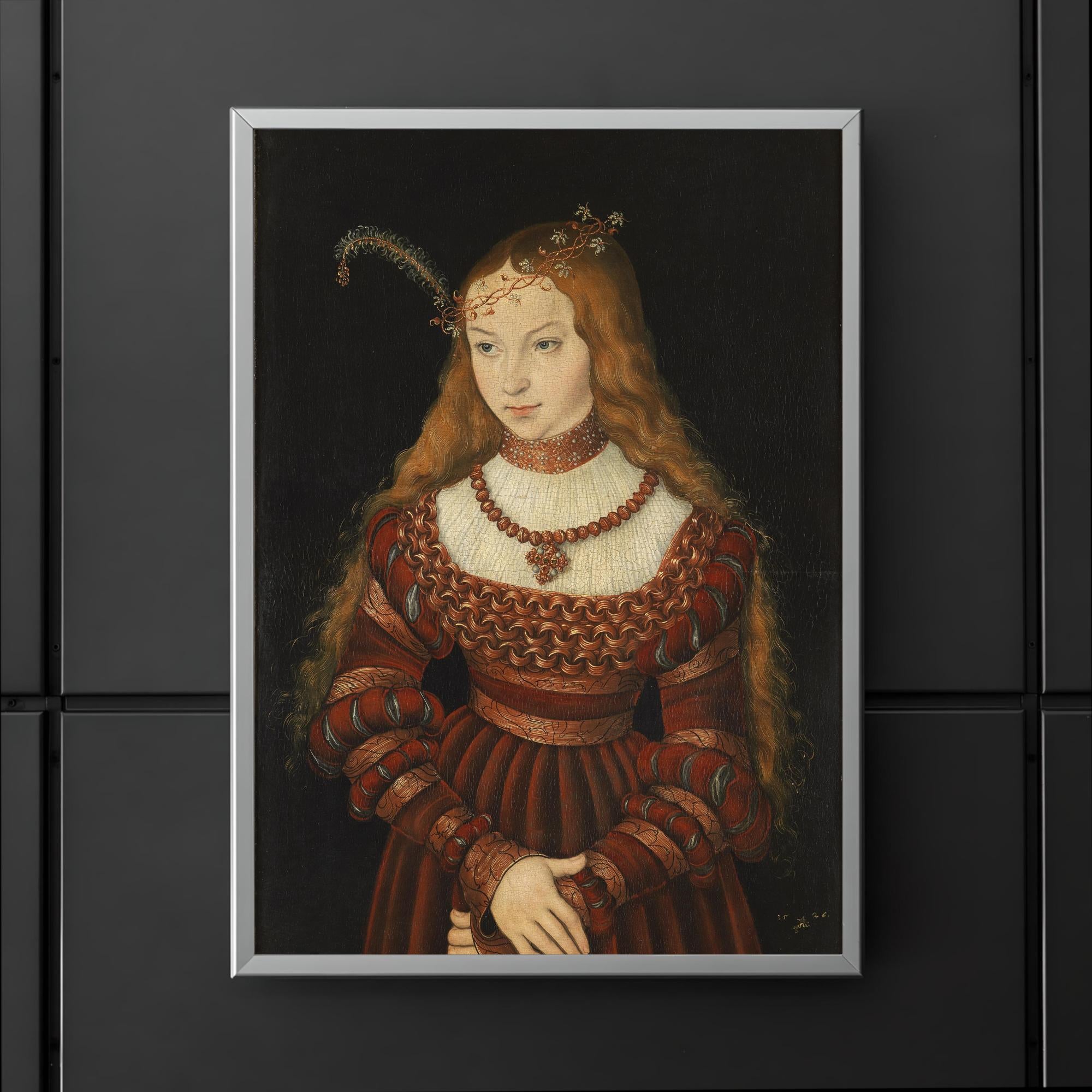 Elevate your space with this timeless poster of Portrait of Princess Sibylle of Cleve by Lucas Cranach the Elder. Capturing the refined elegance and poised grace of Renaissance nobility, this artwork brings a touch of history and artistry to any room. Perfect for lovers of classic portraiture, it invites you to gaze into a moment of serene beauty crafted by one of the era’s master painters.