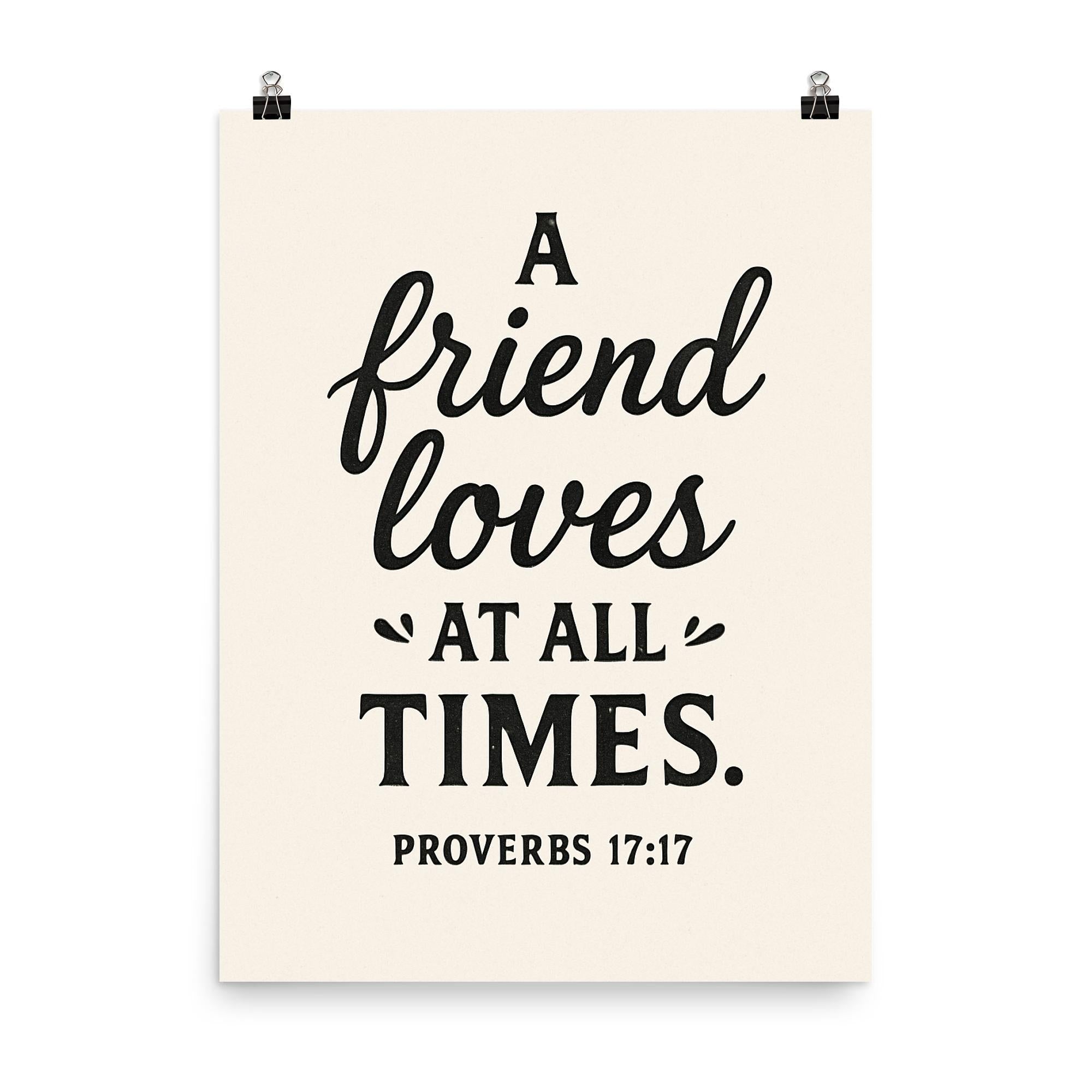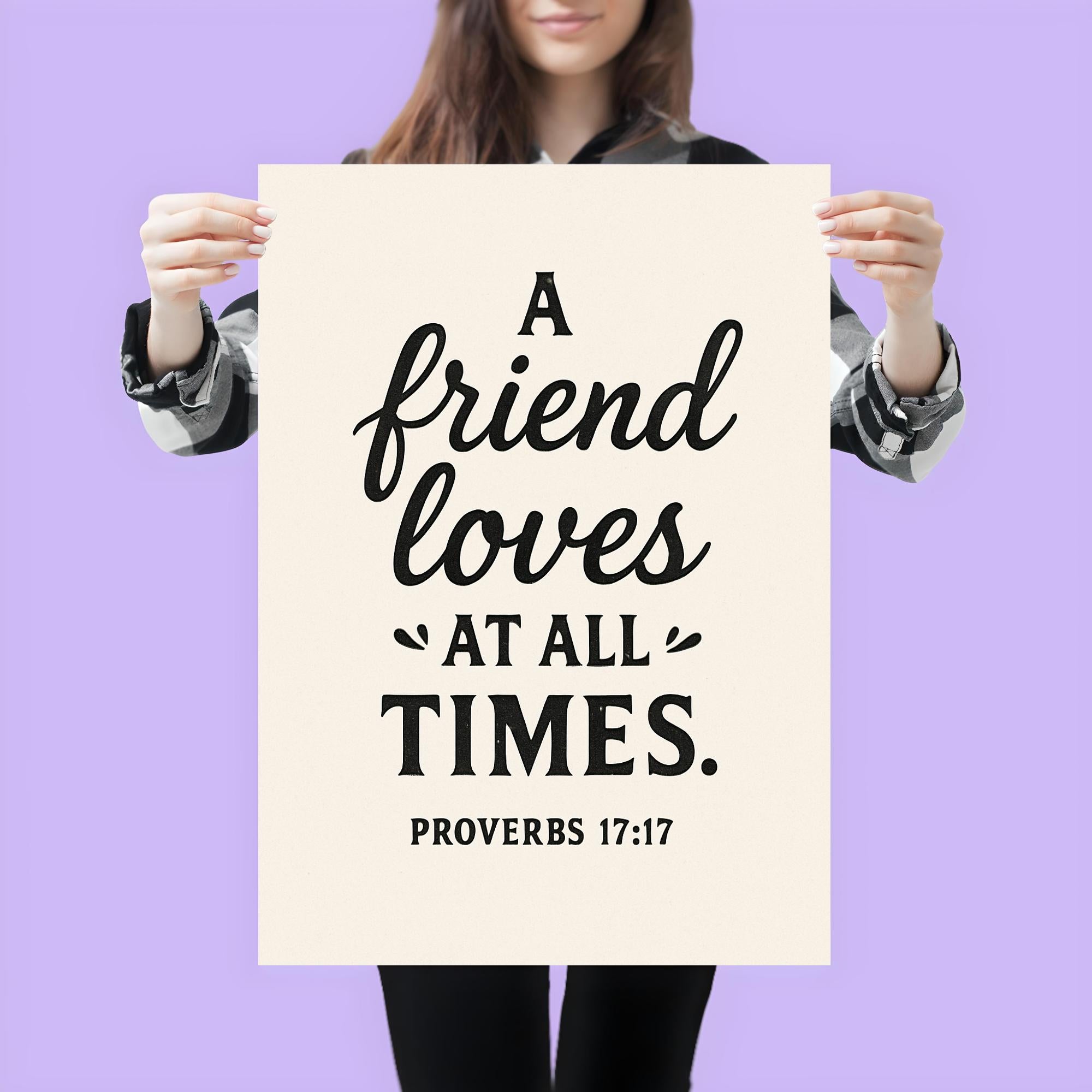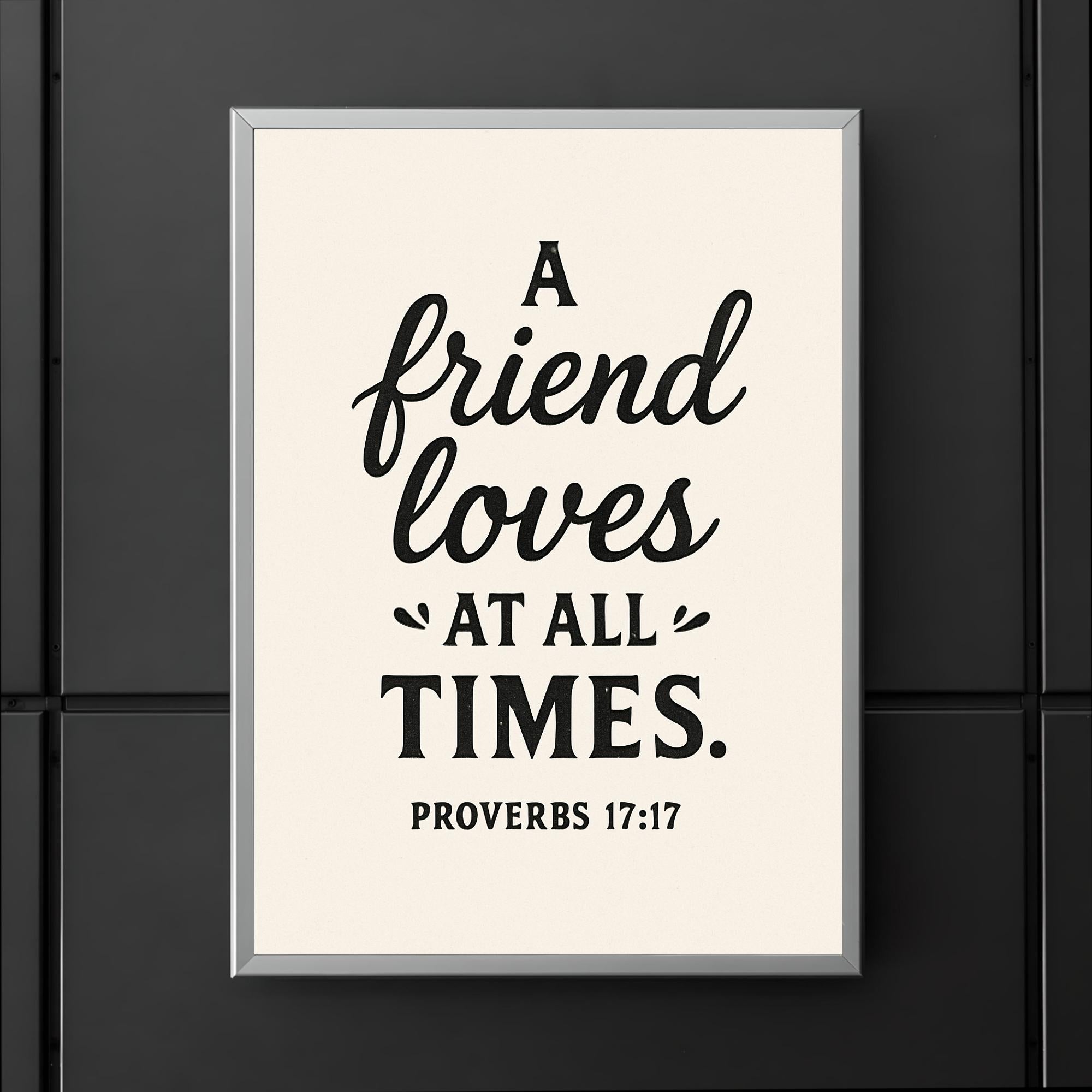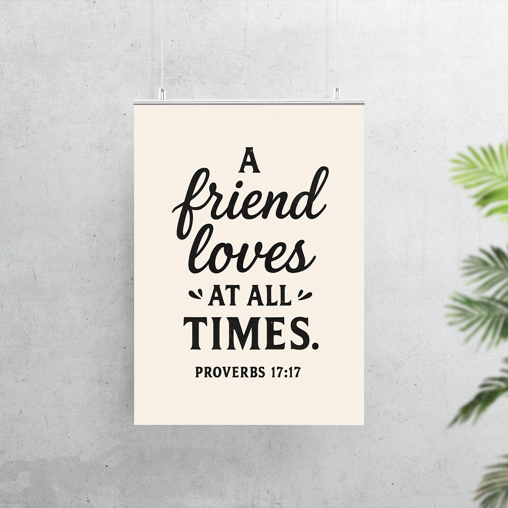 Celebrate unwavering friendship with this inspiring Proverbs 17:17 poster. A timeless reminder that true friends love at all times, this piece brings warmth and encouragement to any space. Perfect for gifting or personal reflection, it’s a heartfelt tribute to loyalty and love.