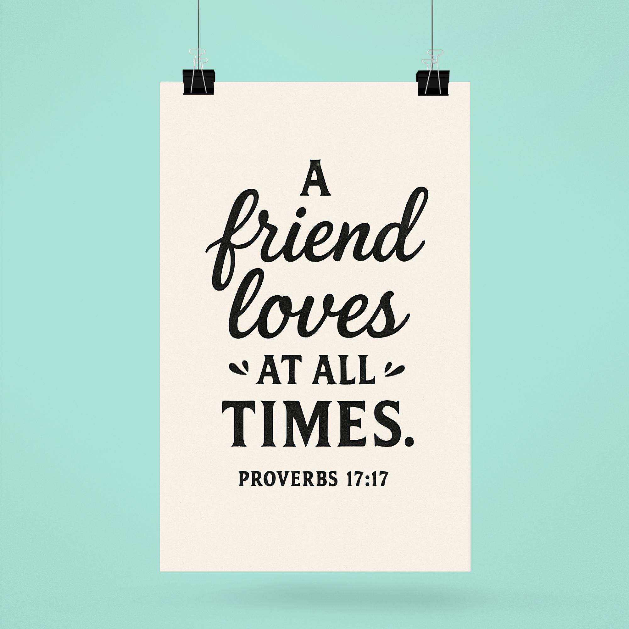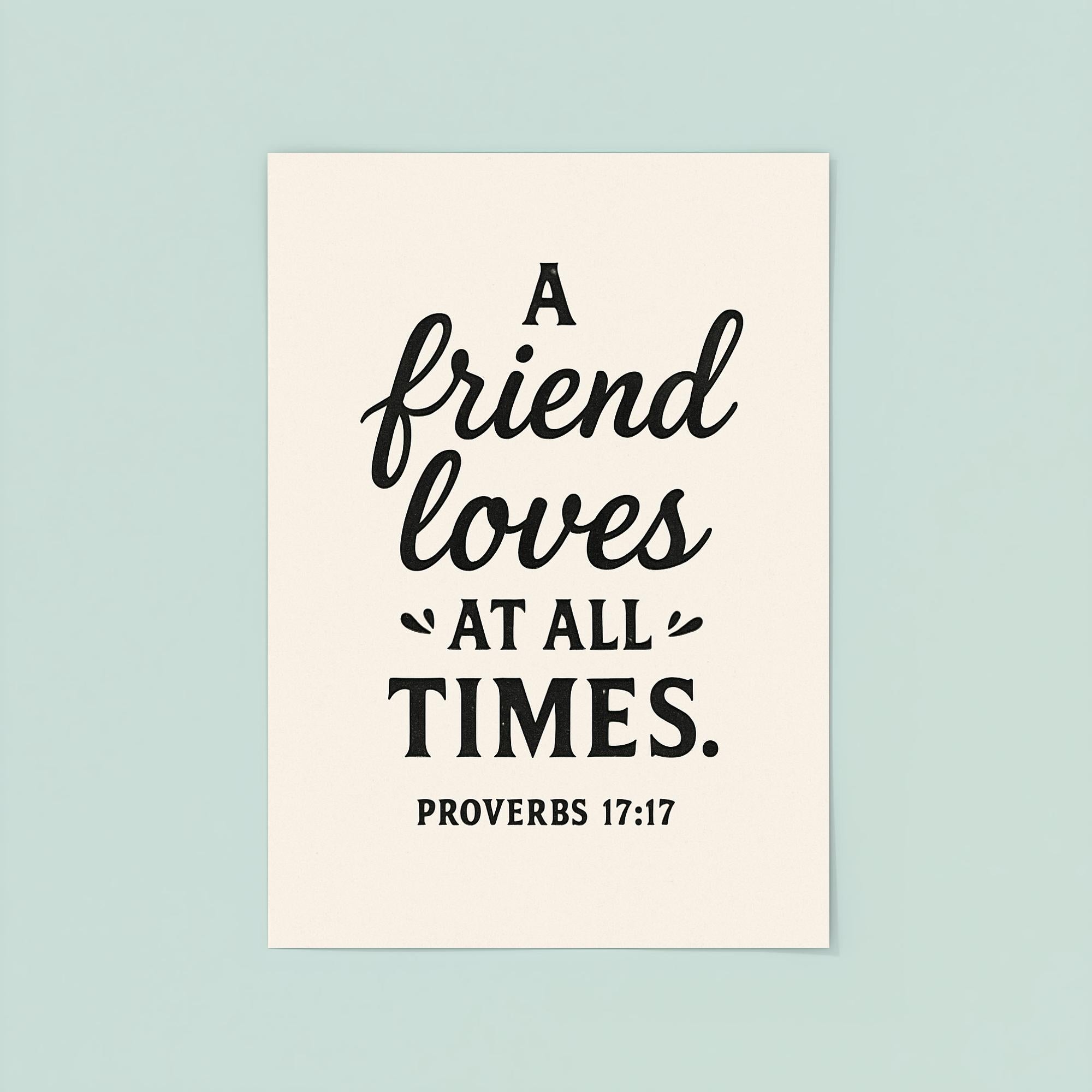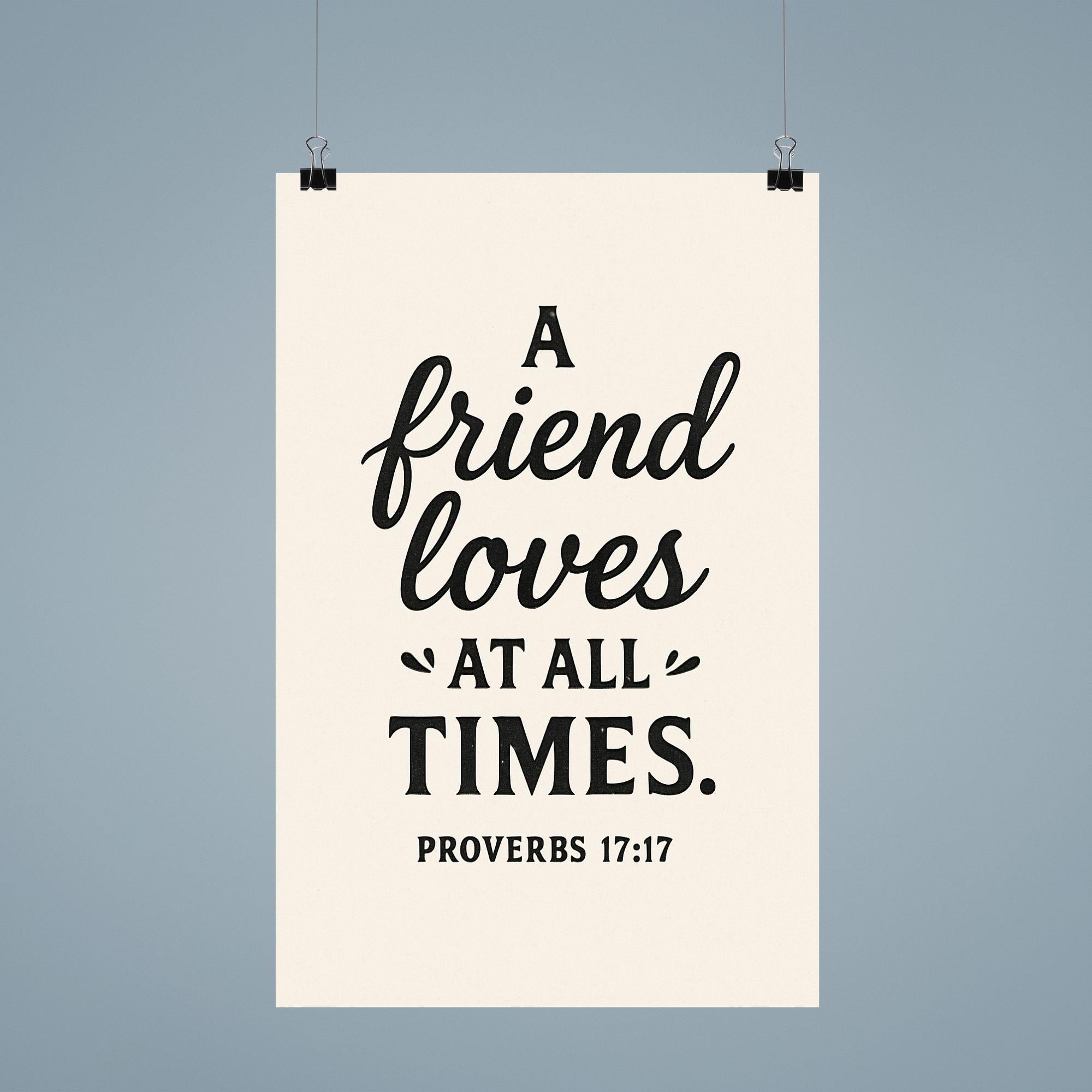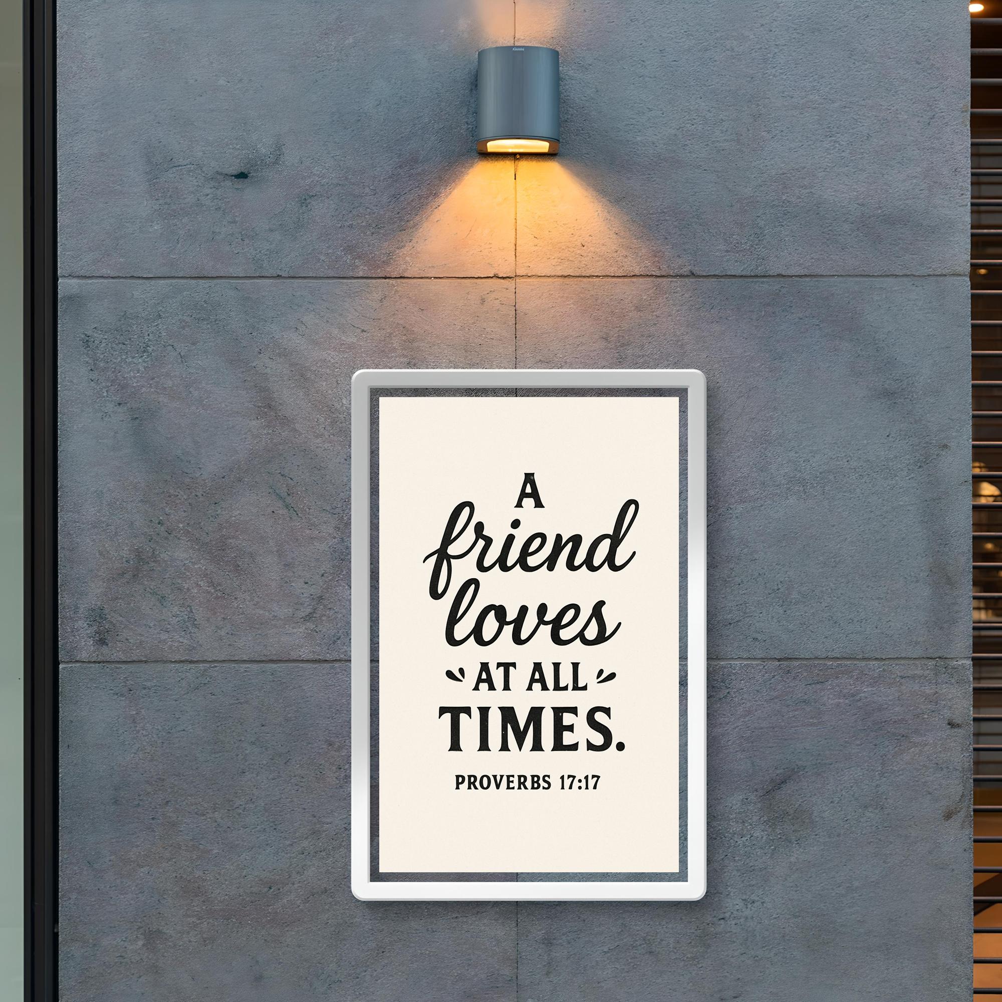Celebrate unwavering friendship with this inspiring Proverbs 17:17 poster. A timeless reminder that true friends love at all times, this piece brings warmth and encouragement to any space. Perfect for gifting or personal reflection, it’s a heartfelt tribute to loyalty and love.