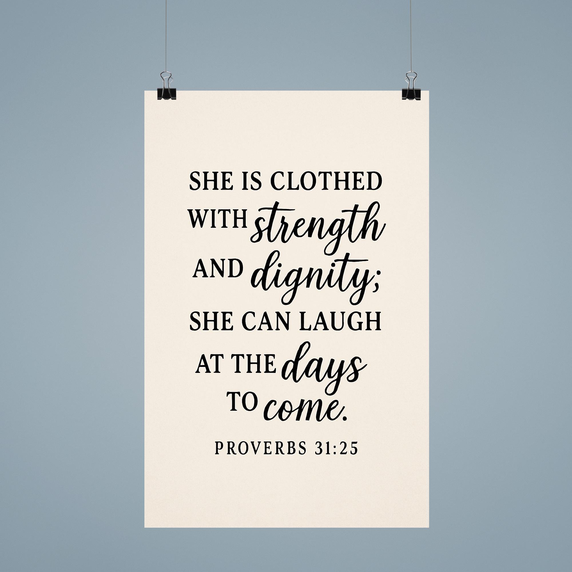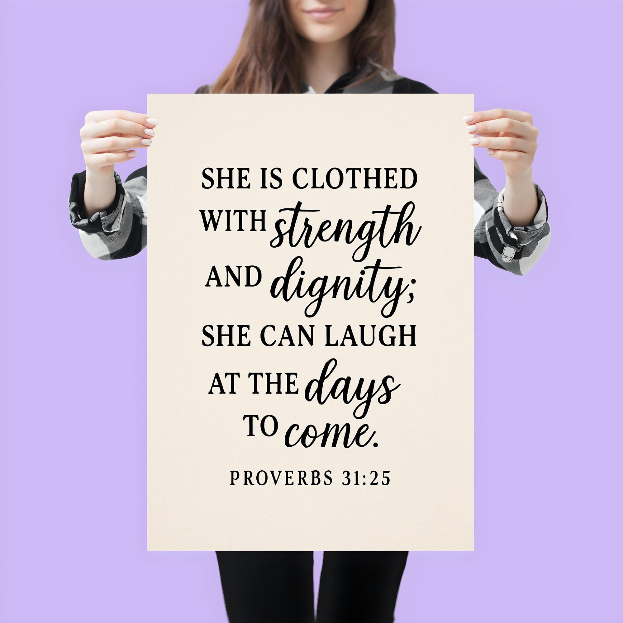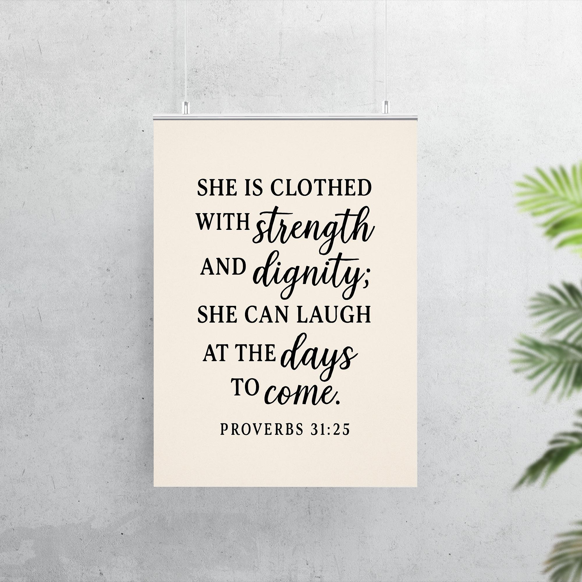 Embrace daily inspiration with this powerful reminder from Proverbs 31:25: “She is clothed with strength and dignity; she can laugh at the days to come.” Perfect for any space, this poster encourages confidence, resilience, and grace, uplifting your spirit every time you see it.