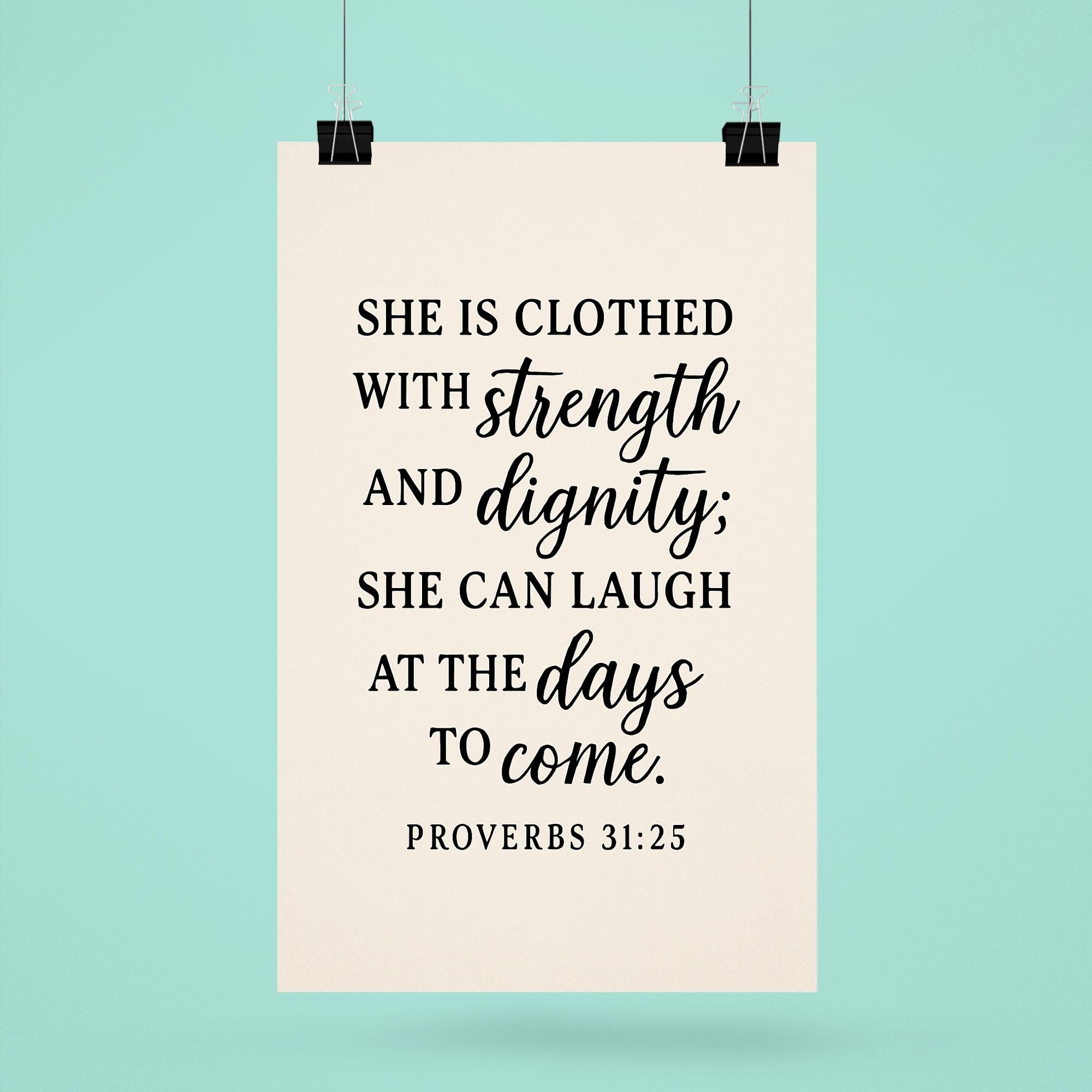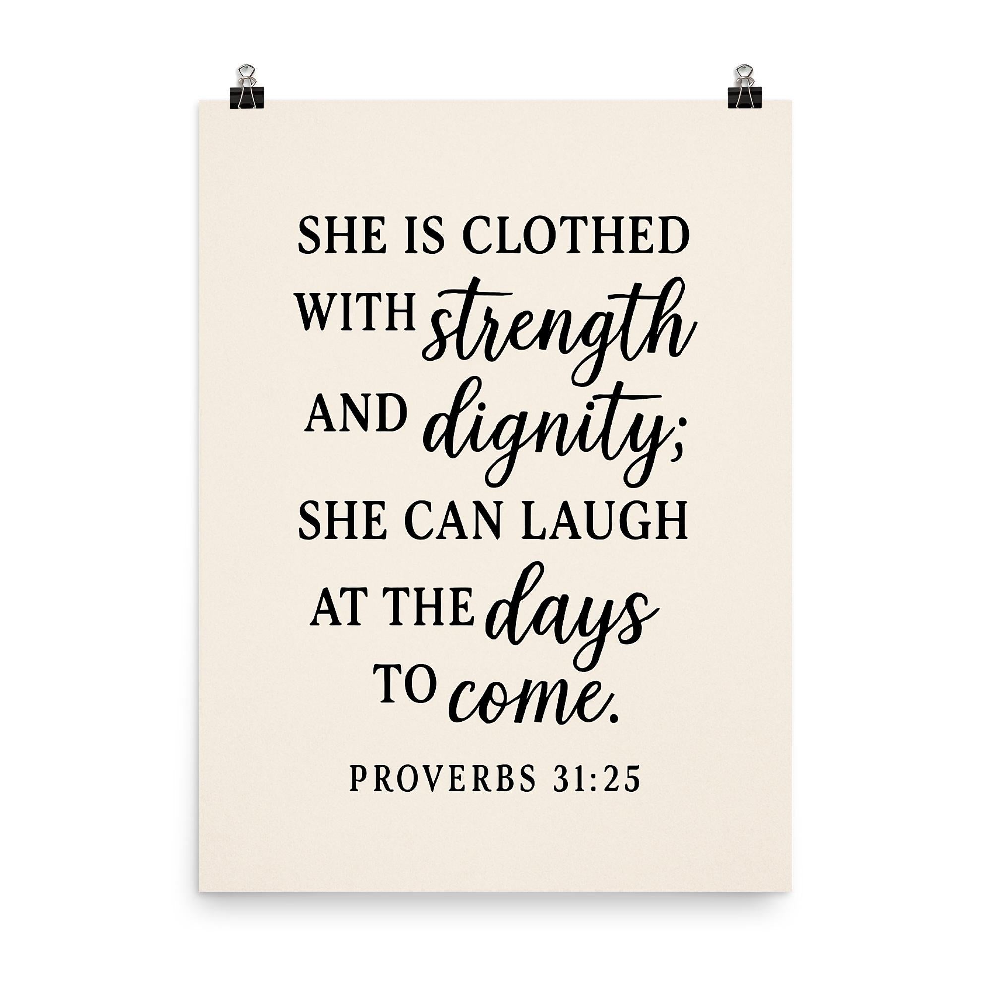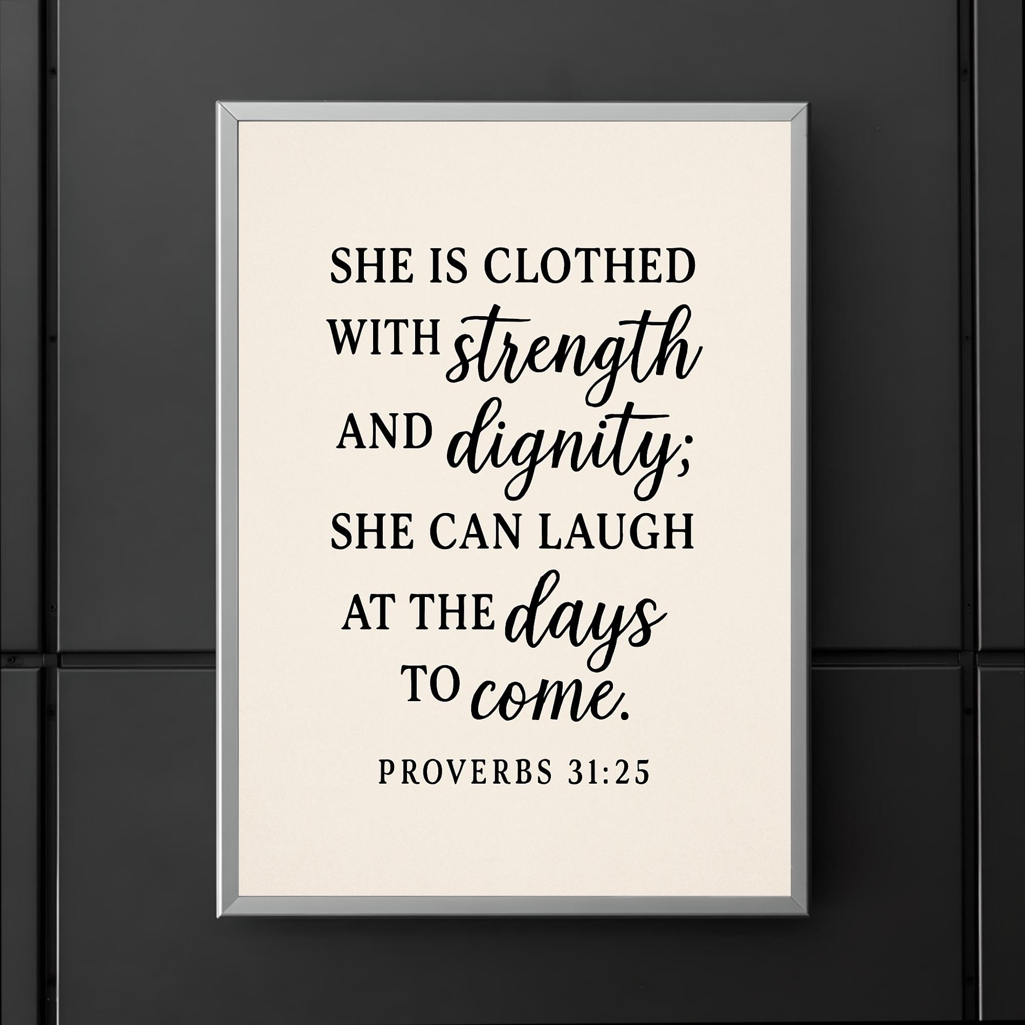 Embrace daily inspiration with this powerful reminder from Proverbs 31:25: “She is clothed with strength and dignity; she can laugh at the days to come.” Perfect for any space, this poster encourages confidence, resilience, and grace, uplifting your spirit every time you see it.