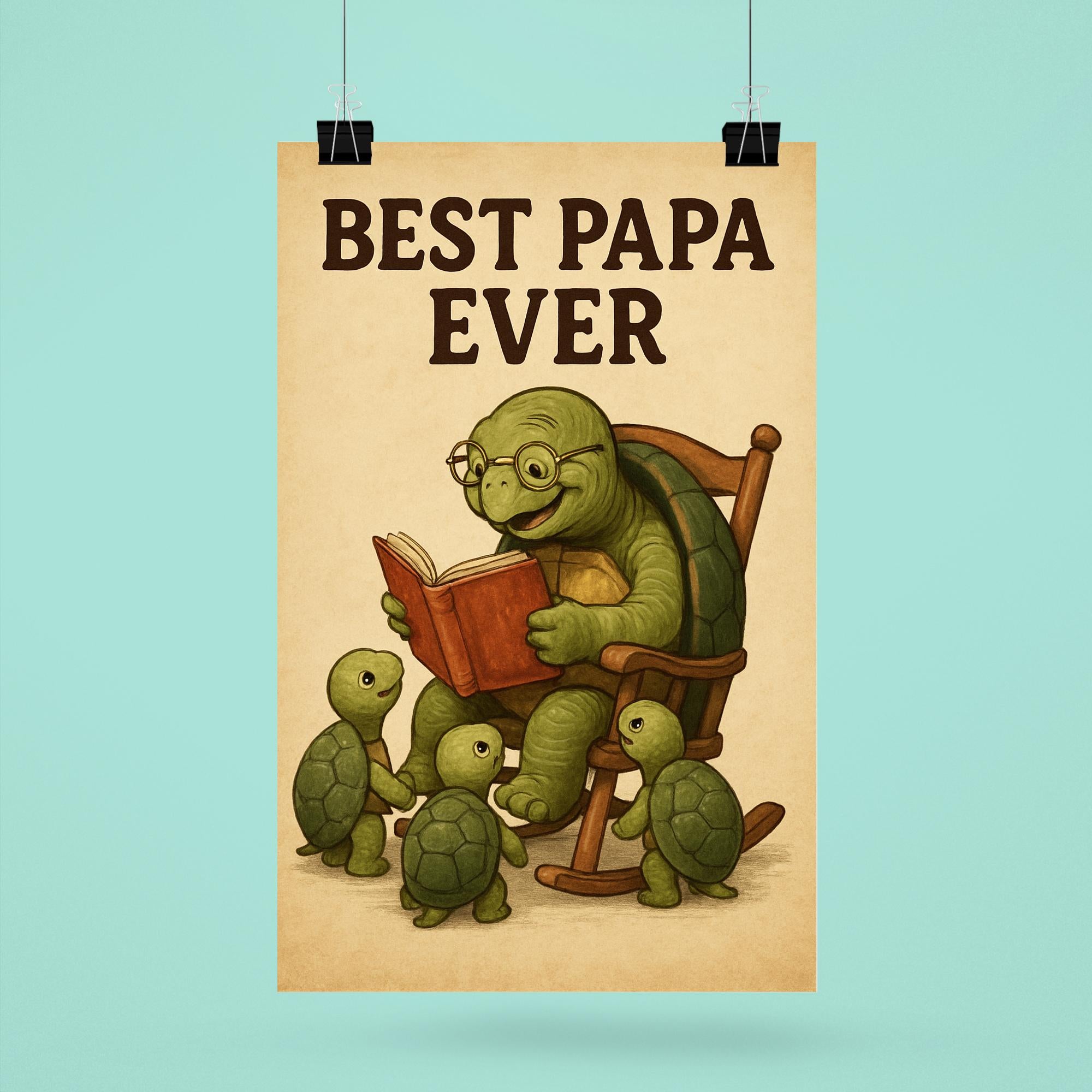 Celebrate the special bond between dad and little ones with this charming "Best Papa Ever" poster. Featuring an elderly turtle reading stories to baby turtles in a cozy rocking chair, this funny and heartwarming Father's Day design is sure to bring smiles and warmth to any space. Perfect for honoring the gentle, patient, and loving spirit of fatherhood.