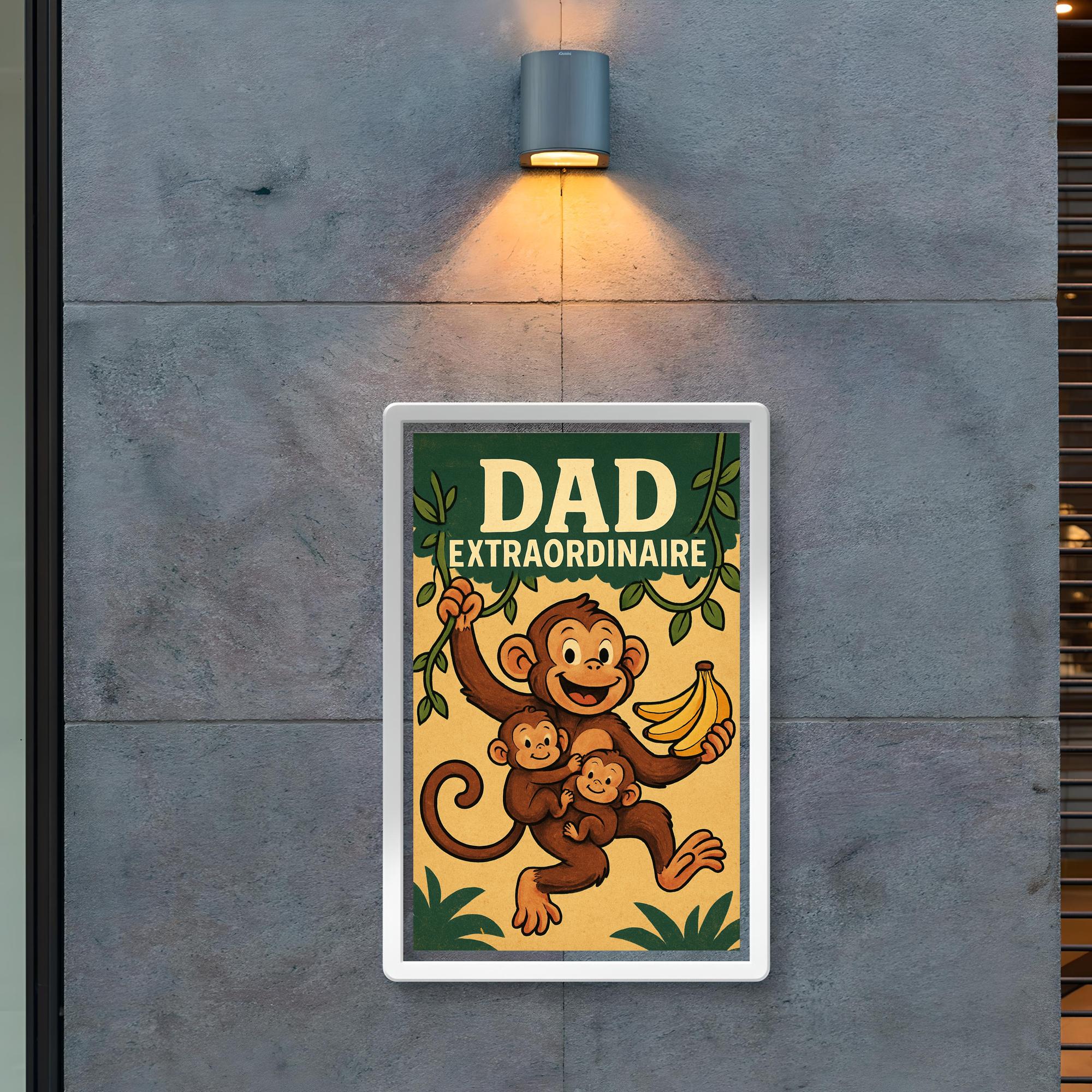 Celebrate the ultimate dad with this playful "Dad Extraordinaire" poster! Featuring a lively monkey swinging through vines while carrying baby monkeys and bananas, it captures the joyful chaos and love of fatherhood in a fun, lighthearted way. Perfect for Father's Day, this whimsical design is sure to bring smiles and warm hearts wherever it’s displayed.
