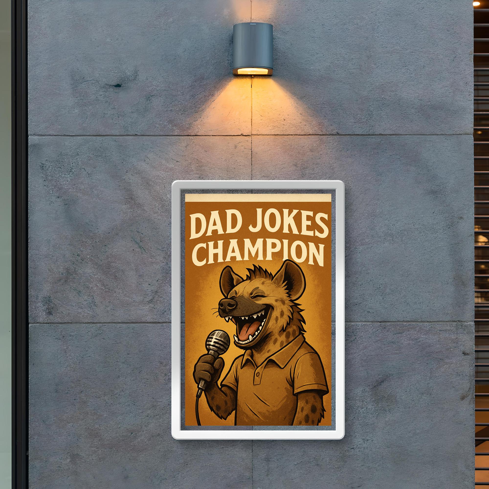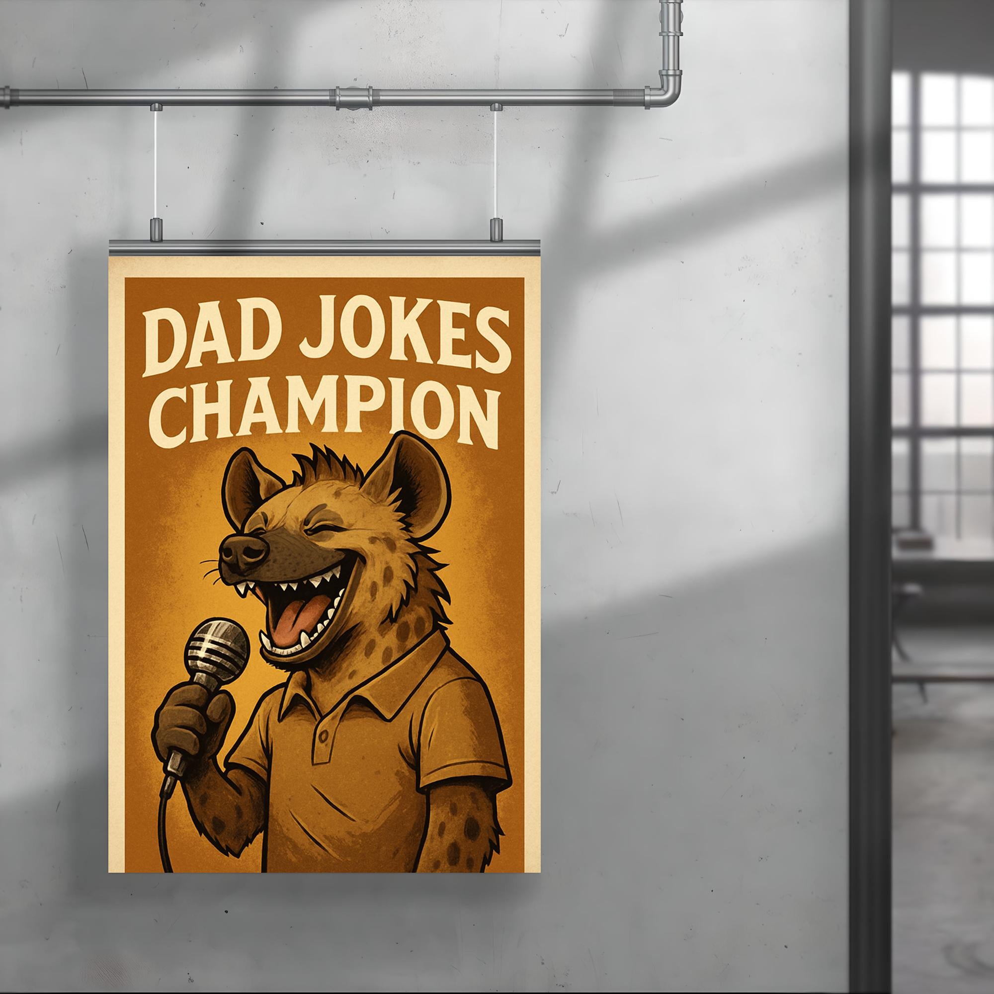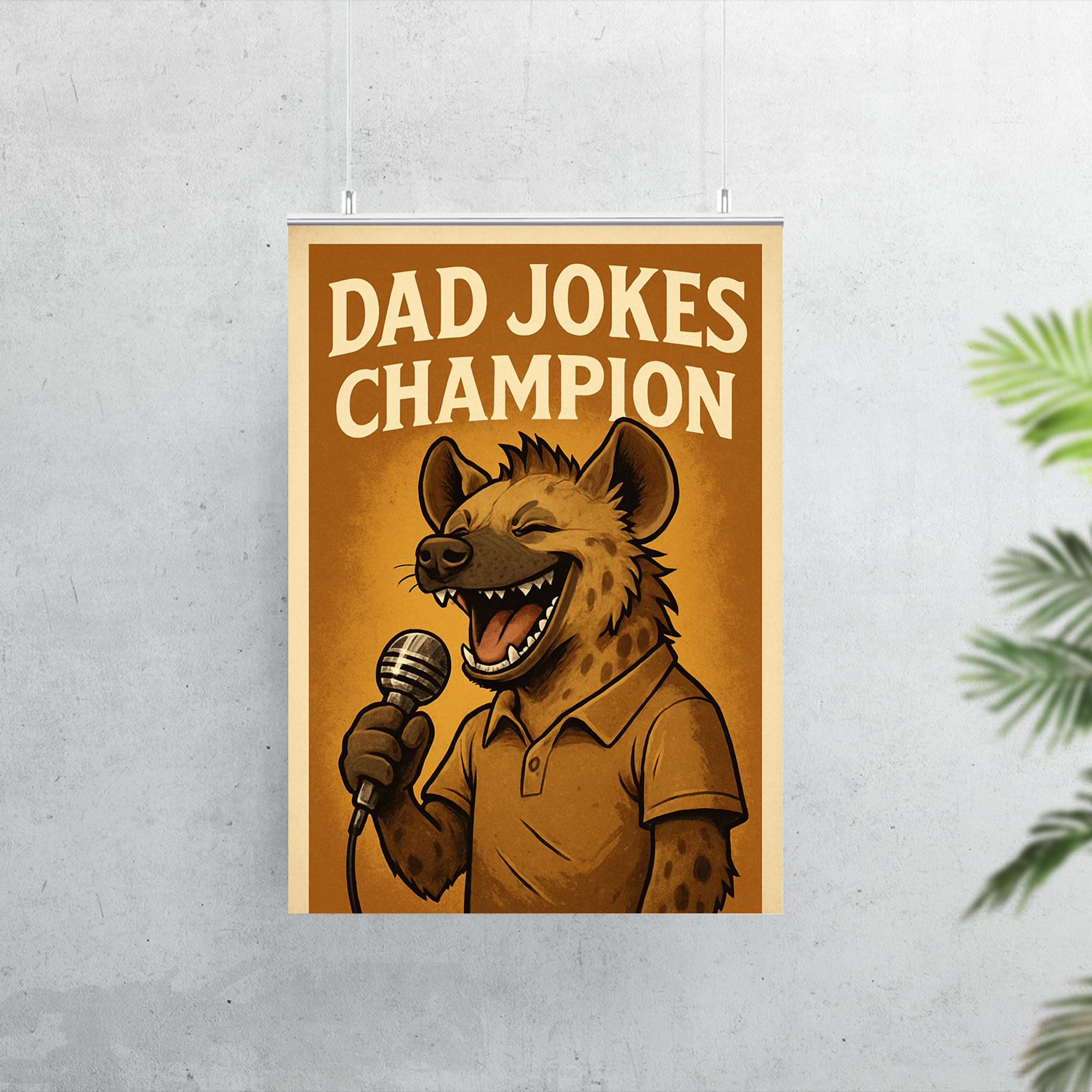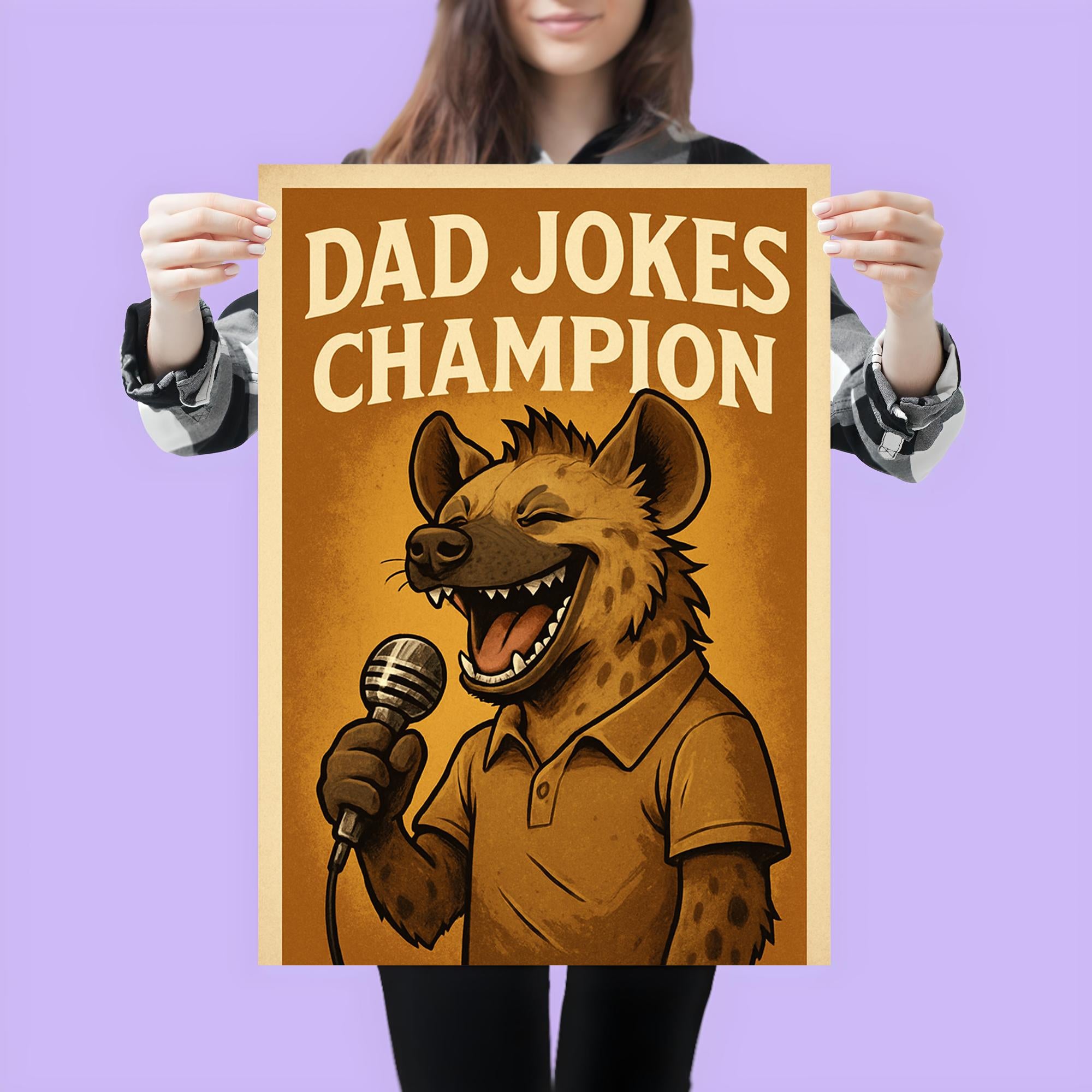 Celebrate dad’s unbeatable sense of humor with this hilarious "Dad Jokes Champion" poster! Featuring a playful hyena alongside a comedy club microphone, it’s the perfect way to honor the king of groan-worthy laughs this Father’s Day. A fun, lighthearted gift that’s sure to bring smiles and chuckles for years to come!