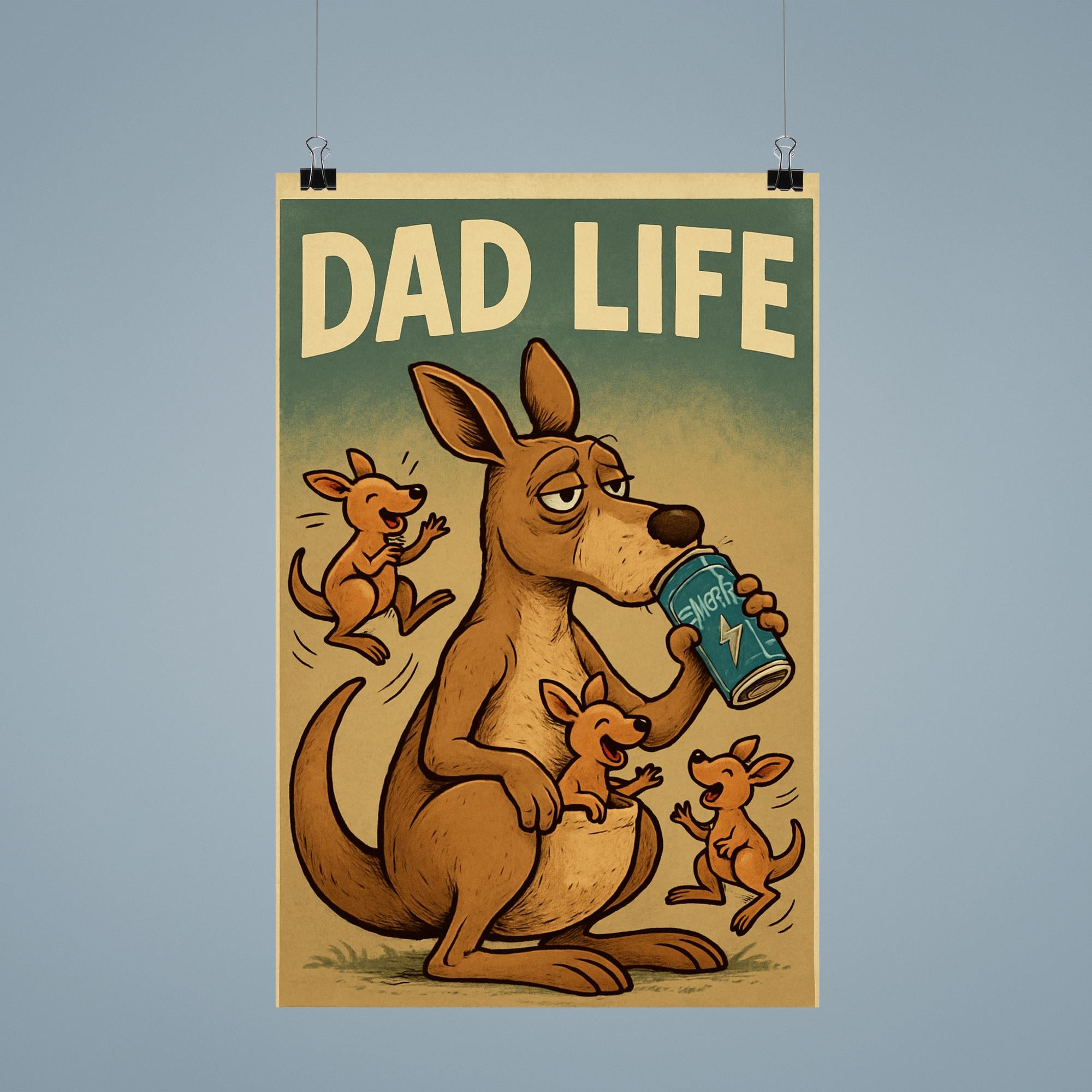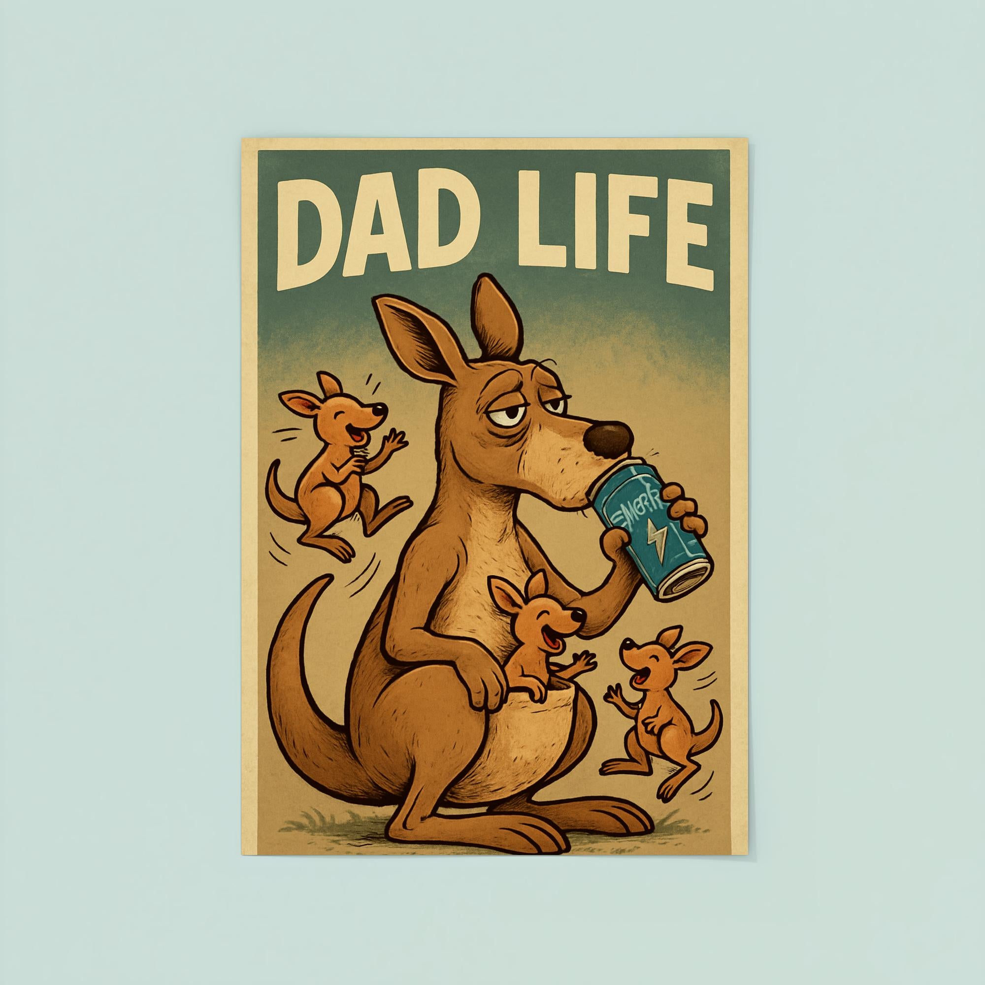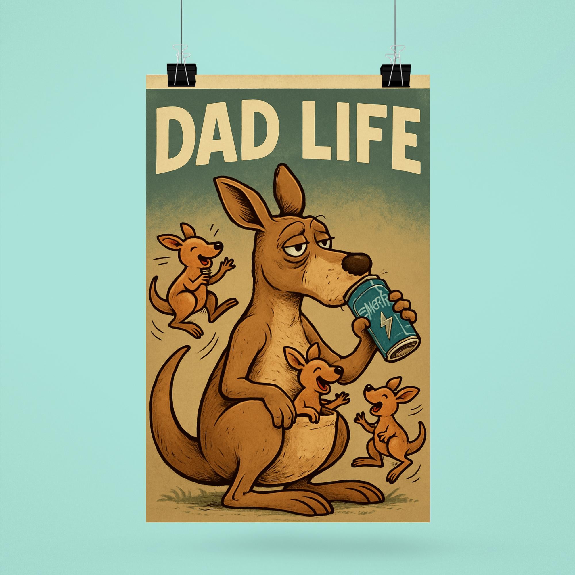 Celebrate the hilarious chaos of fatherhood with this funny 'Dad Life' poster! Featuring a weary kangaroo clutching an energy drink while joeys bounce around, it perfectly captures the nonstop energy—and humor—of being a dad. A playful and relatable gift that will bring smiles and laughs this Father’s Day!