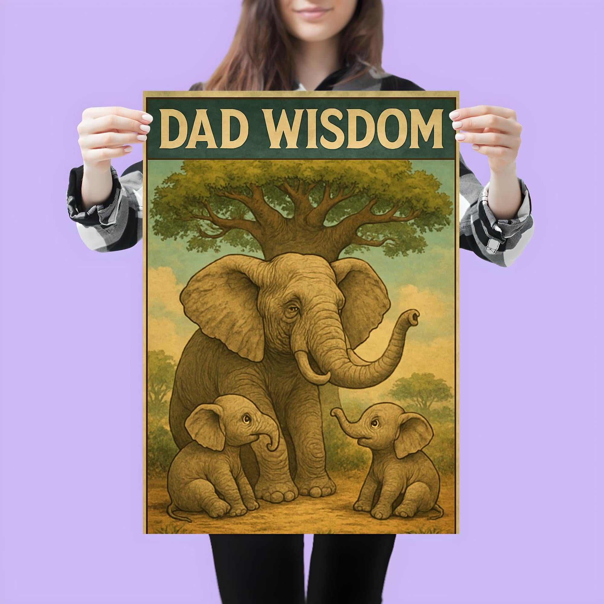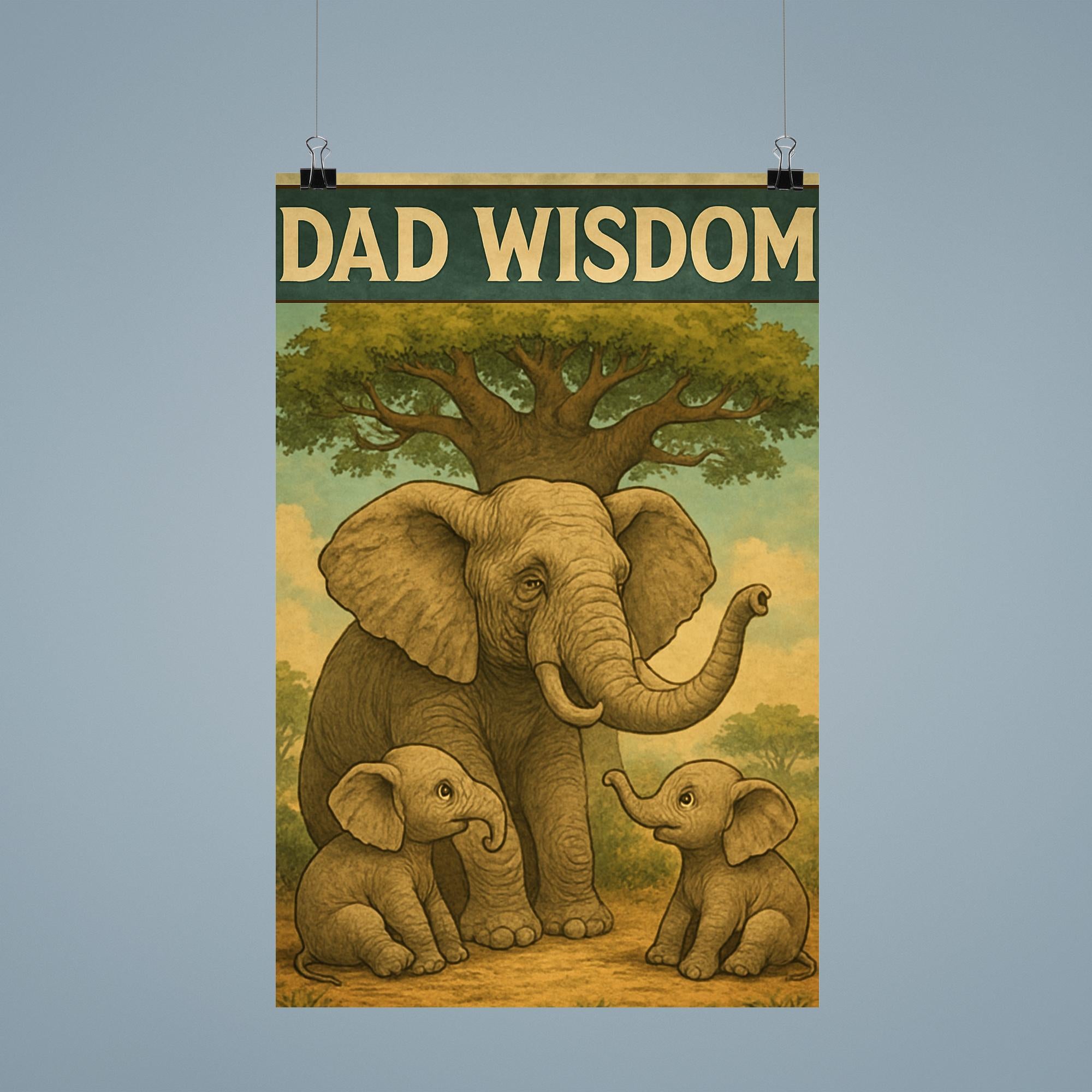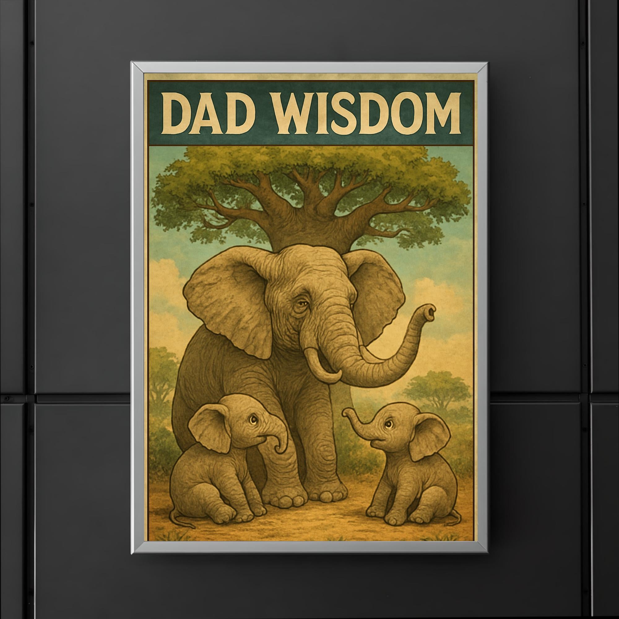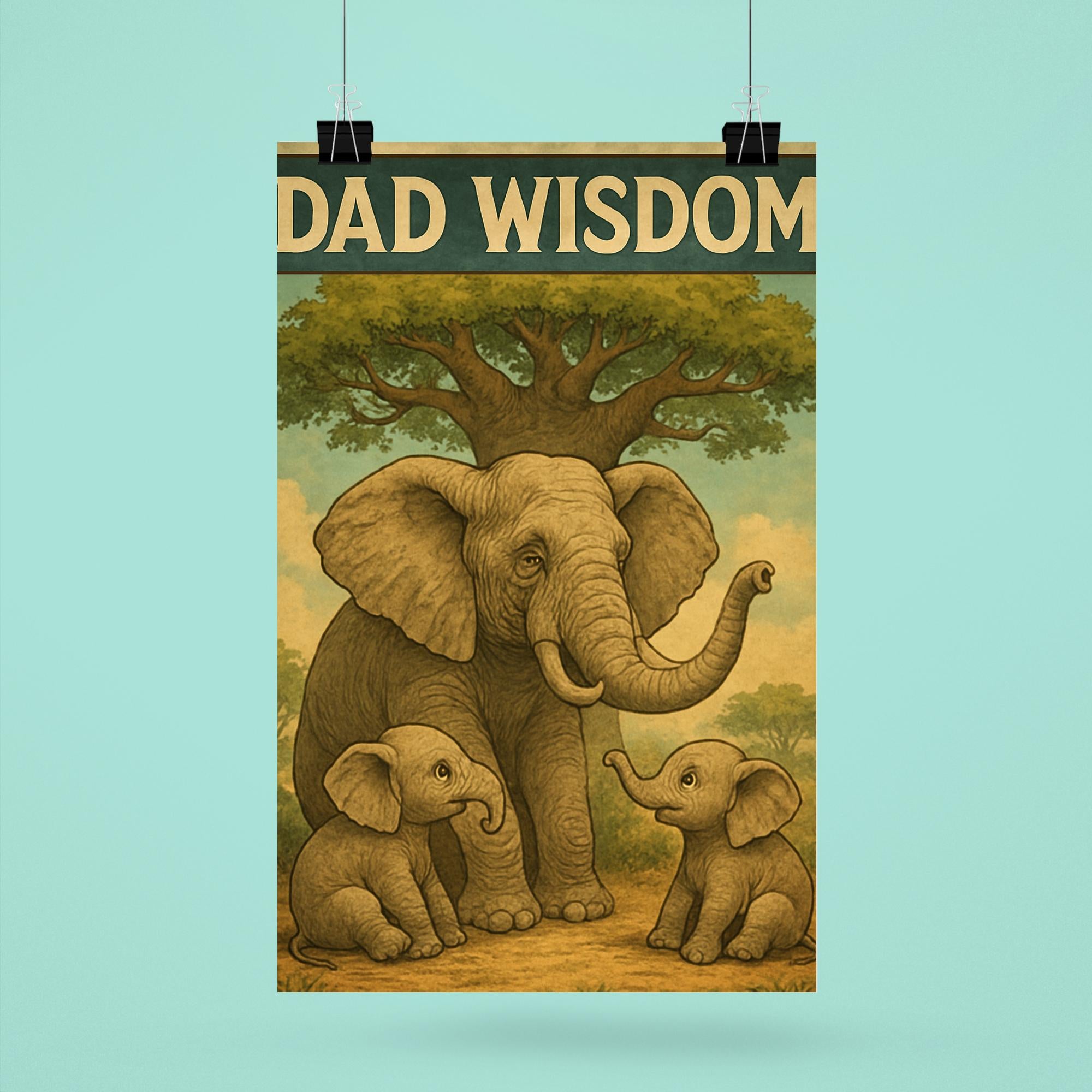 Celebrate the timeless bond between father and child with this heartwarming “Dad Wisdom” poster. Featuring an elderly elephant sharing stories with baby elephants beneath a majestic baobab tree, this charming and funny Father’s Day artwork perfectly captures the gentle guidance and love dads bring to every generation. A delightful reminder to cherish those priceless moments of wisdom and laughter together.