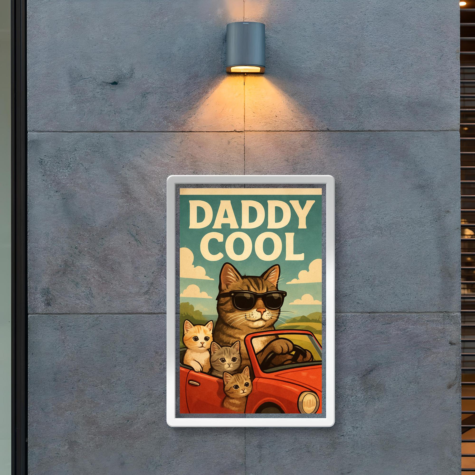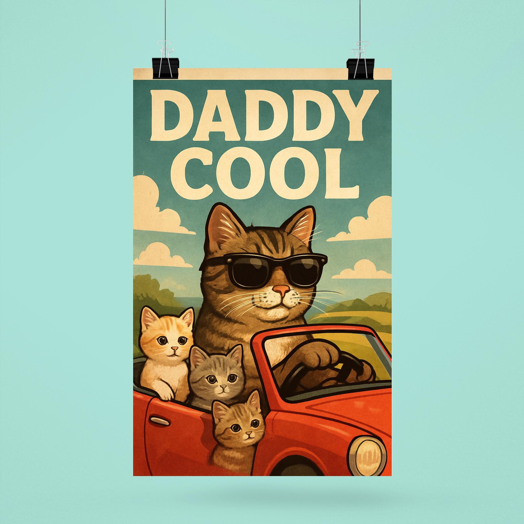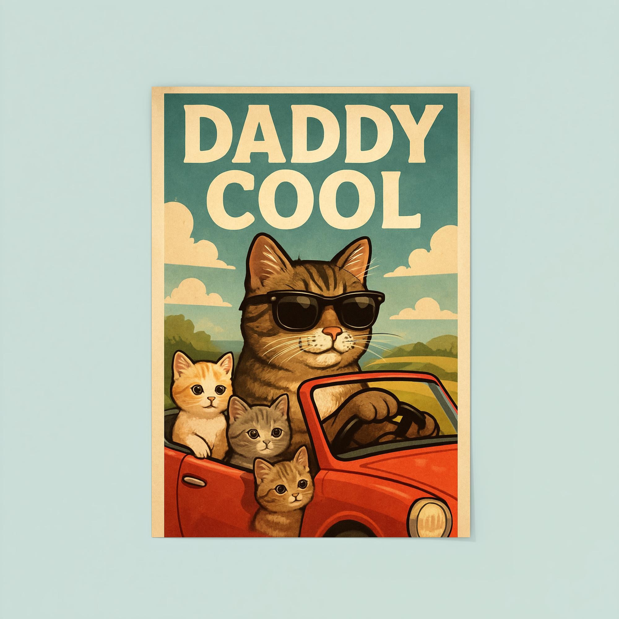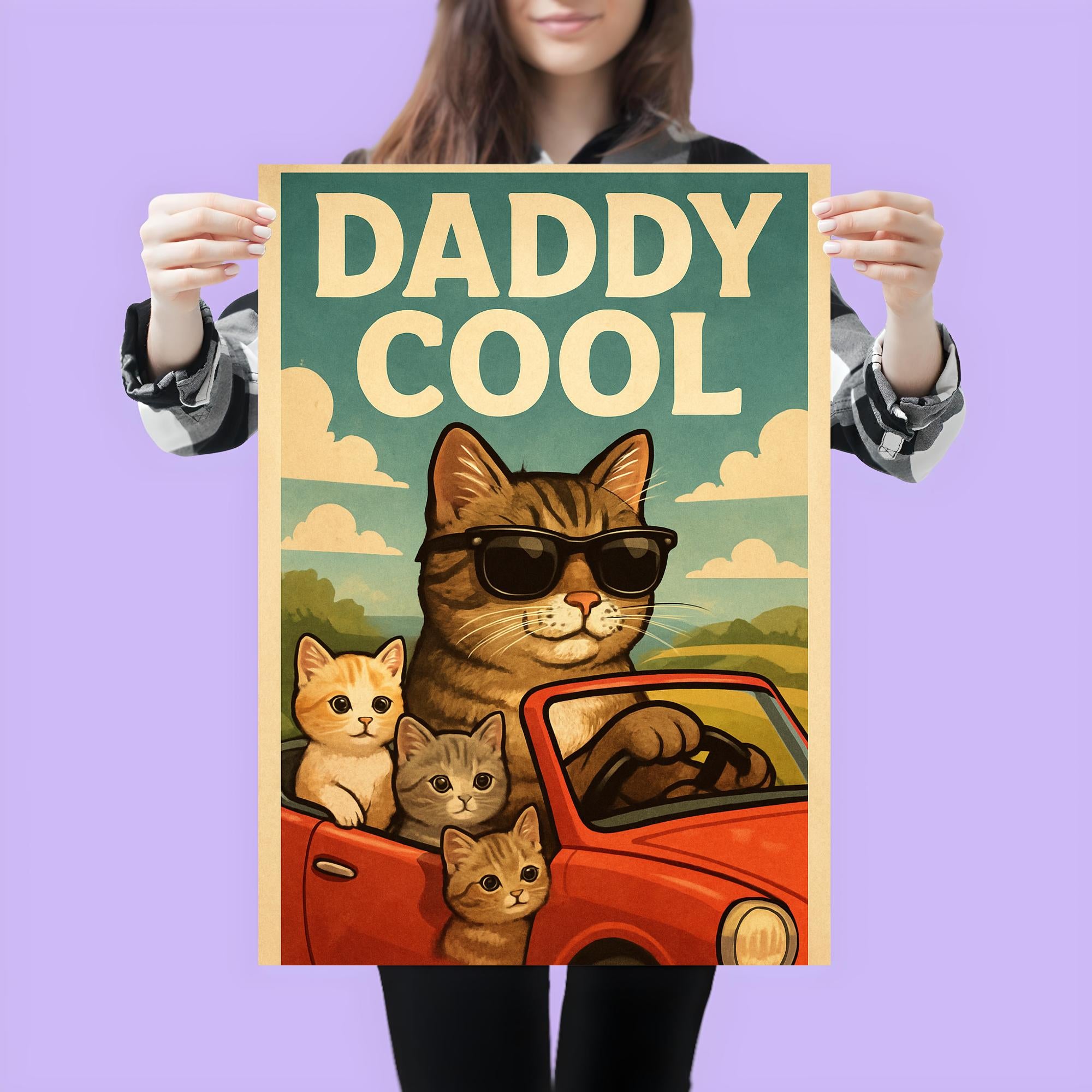 Celebrate dad’s cool factor with this hilarious "Daddy Cool" poster featuring a cat in sunglasses behind the wheel of a convertible, accompanied by adorable kittens. Perfect for Father’s Day, this fun and quirky design brings a smile and loads of charm to any room. A purr-fect gift that shows dad just how awesome he really is!