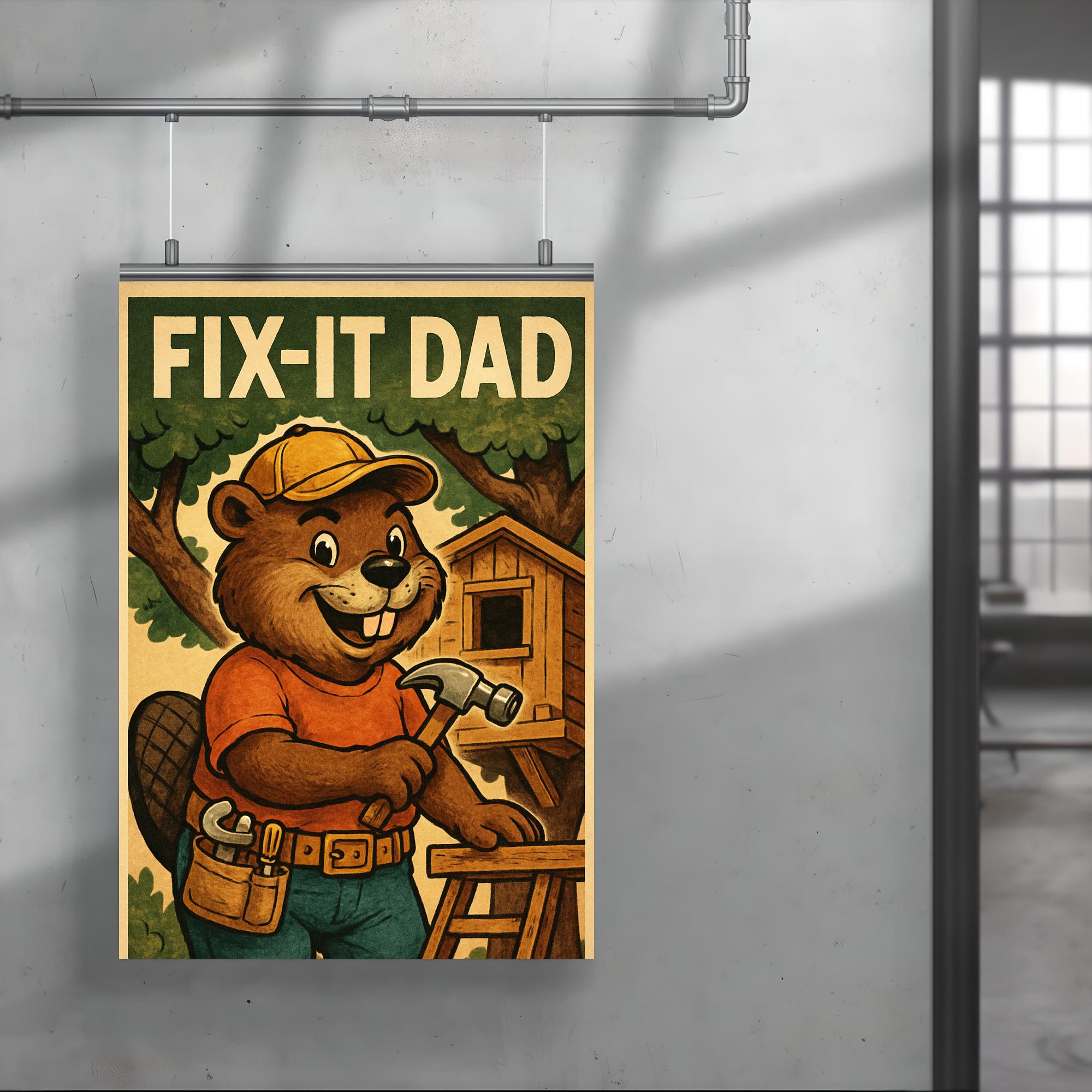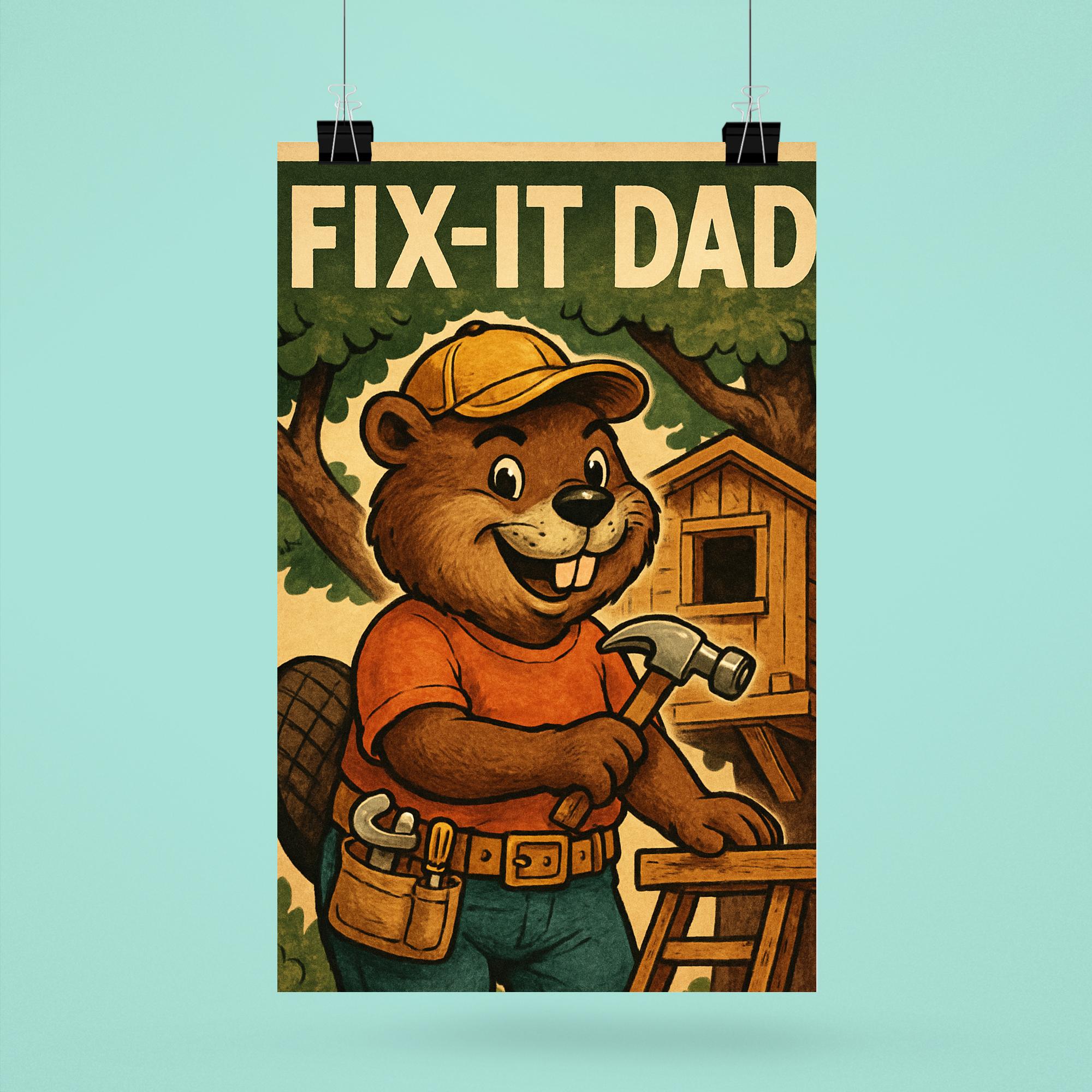Celebrate Dad’s handyman magic with this hilarious "Fix It Dad" poster featuring a beaver rocking a tool belt as he builds a treehouse. Perfect for Father’s Day, it’s a witty tribute to the DIY hero in your life who’s always ready to fix, build, and make everything better with a smile. Add a touch of humor and heart to your gift—because every dad deserves a little extra credit!