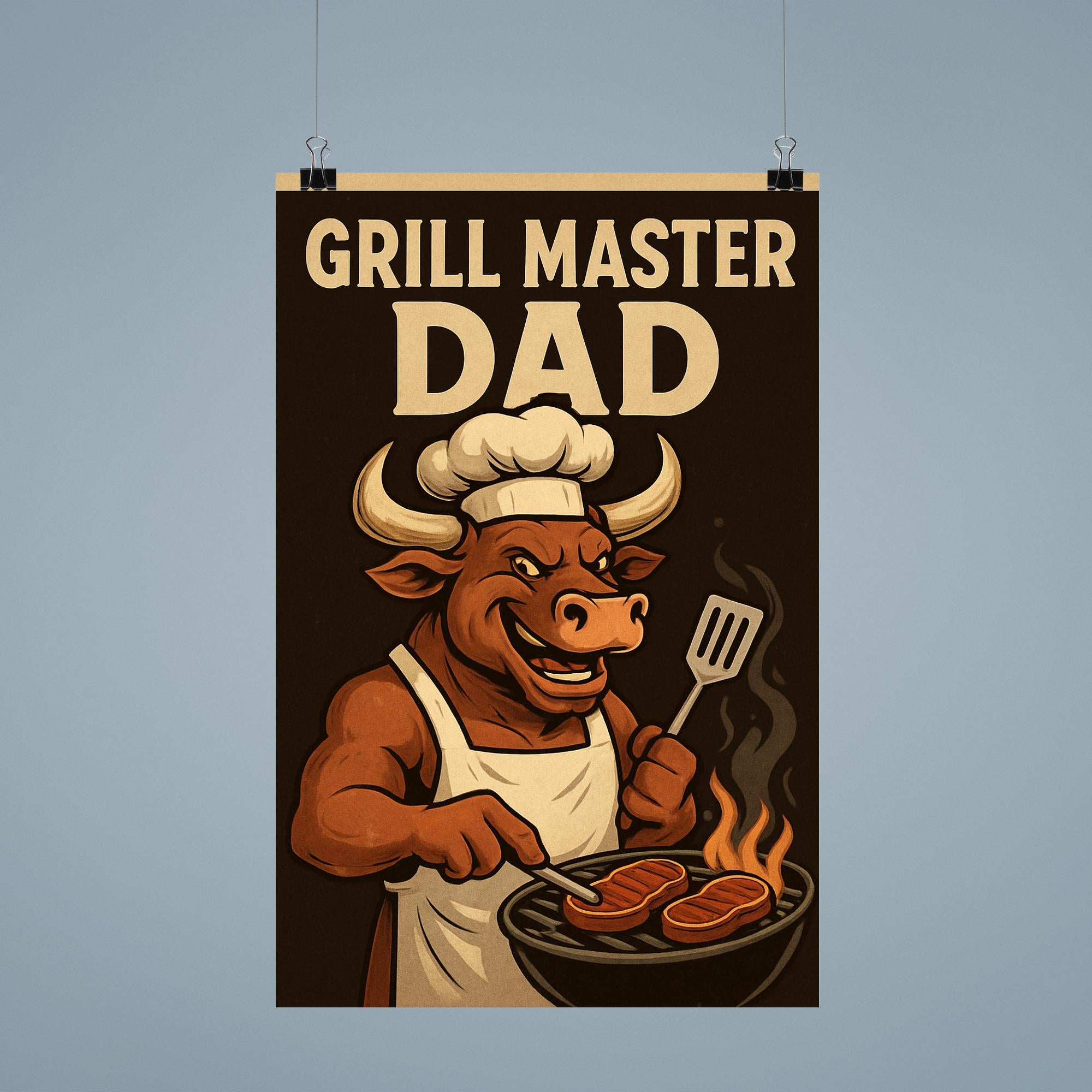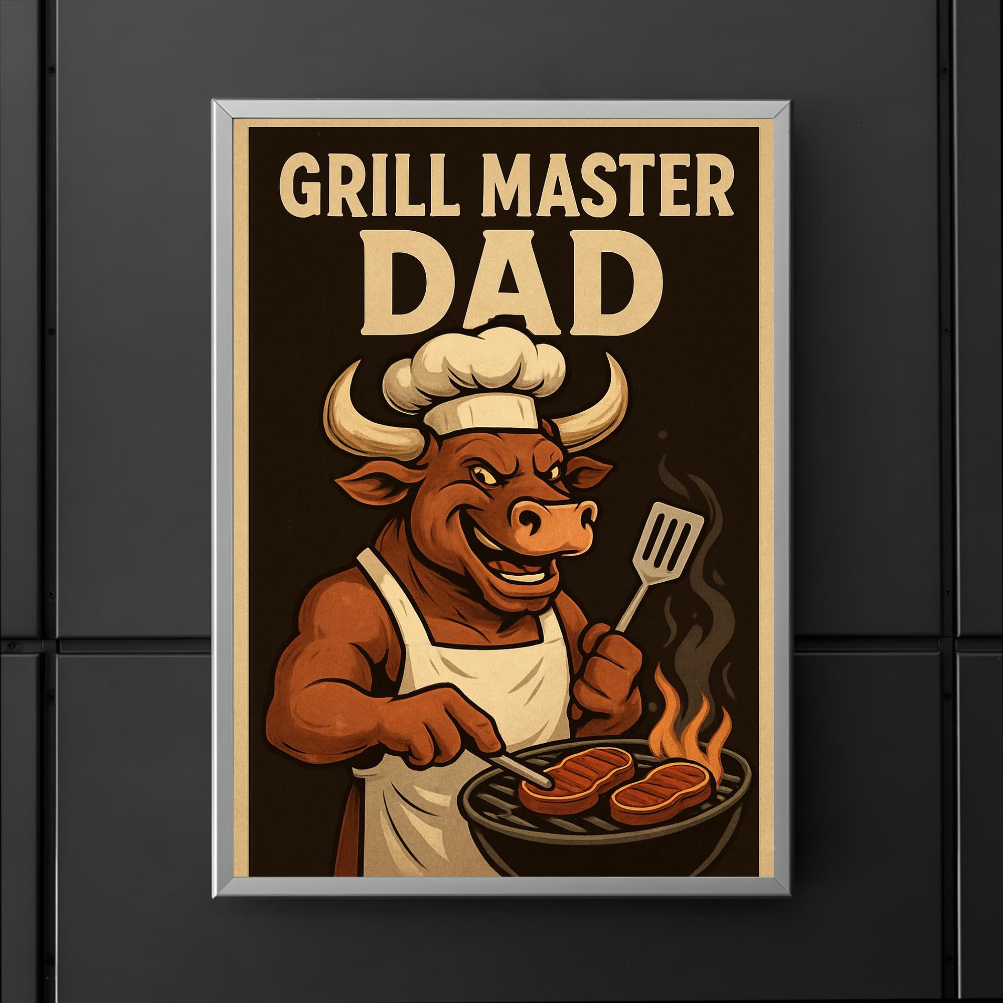 Grill Master Dad Poster Print – Funny Bull Chef Wall Art, Father’s Day BBQ Gift, Steak Flipping Kitchen Decor for Dad