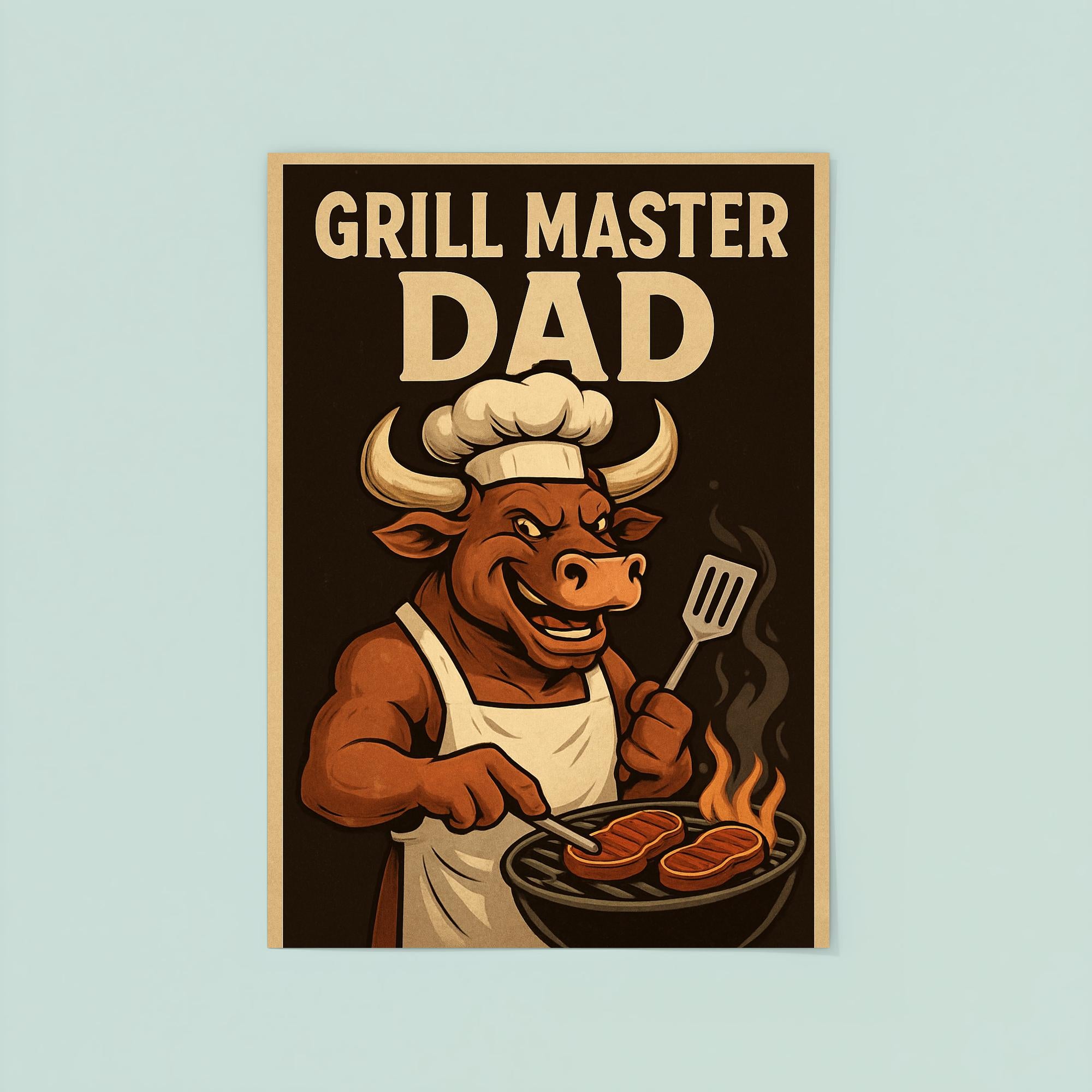 Celebrate Dad’s grilling greatness with this hilarious “Grill Master Dad” poster! Featuring a confident bull decked out in a chef’s hat and apron, flipping steaks with flair, it’s the perfect humorous tribute for Father’s Day. This fun and bold design brings a sizzling dose of personality to any grill station or man cave.