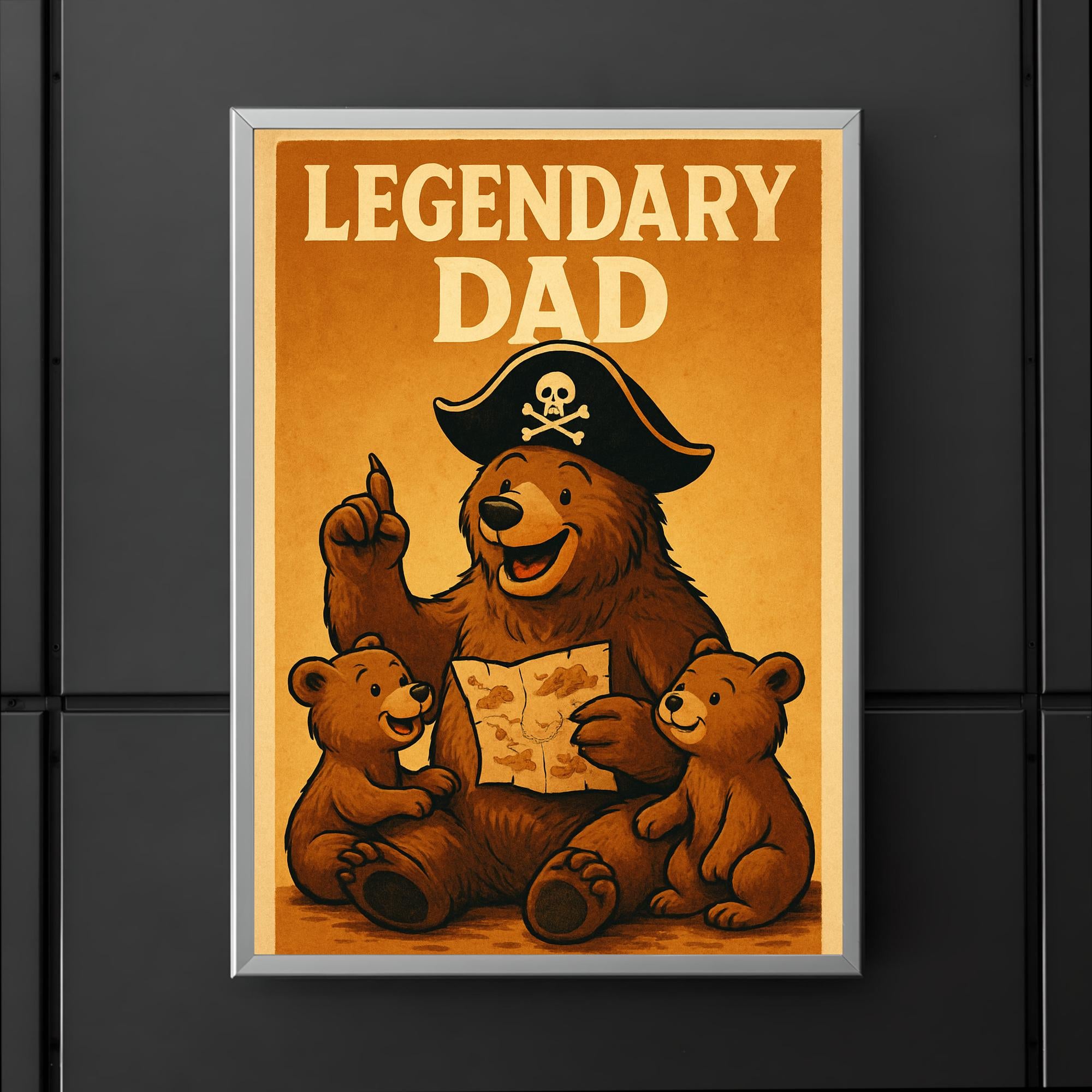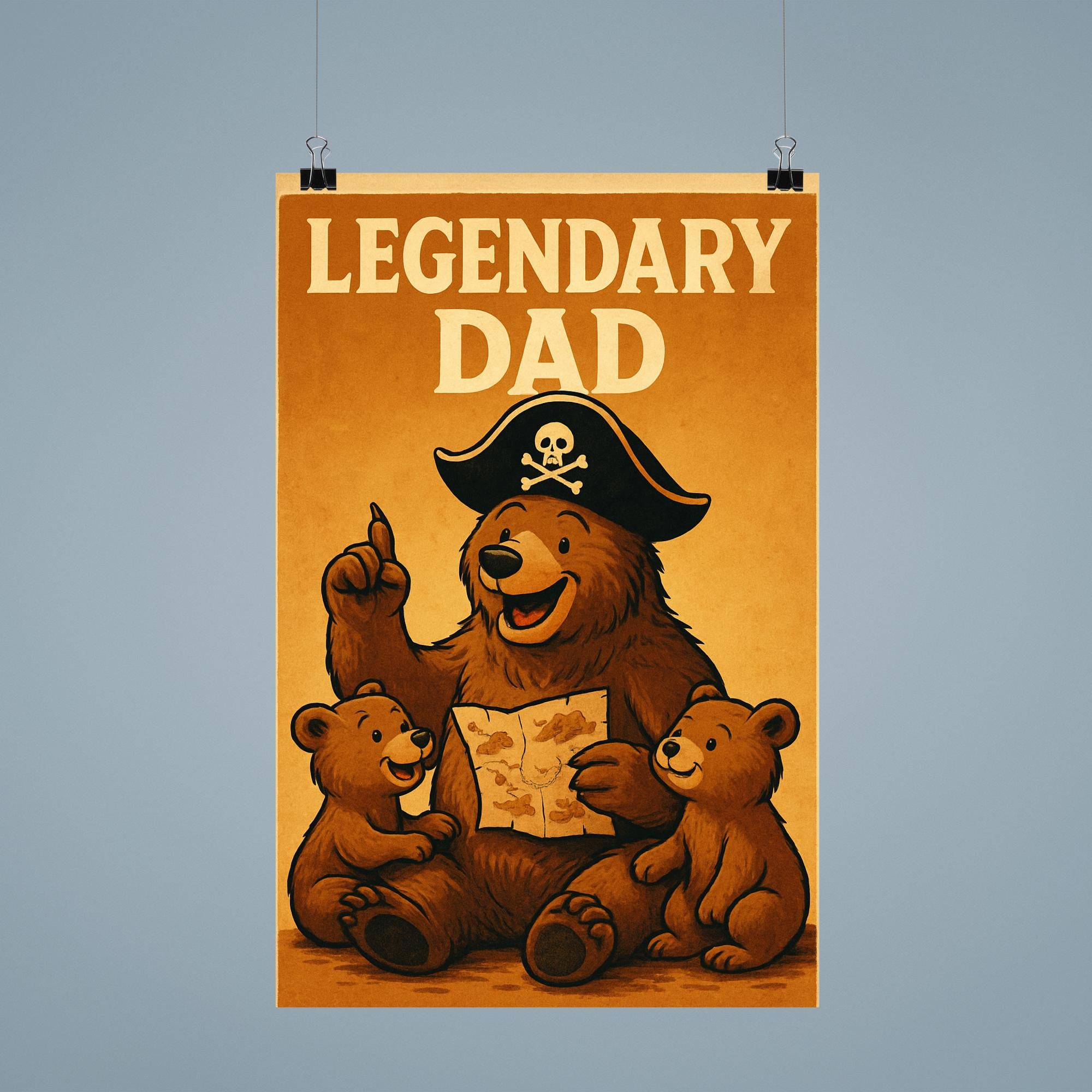 Celebrate the adventure of fatherhood with this hilarious "Legendary Dad" poster! Featuring a bear proudly wearing a pirate hat as he shares unforgettable tales with his cubs, it’s the perfect gift to bring smiles and laughter on Father’s Day. A charming tribute to dads who are true legends in every story they tell!