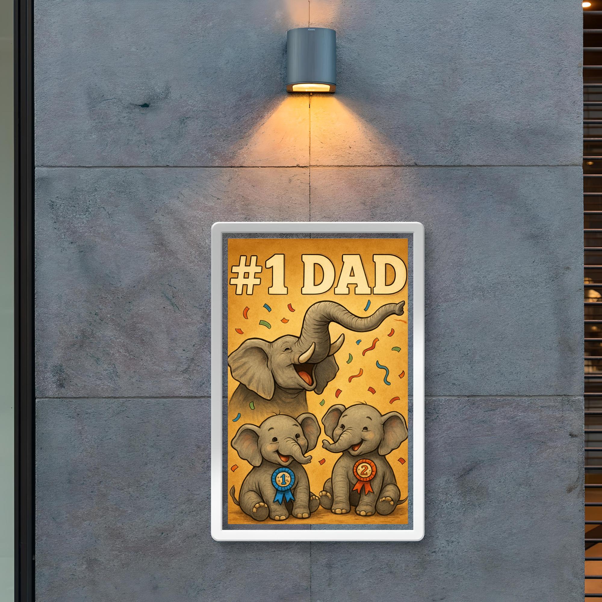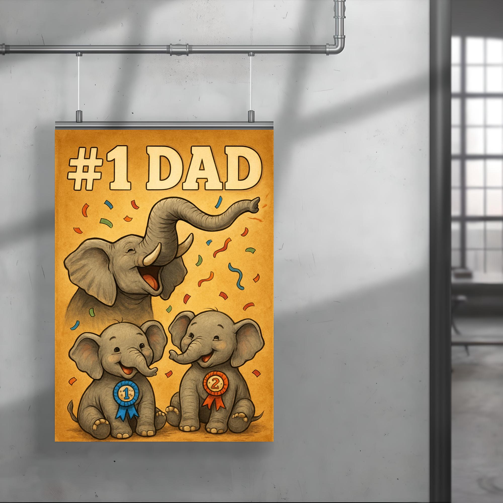 Celebrate the unbeatable bond between dad and child with this playful "Number One Dad" poster! Featuring a joyful elephant trumpeting in celebration alongside proud baby elephants sporting their ribbons, it’s the perfect funny and heartwarming tribute for Father’s Day. Add a touch of whimsy and love to any space with this charming reminder that Dad truly is the greatest champion.