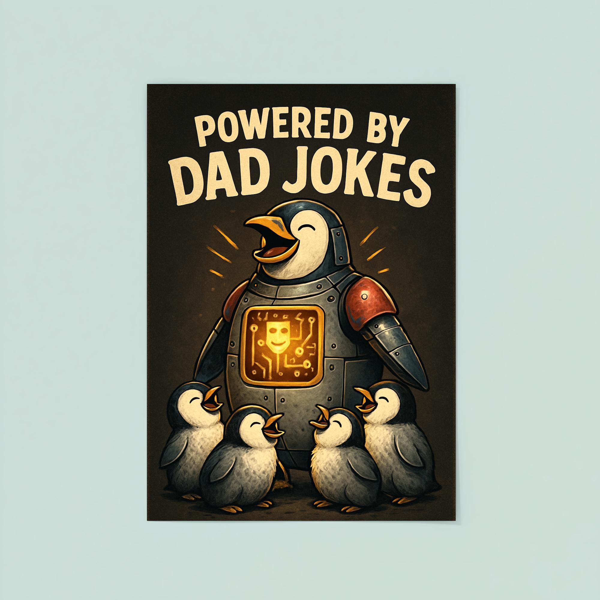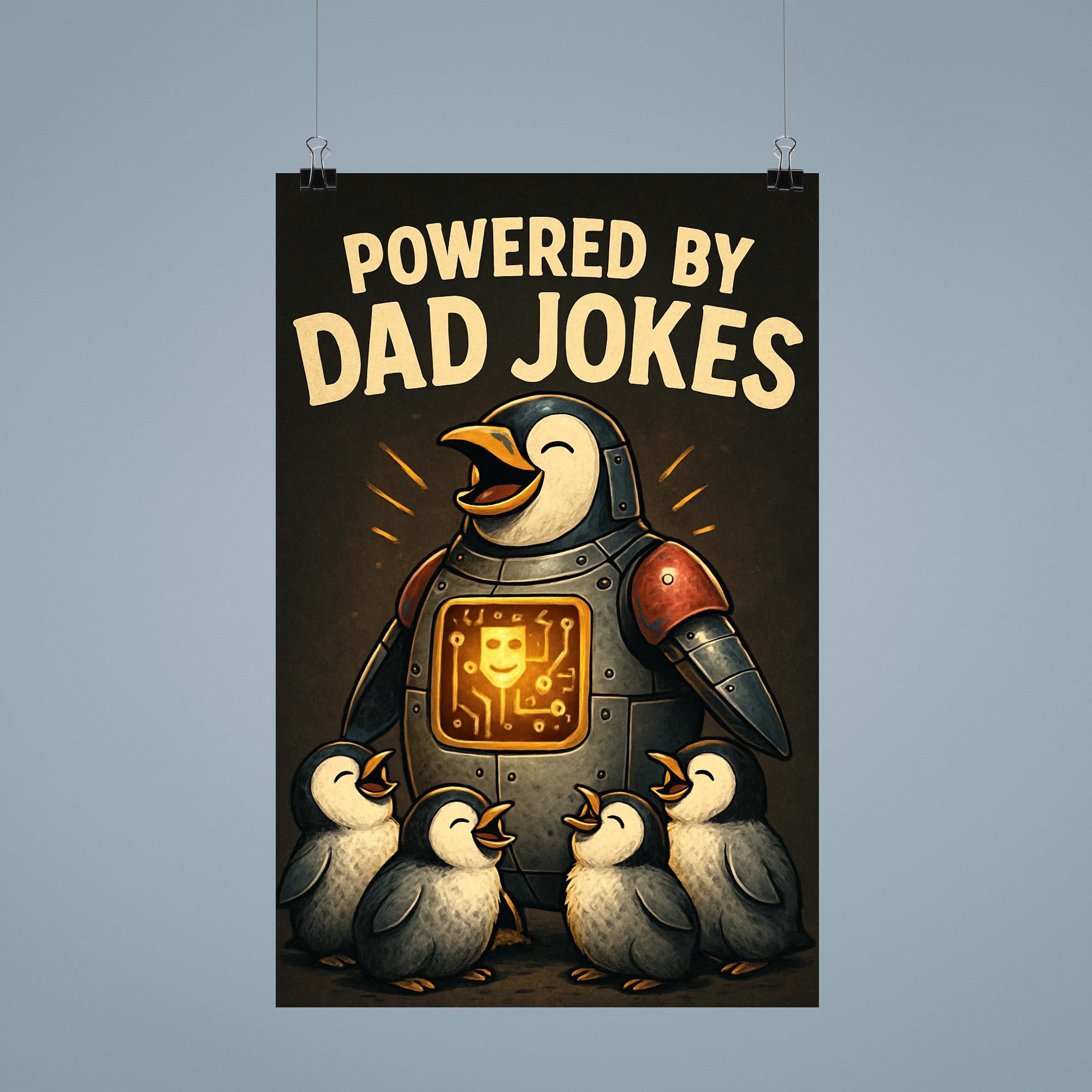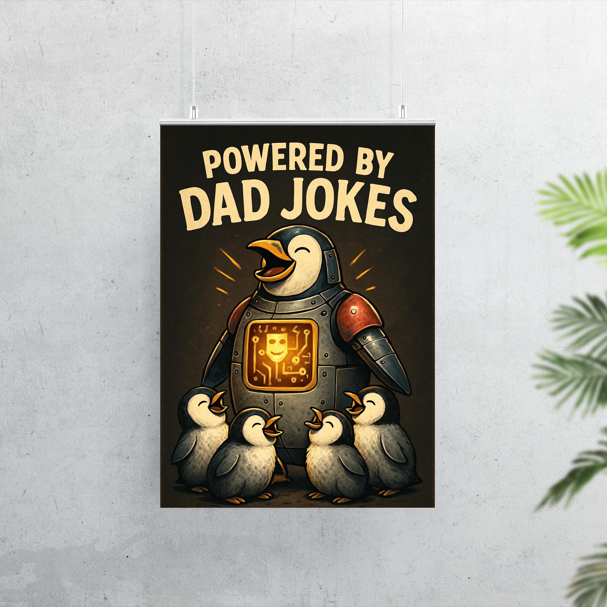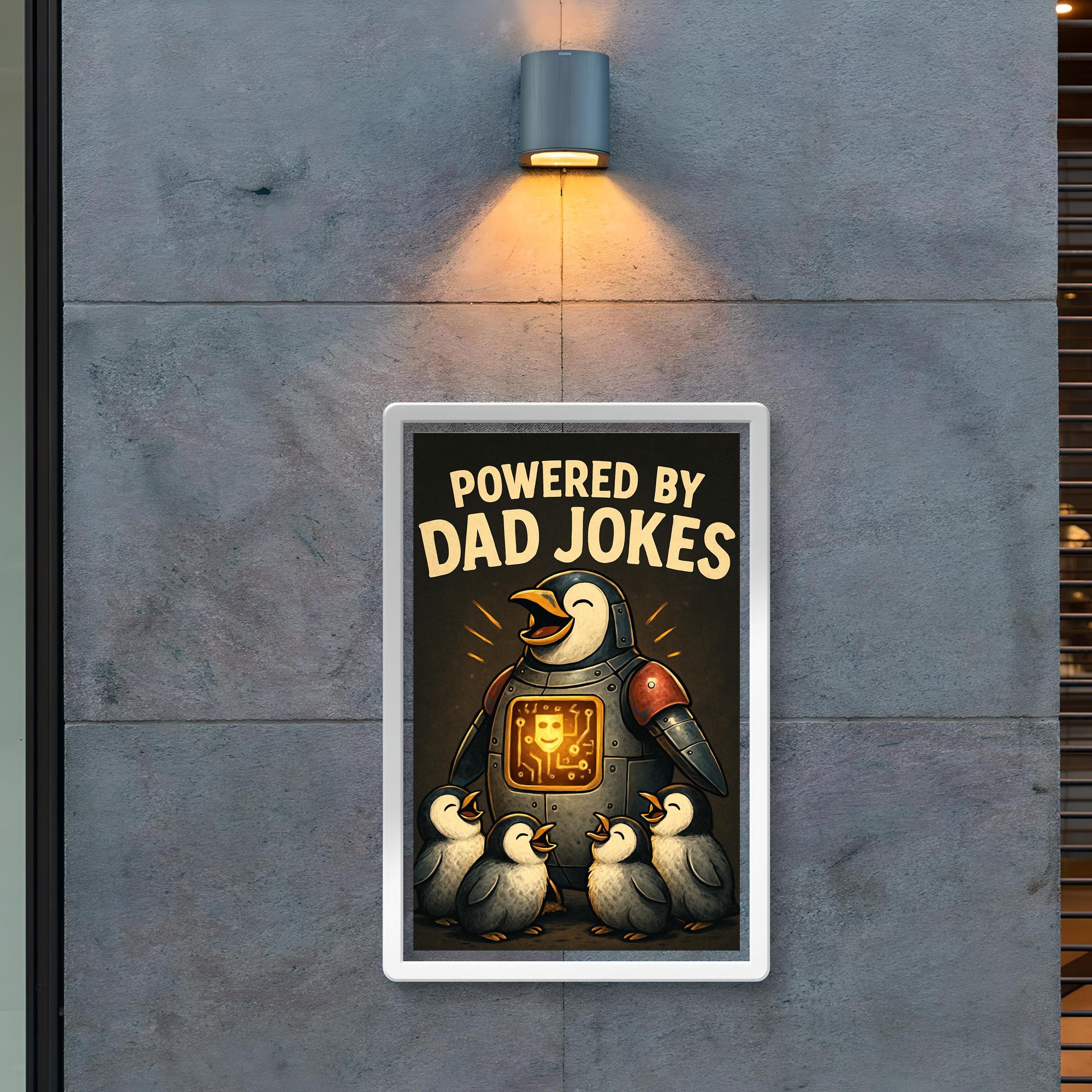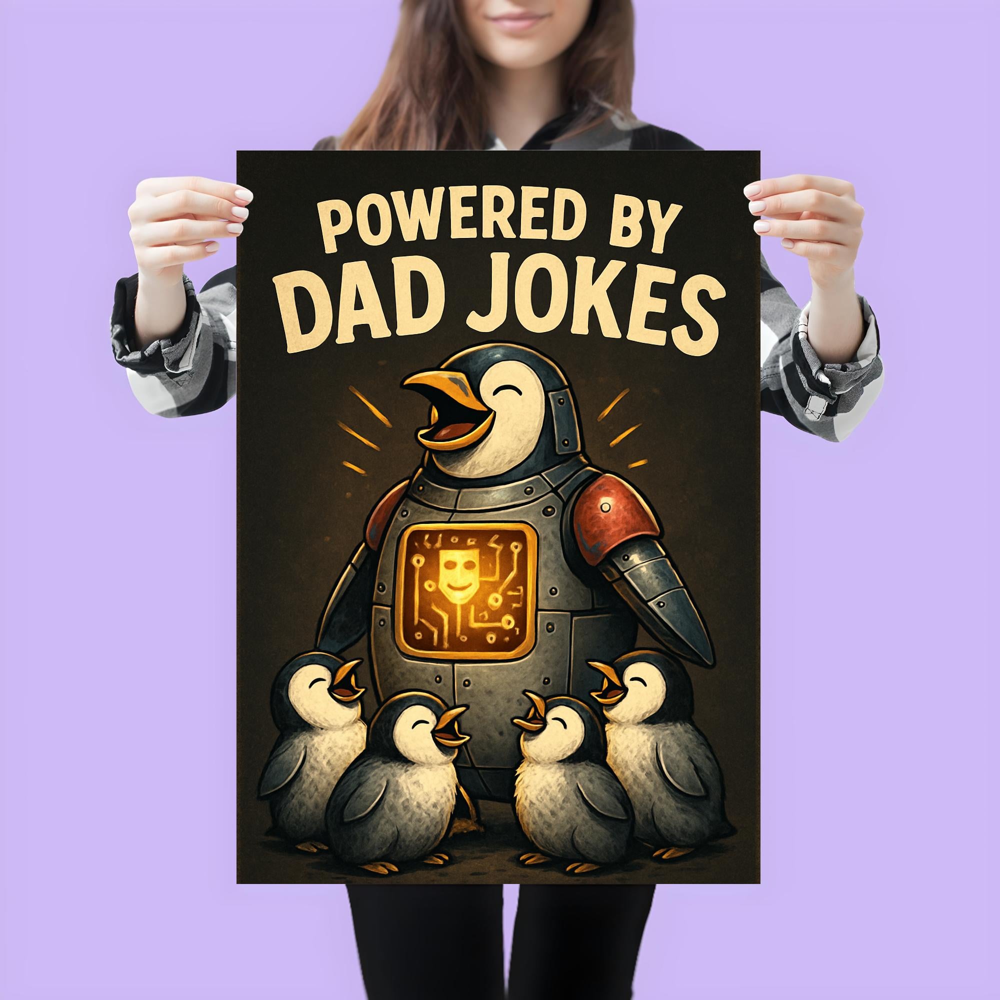 Celebrate dad’s legendary sense of humor with this hilarious "Powered by Dad Jokes" poster! Featuring a mechanical penguin wired with comedy circuits and surrounded by giggling baby penguins, it’s the perfect funny Father’s Day gift that’s sure to bring smiles and laughter to every proud dad’s wall.
