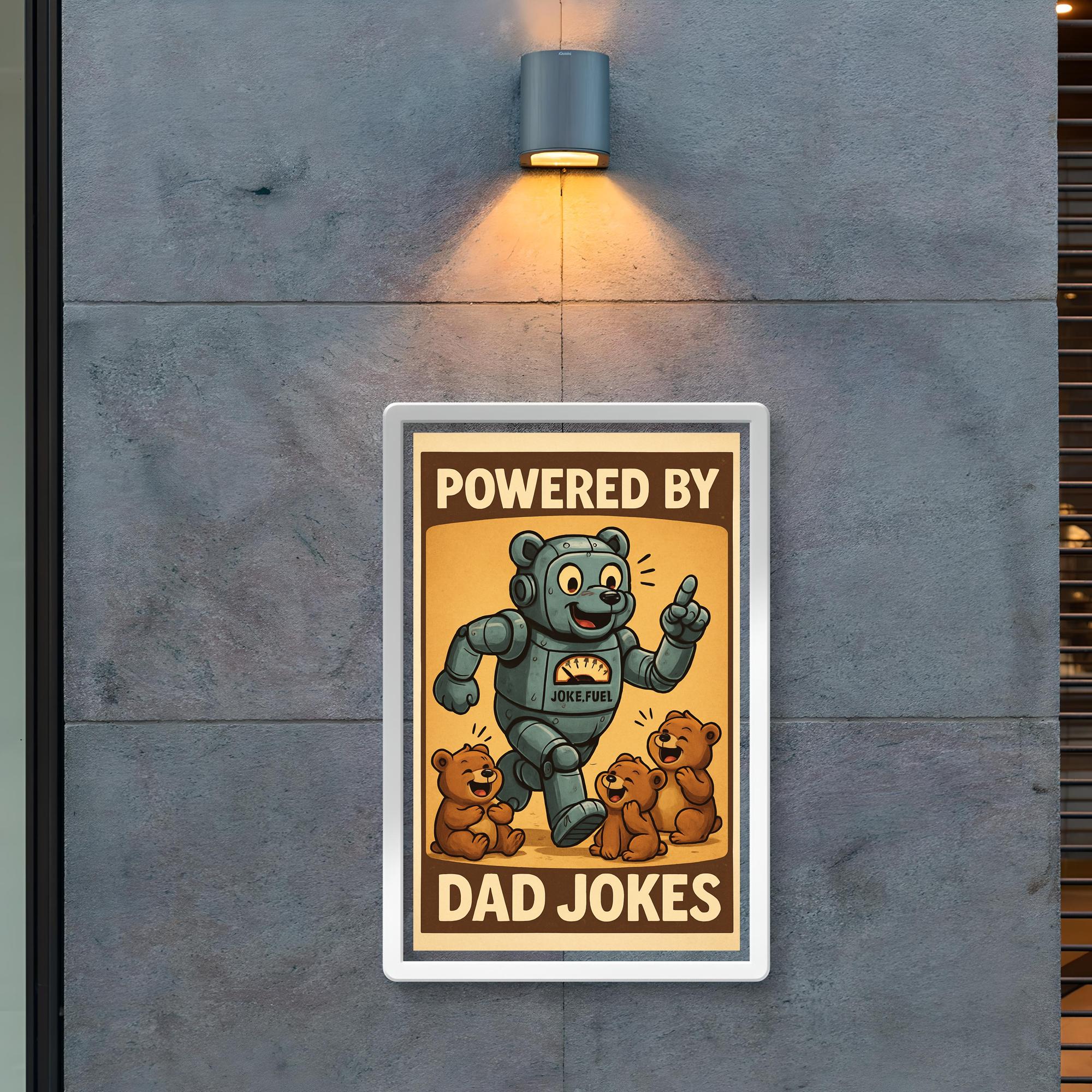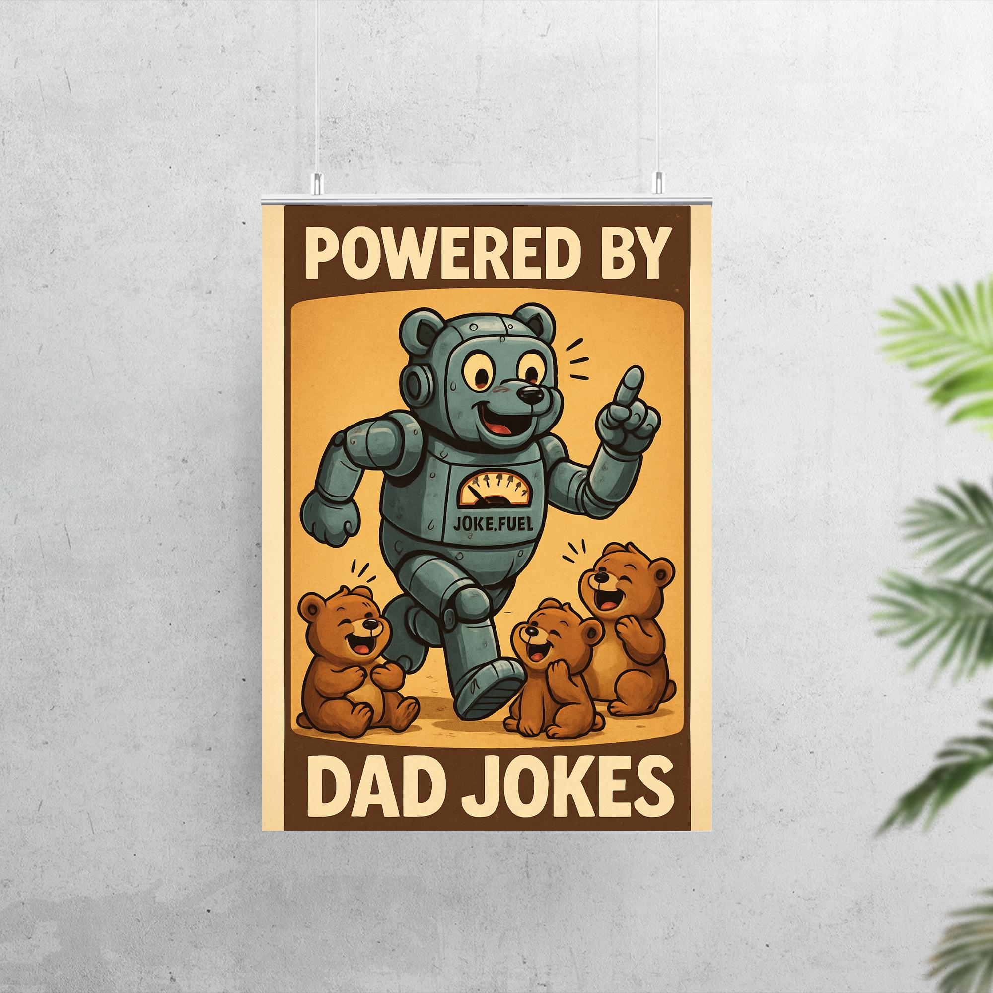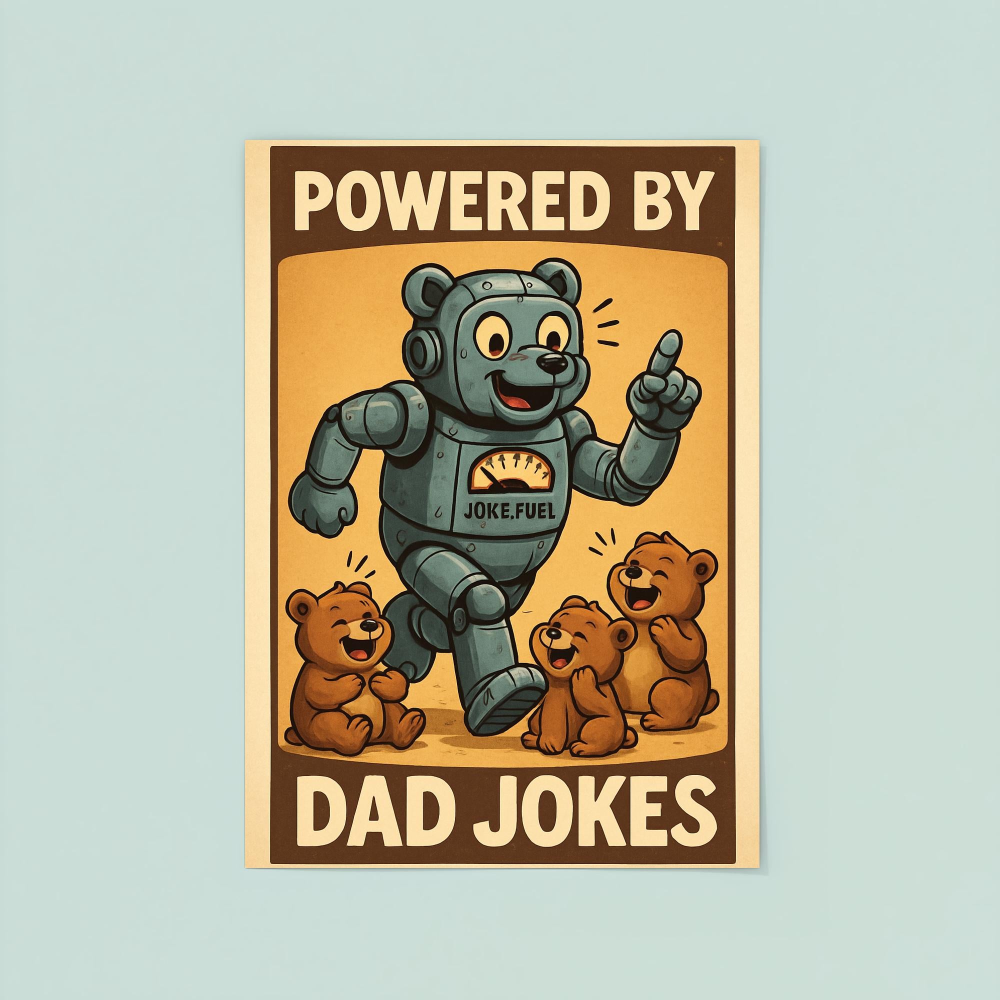 Celebrate the unbeatable dad joke energy with this hilarious "Powered by Dad Jokes" poster! Featuring a robot bear fueled by humor as it entertains its playful cubs, it's the perfect gift to bring smiles—and groans—to any proud dad this Father’s Day. Add a dose of laughter and love to your walls with a design that honors the ultimate joke machine in your life!