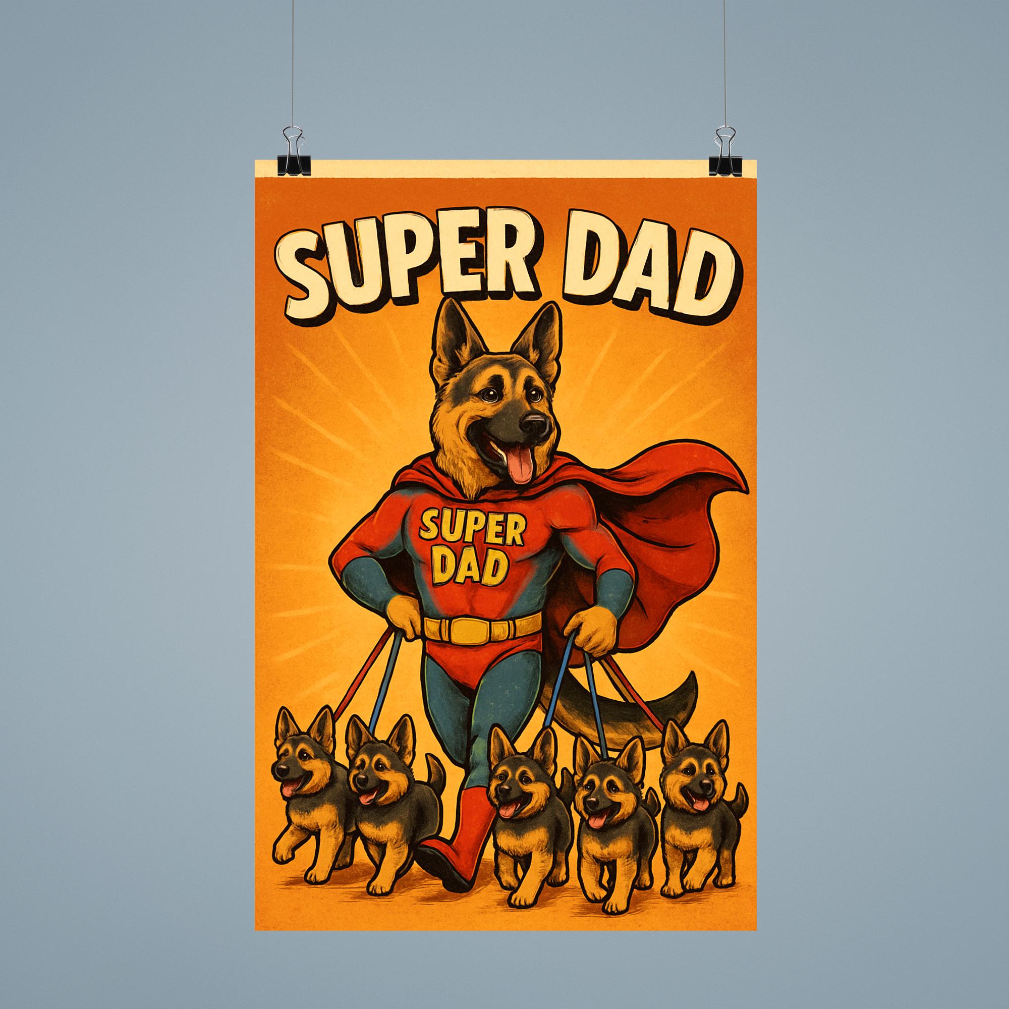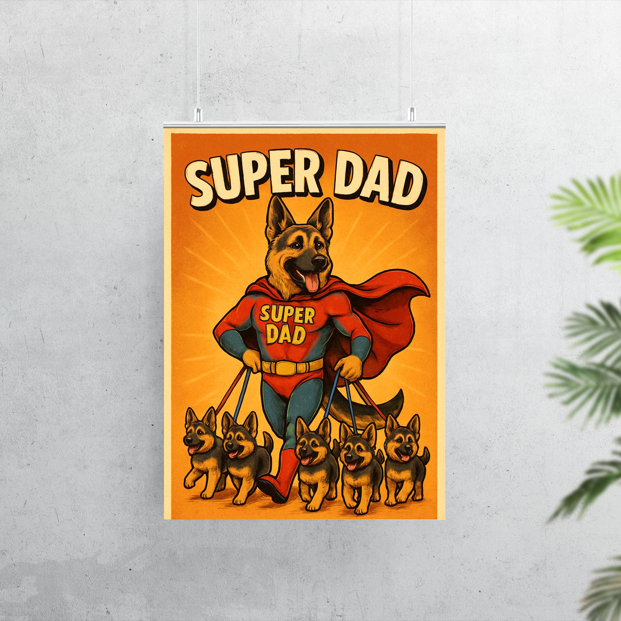 Celebrate the ultimate hero of the family with this hilarious "Super Dad" poster featuring a German Shepherd in a superhero costume confidently walking puppies on leashes. Perfect for Father’s Day, this charming and funny design highlights the strength, loyalty, and love every dad brings to his pack. A playful tribute that’s sure to bring smiles and warm hearts!