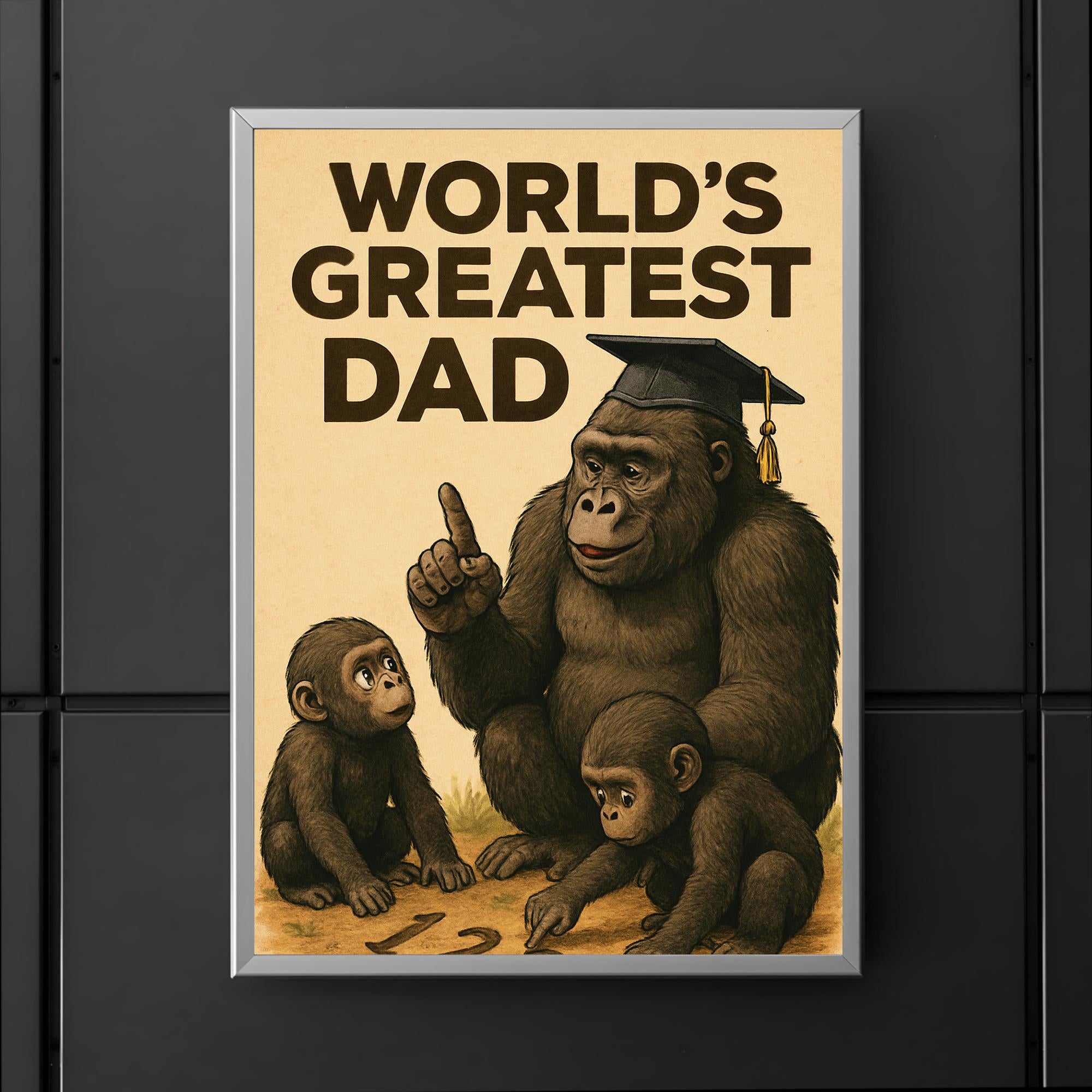 Celebrate the world’s greatest dad with this delightfully funny Father’s Day poster! Featuring a proud gorilla in a graduation cap teaching baby gorillas to count, it’s the perfect way to honor Dad’s wisdom and humor. A charming tribute that’s sure to bring smiles and laughter to any dad’s special day.