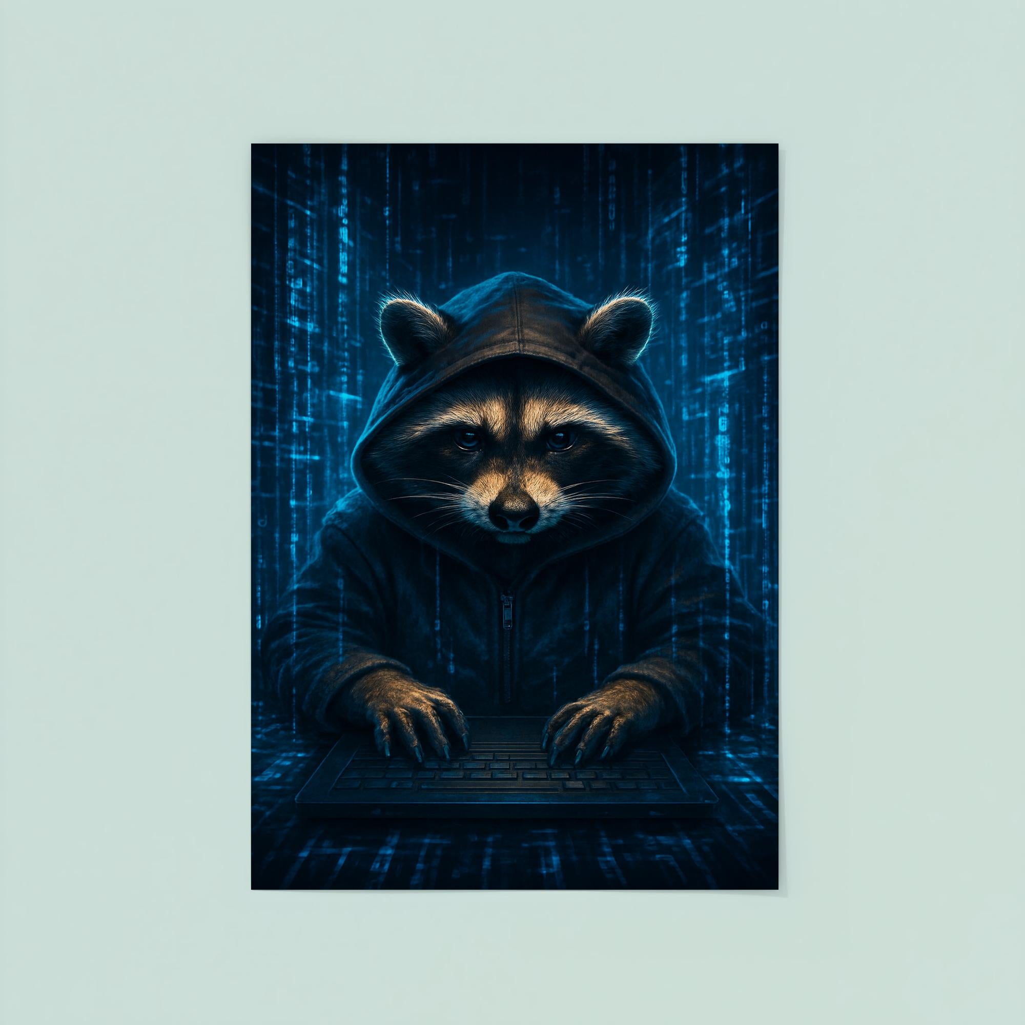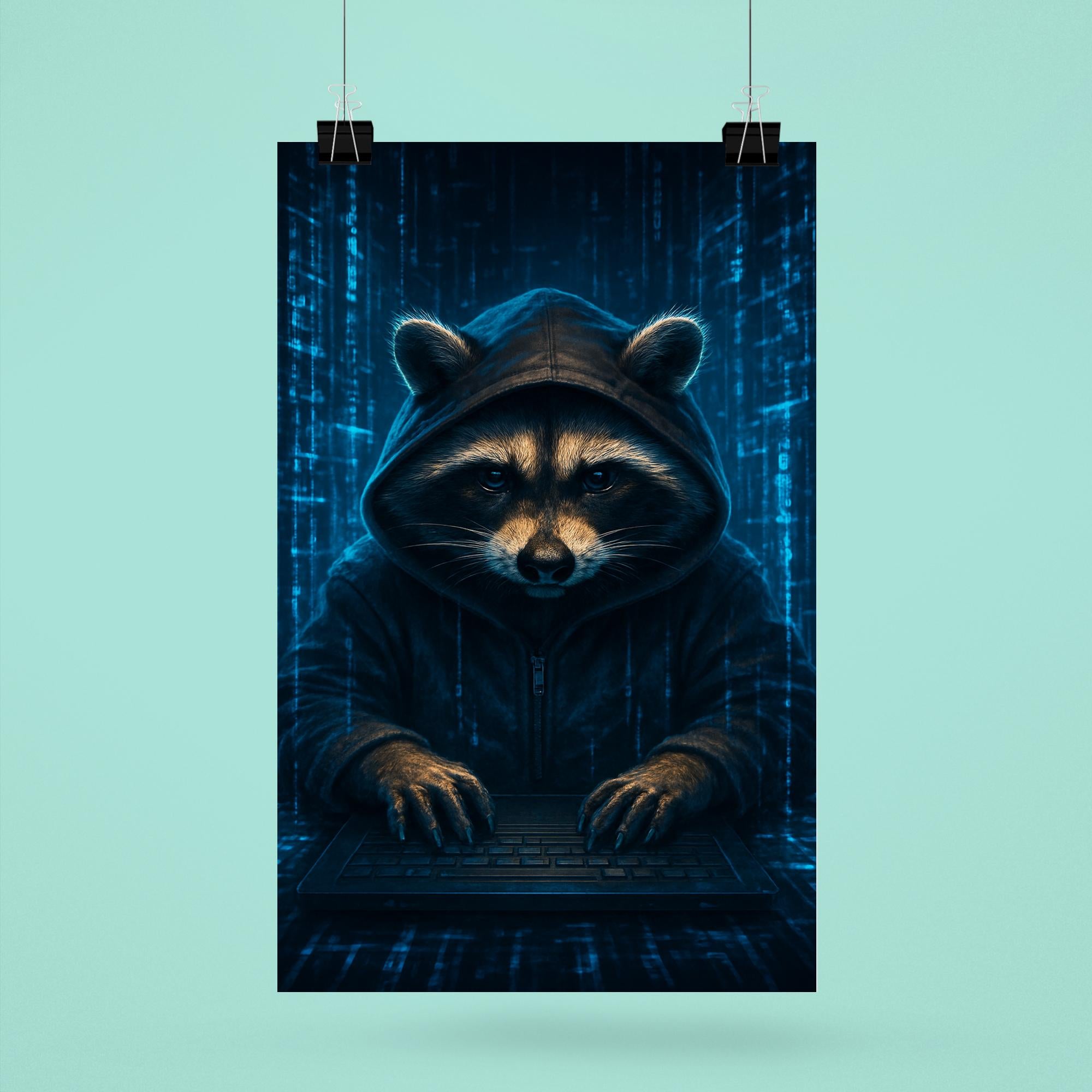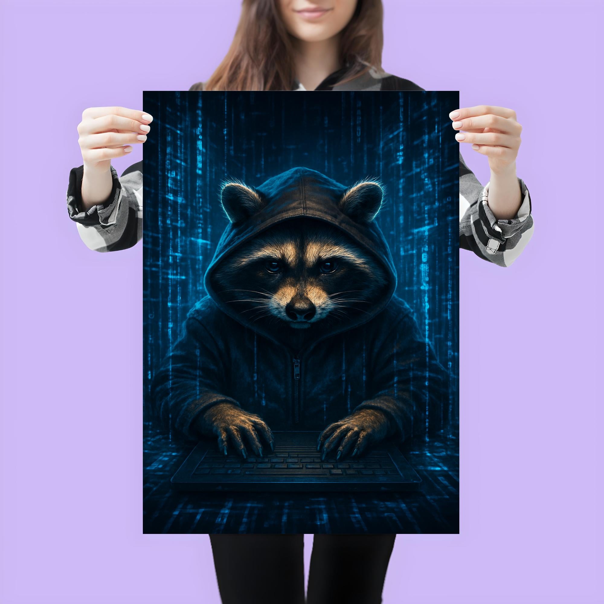 Unleash your inner tech rebel with this striking poster featuring a raccoon hacker immersed in swirling holographic code streams. Perfect for anyone who loves a blend of clever mischief and cyber intrigue, this artwork electrifies any space with its bold, futuristic vibe. Whether in a workspace or gaming den, it’s a captivating tribute to the art of digital stealth and innovation.